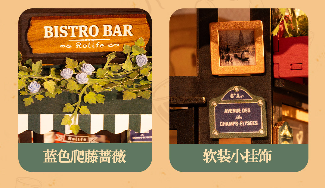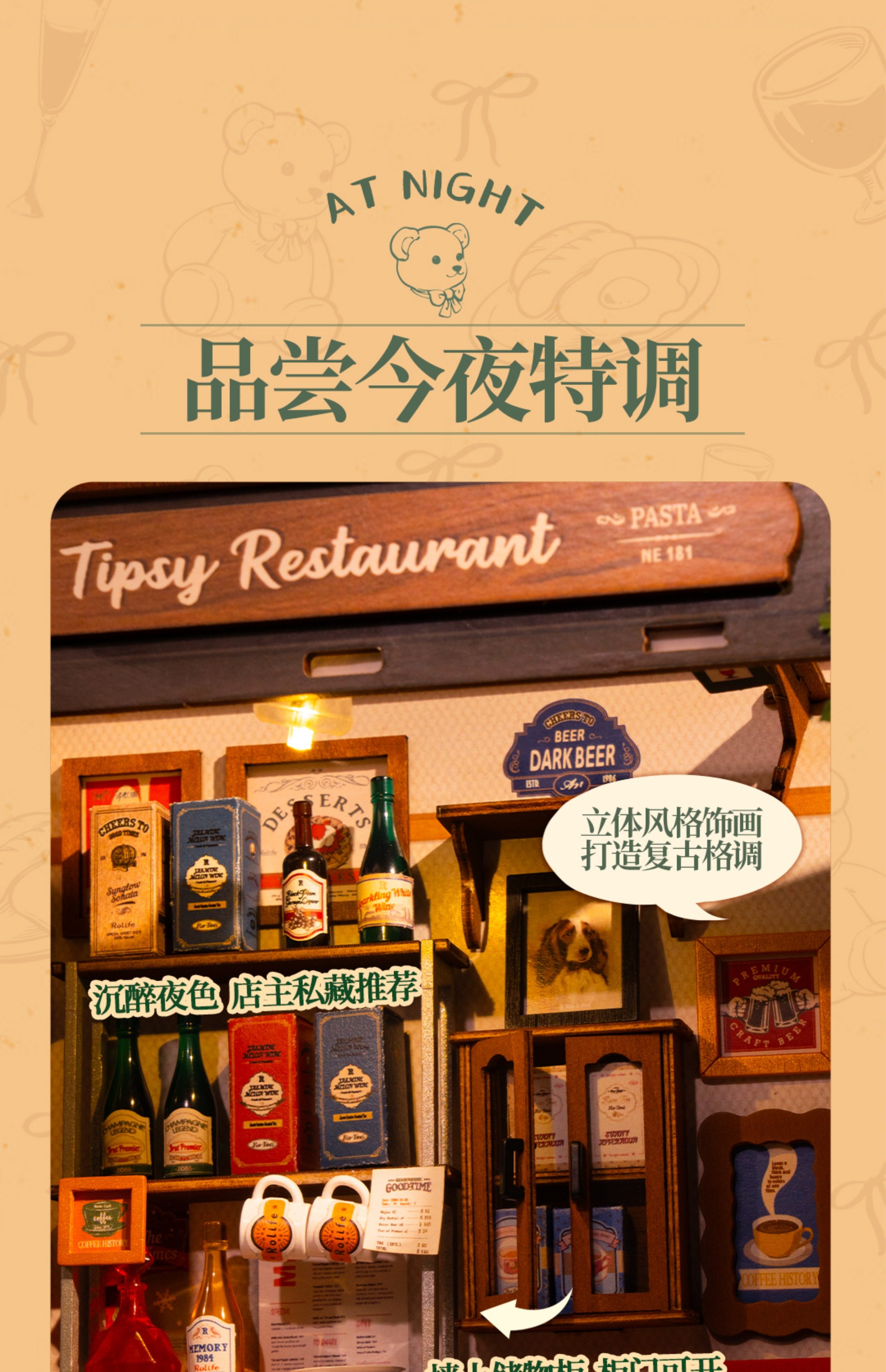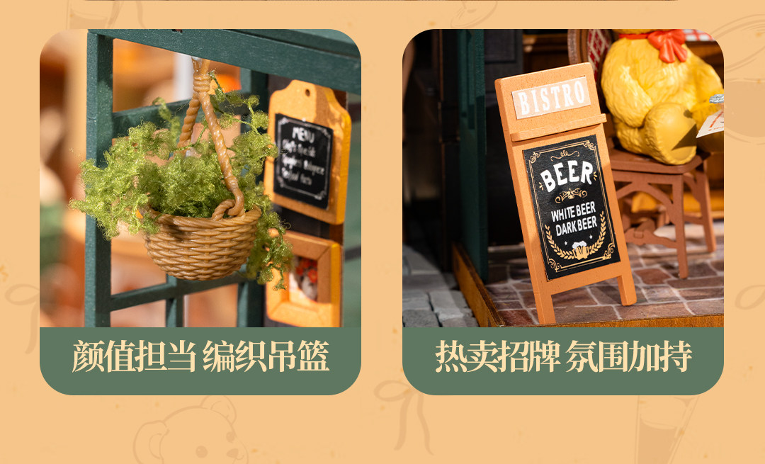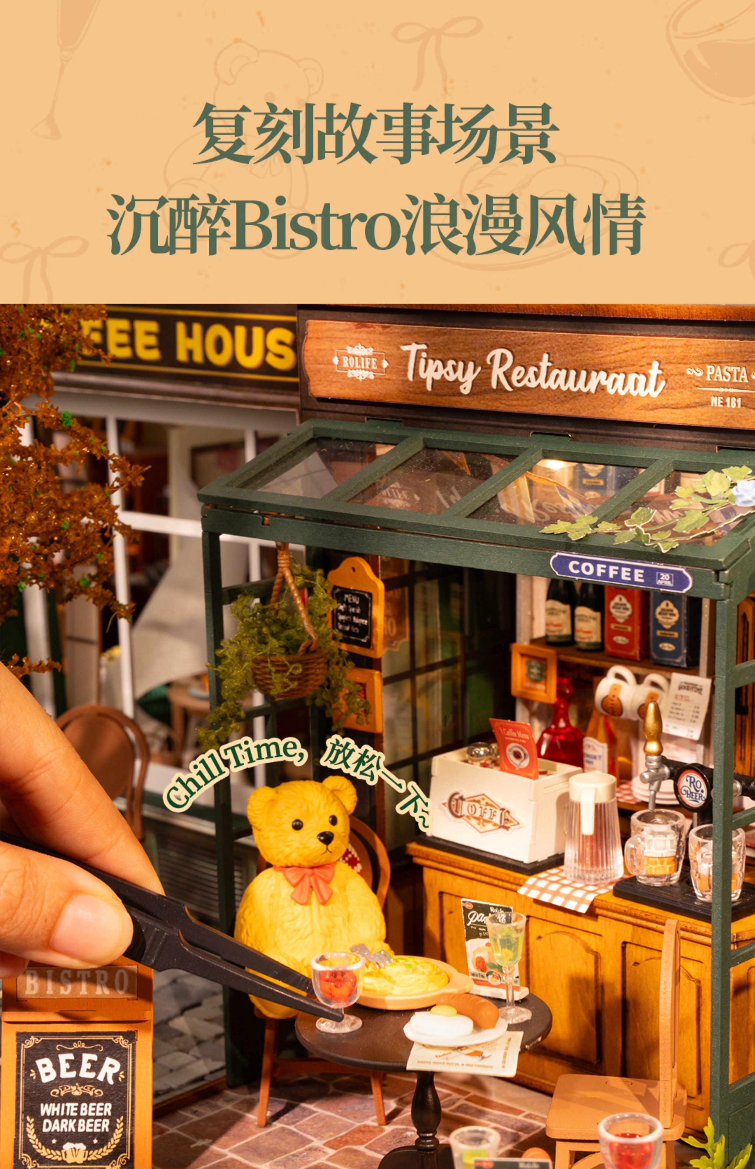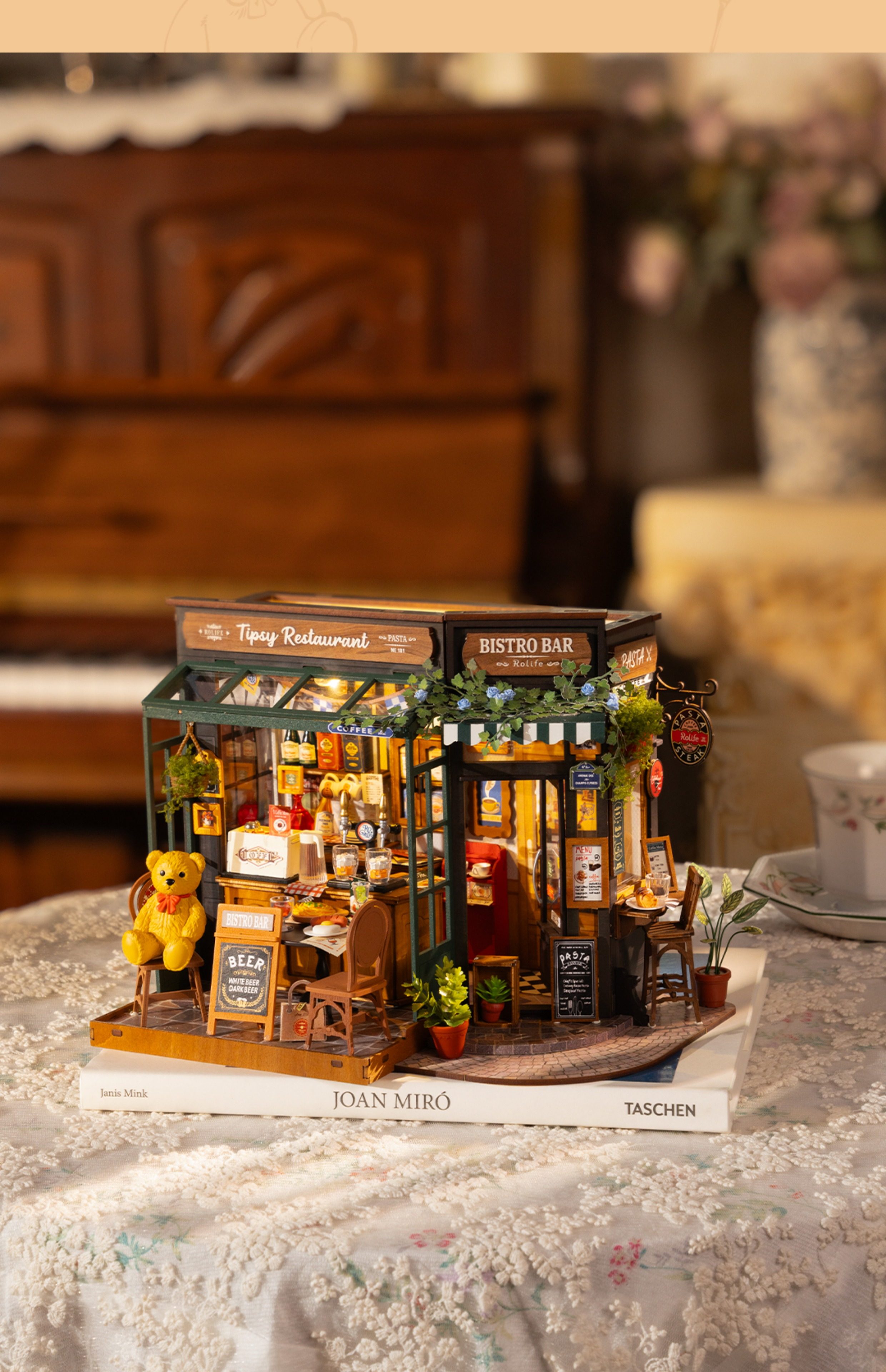 Rollife Ruo Lai Bear Dining Bar Cabaña hecha a mano de bricolaje Modelo de miniatura Casa de juguete ensamblado Bloques de construcción Chica