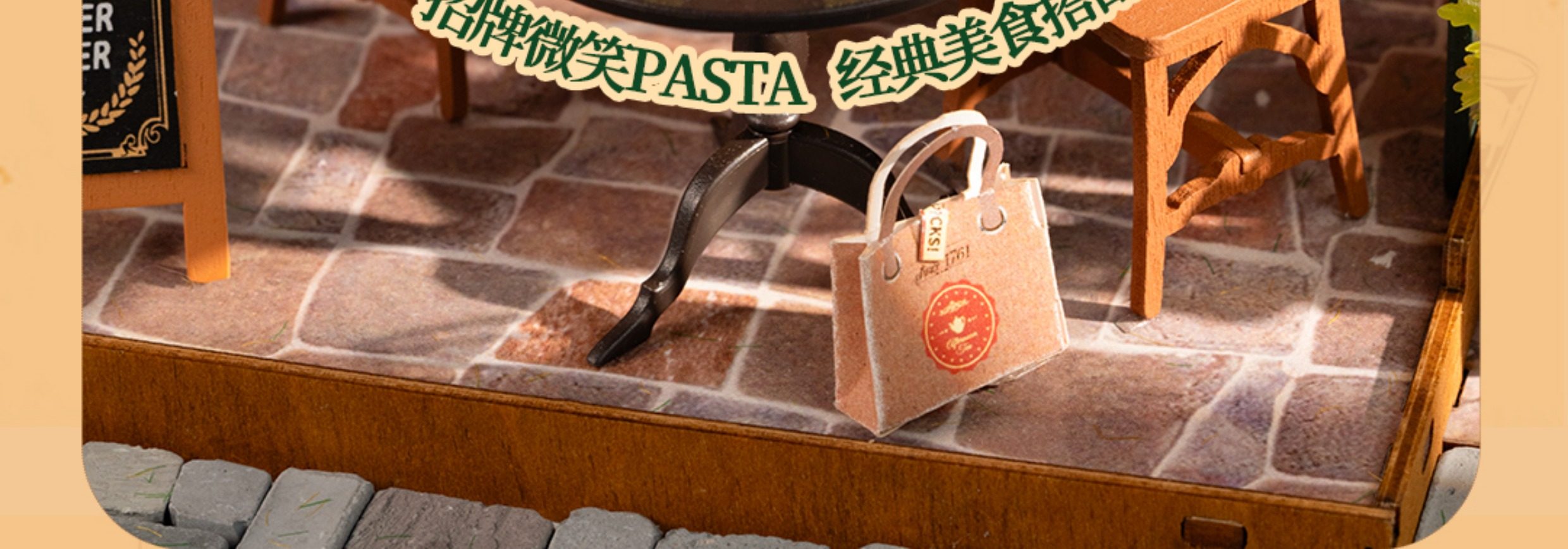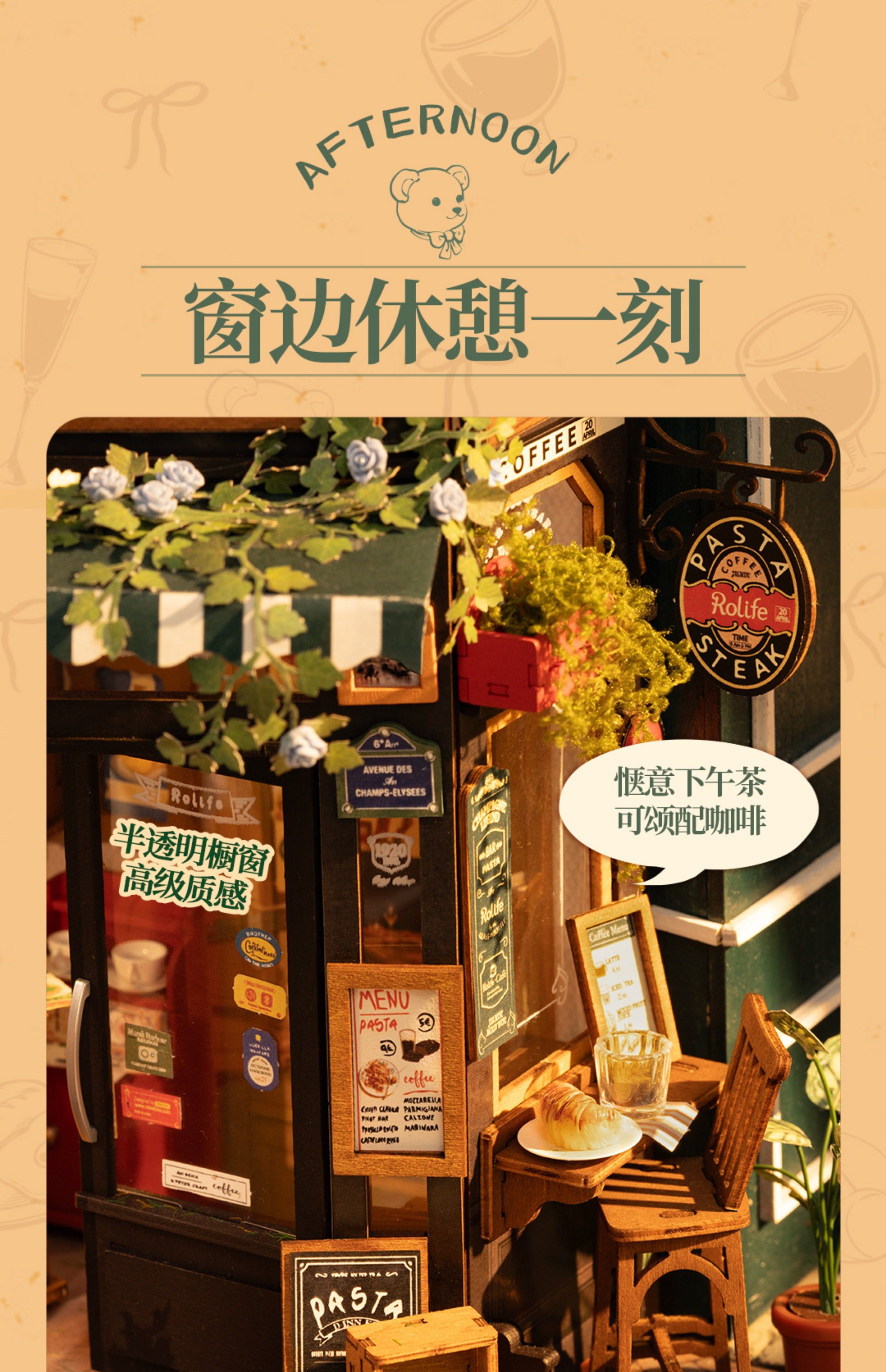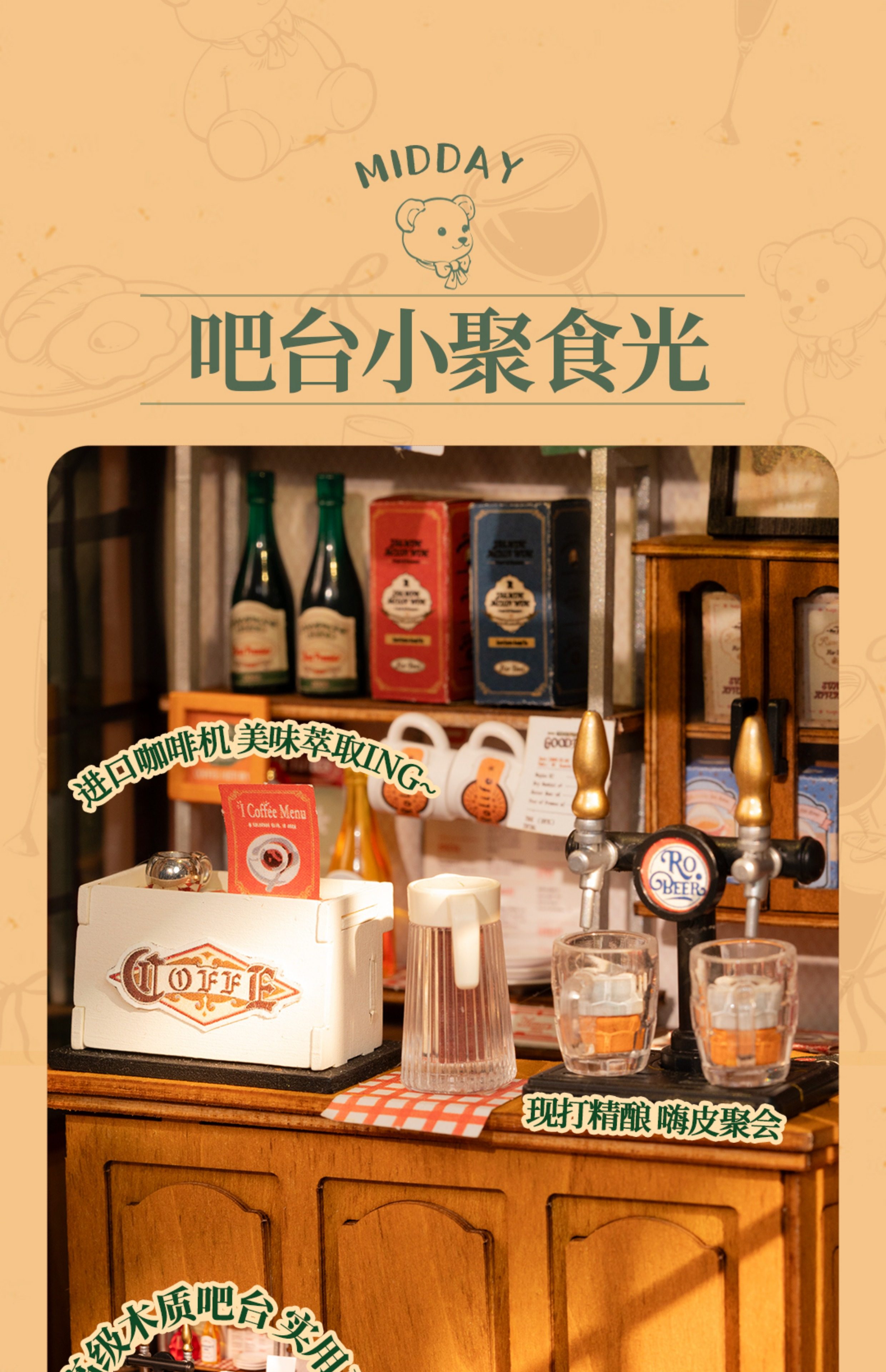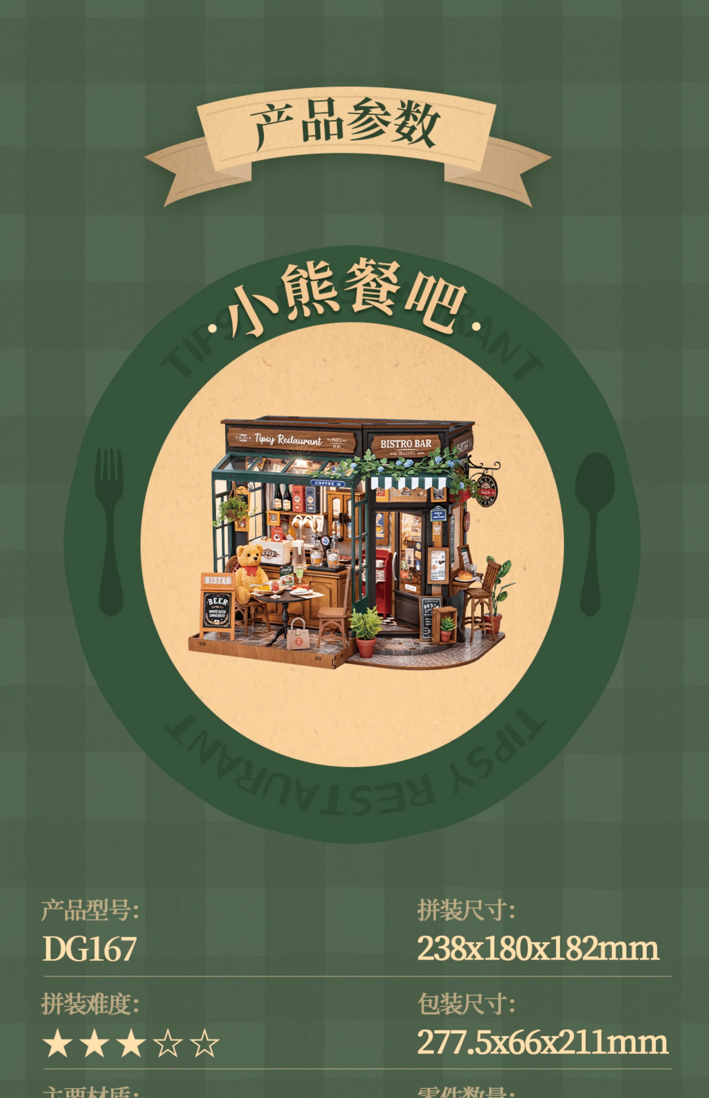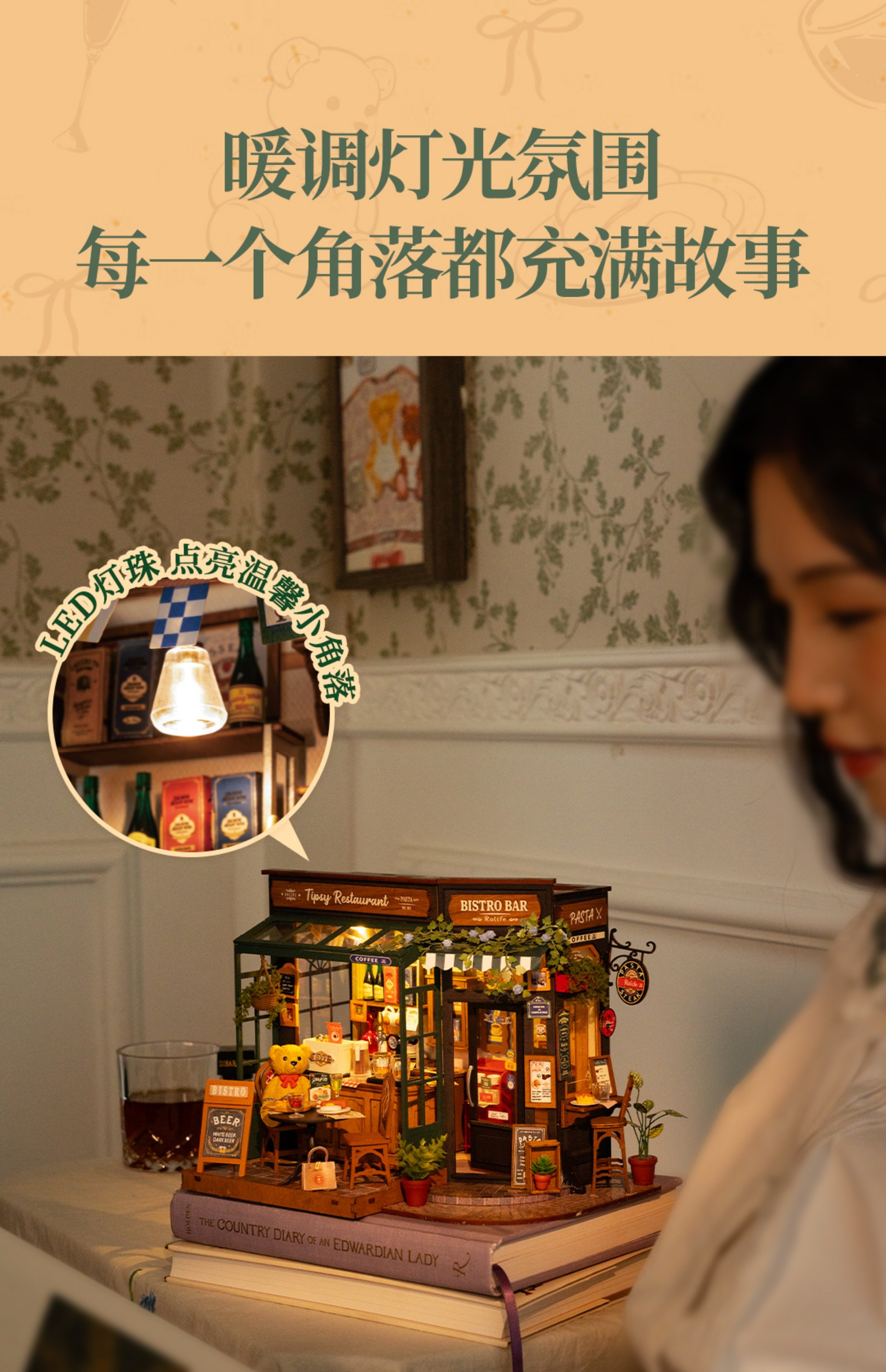 Rollife Ruo Lai Bear Dining Bar Cabaña hecha a mano de bricolaje Modelo de miniatura Casa de juguete ensamblado Bloques de construcción Chica