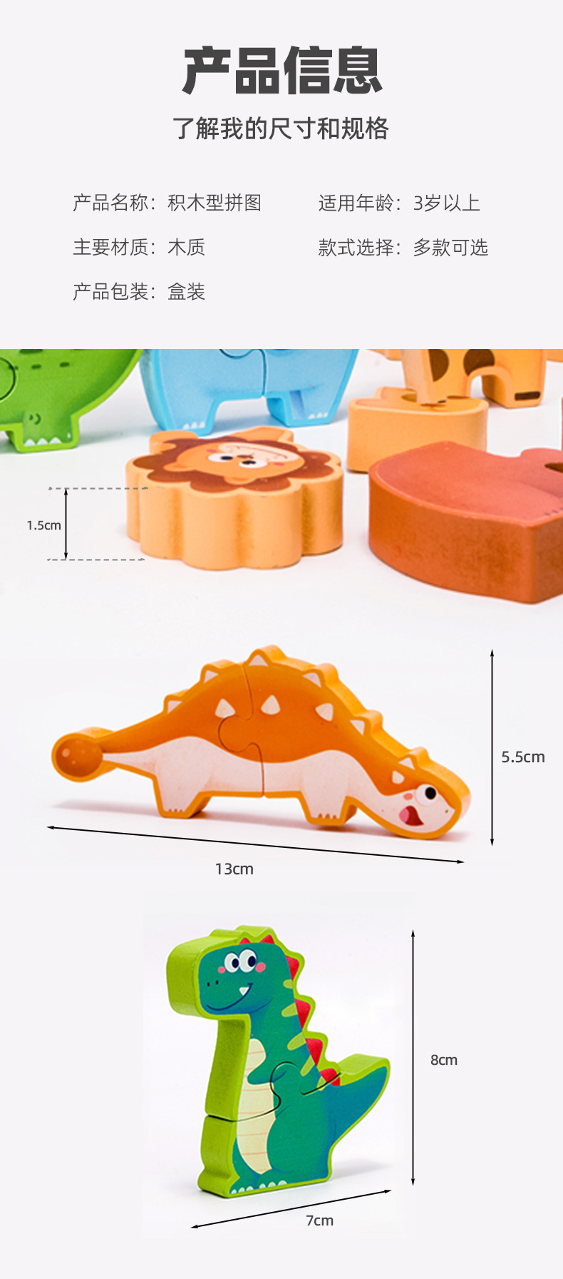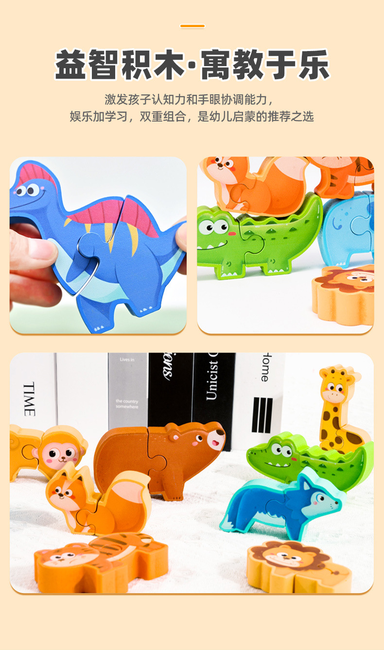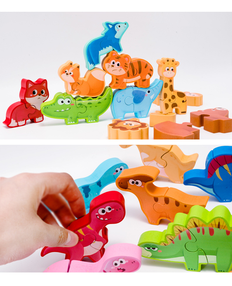 Weiwei Tiger Animal Dinosaurio Apilamiento de madera Rompecabezas 3D Desarrollo tridimensional Educación temprana Juguetes prácticos para bebés y niños pequeños