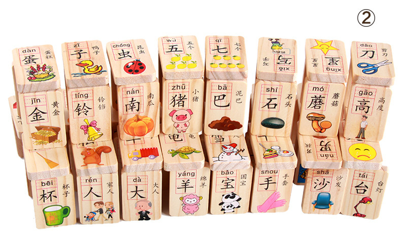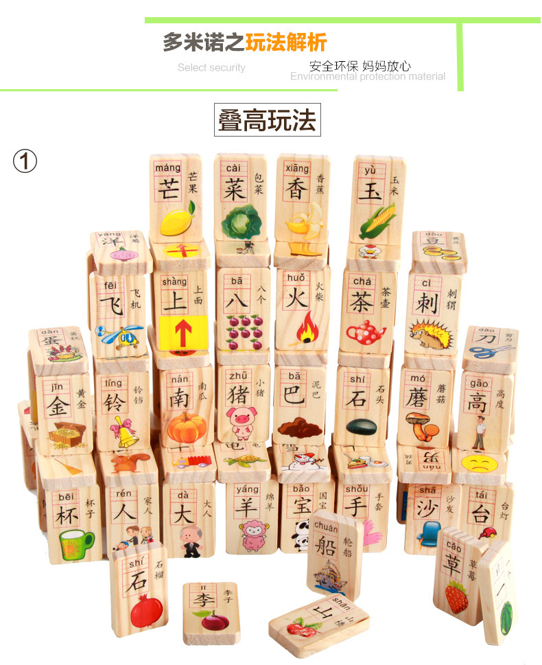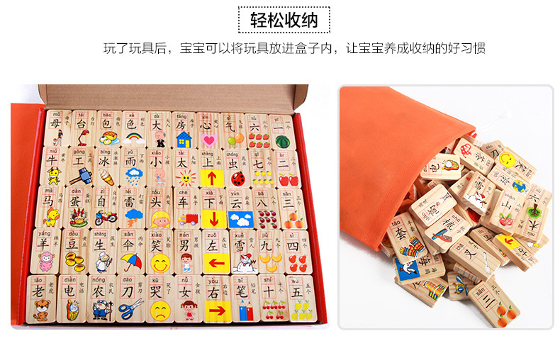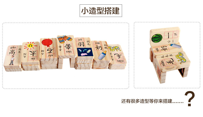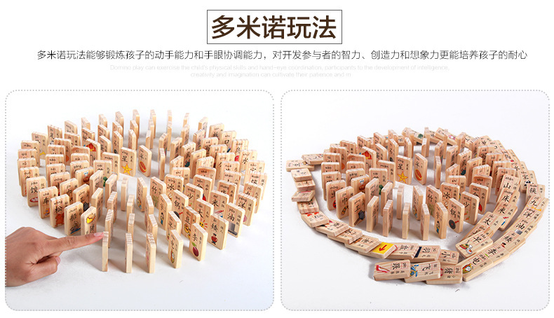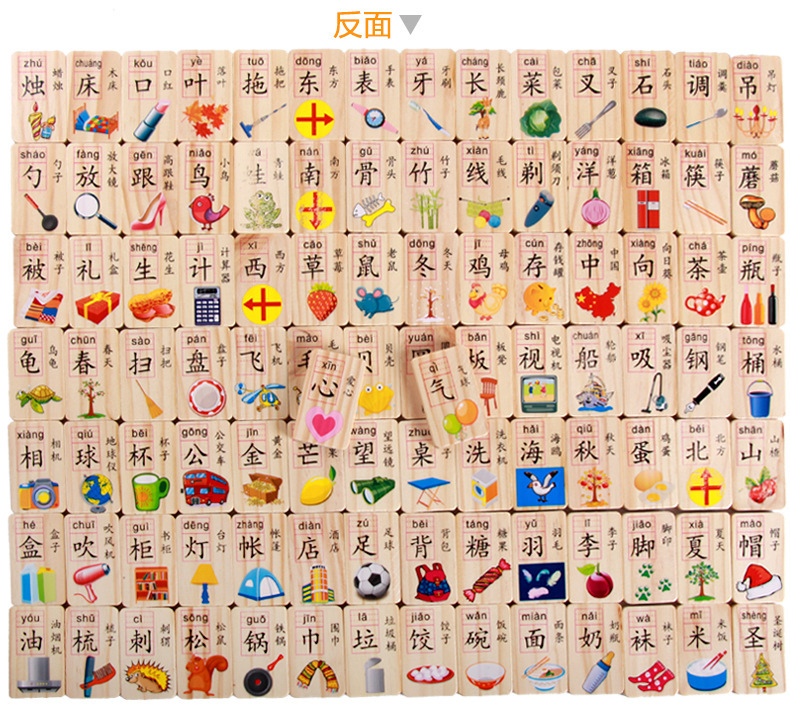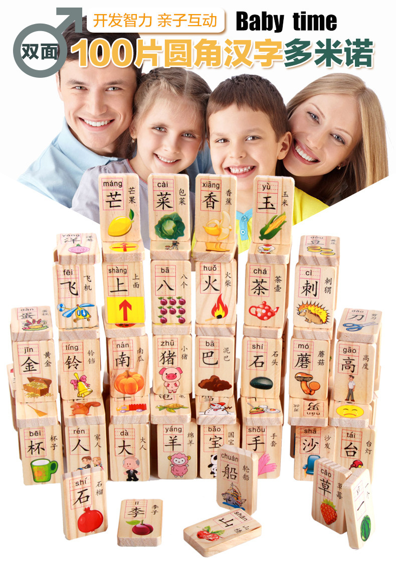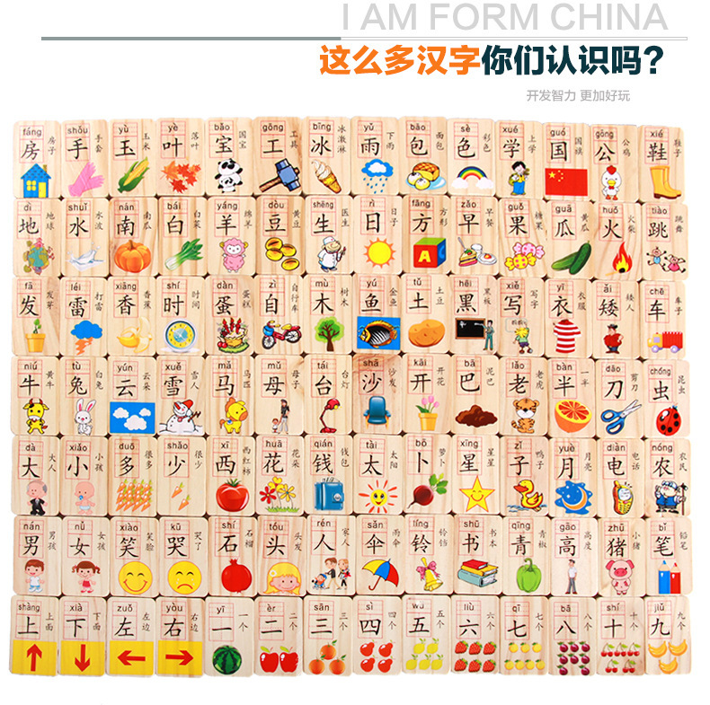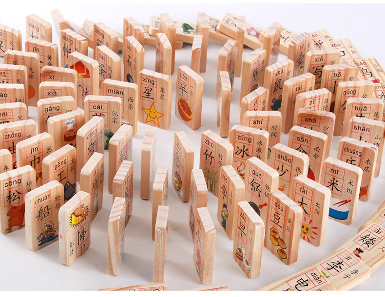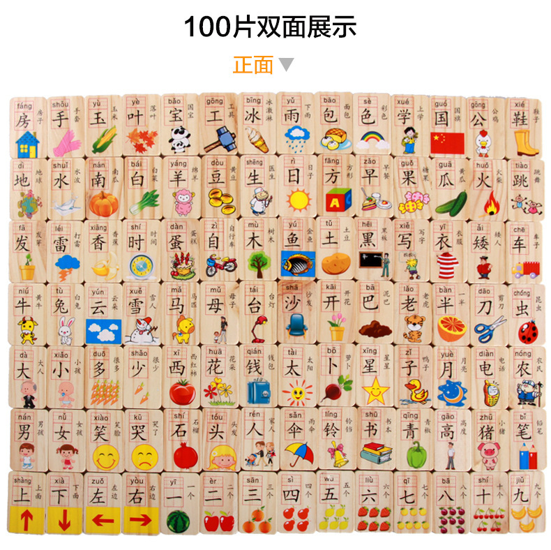 Educación infantil Educación temprana de madera de 100 piezas de doble cara Carácter chino Dominó Alfabetización juguete cognitivo