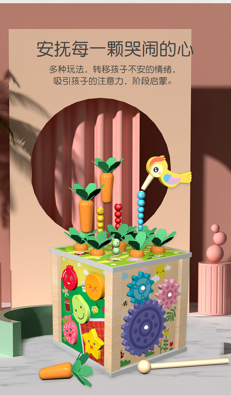 Multifuncional de madera seis en uno cofre del tesoro rábano tirando de insectos forma de captura de música a juego tocando piano juguetes para niños