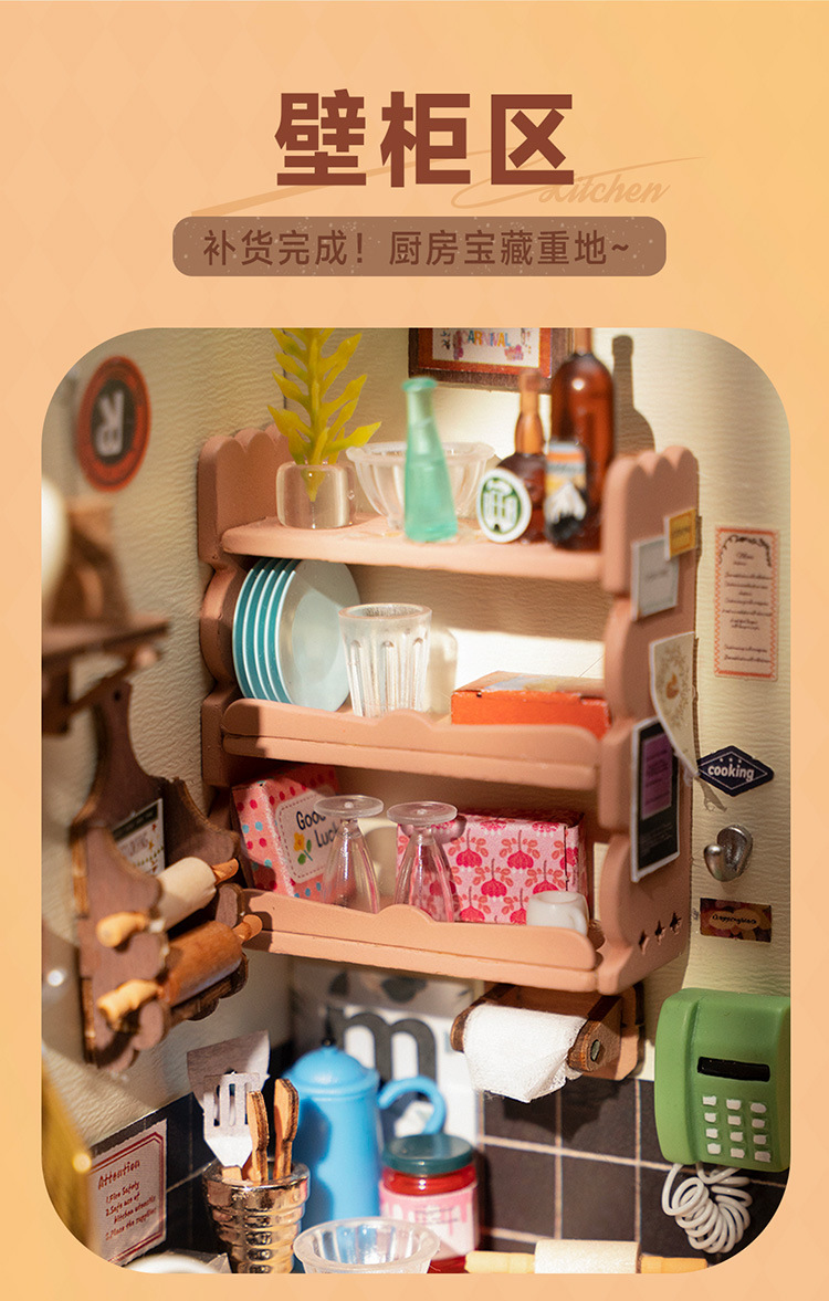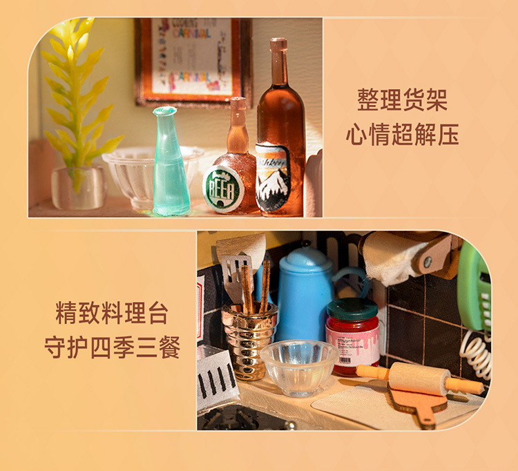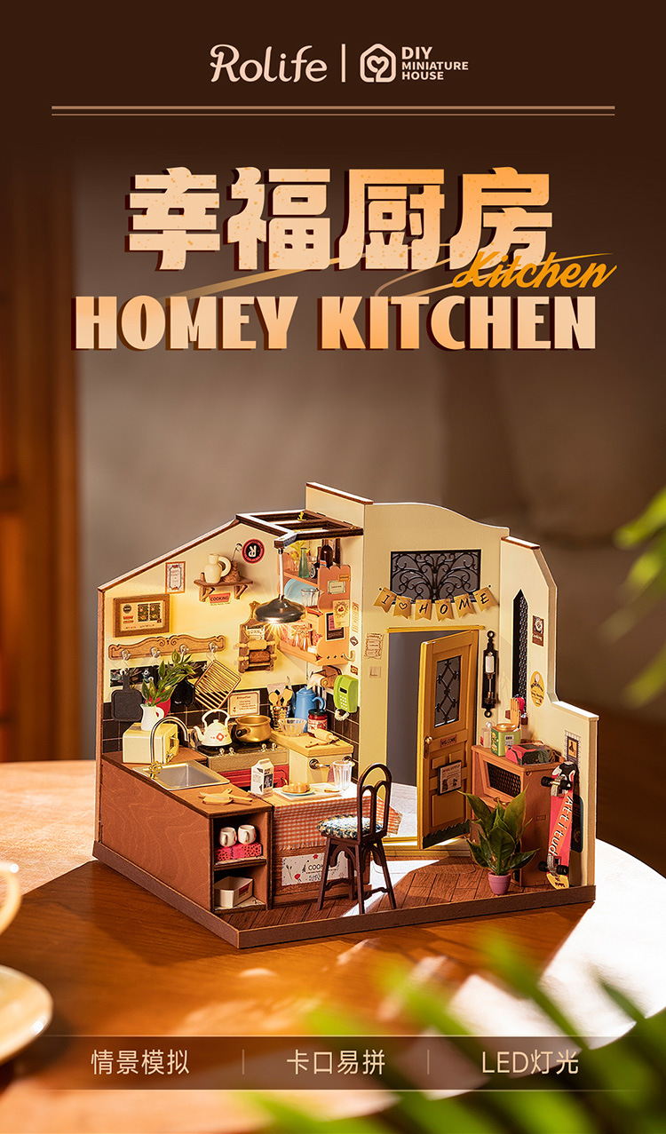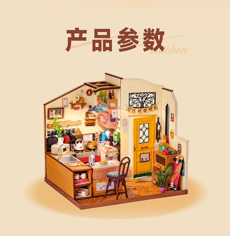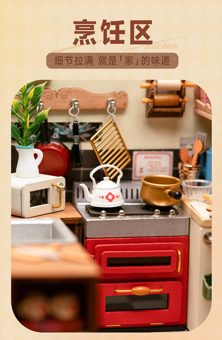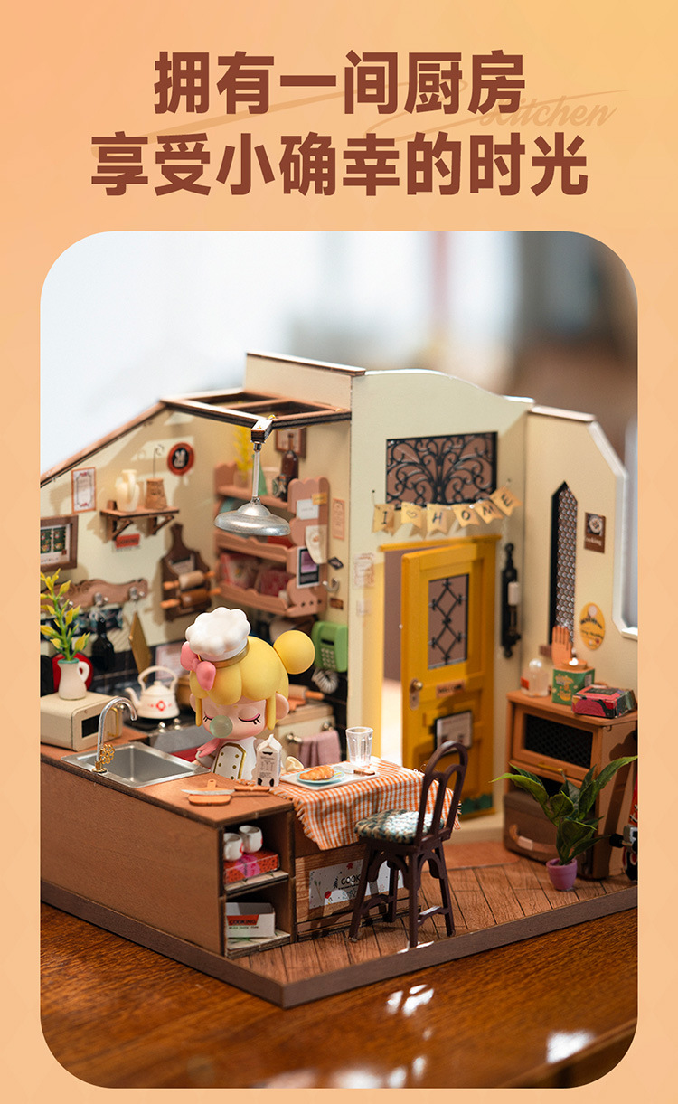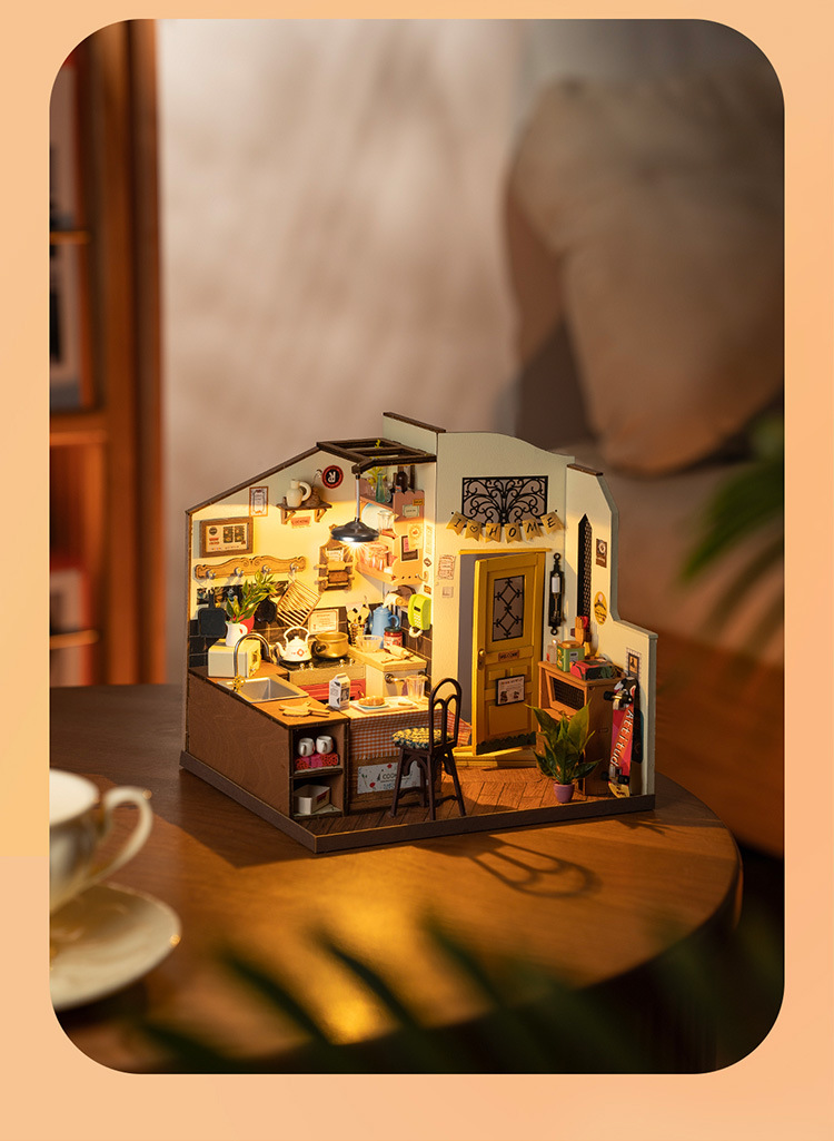 Ruolai DIY cabaña feliz cocina miniatura pequeña casa creativa ensamblada a mano modelo de casa de muñecas juguete niños