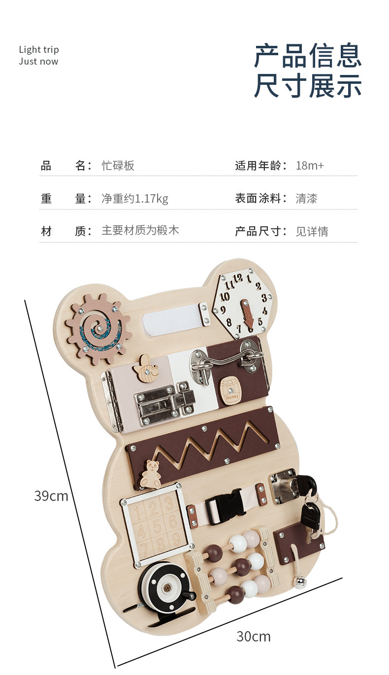 | Colores | Tablero de actividades Oso de madera en bruto 1.8kg,Tablero ocupado de oso gris 1.8kg,Tablero ocupado de oso marrón 1.5kg,Panda blanco y negro 1.5kg,Tablero ocupado de oso de doble cara 1.3kg,Oso azul 1.5kg,Desbloquear juguete ocupado tablero 0.3kg,Desbloqueo de cuerda marina 0,45 kg,Placa ocupada plegable 1kg,Placa ocupada de oruga 0,75 kg,Tablero de actividades con pestillo de puerta, 1.2 kg. |