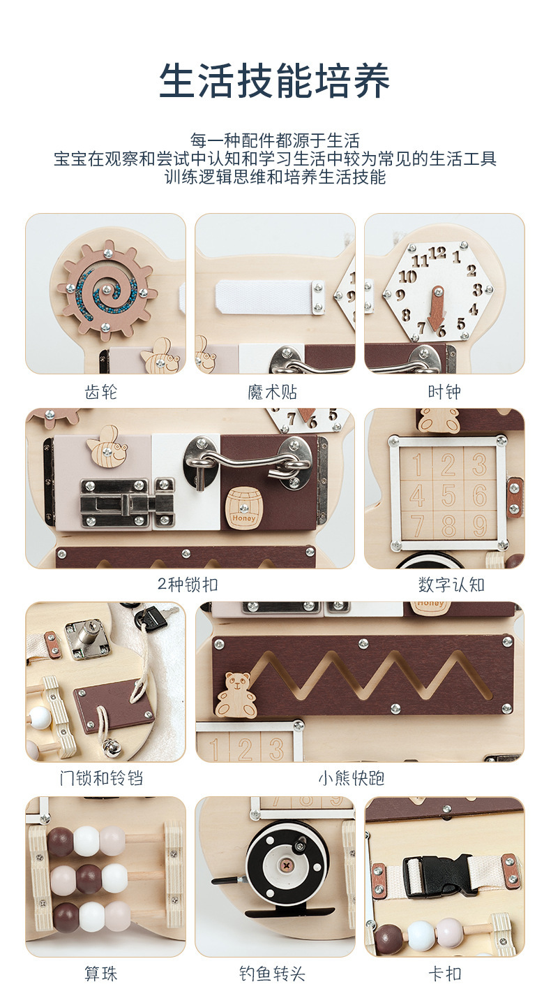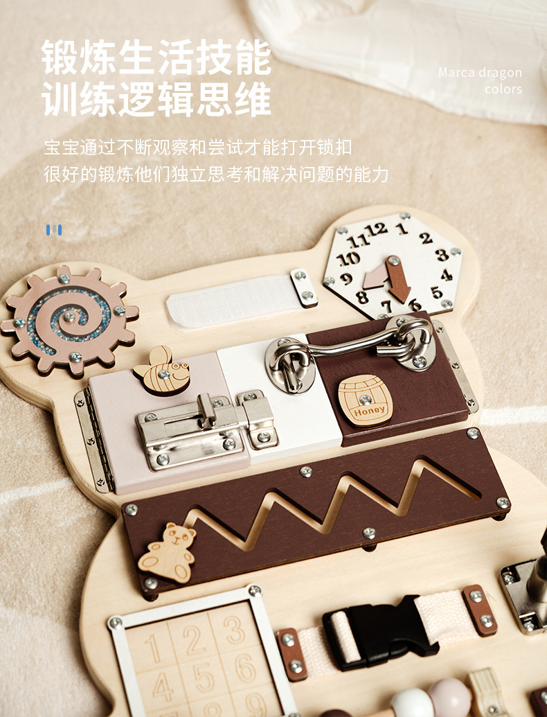 Amazon Wood Bear Tablero ocupado Niños Montessori Juego de pared Abra la puerta Tablero de desbloqueo Juguetes educativos