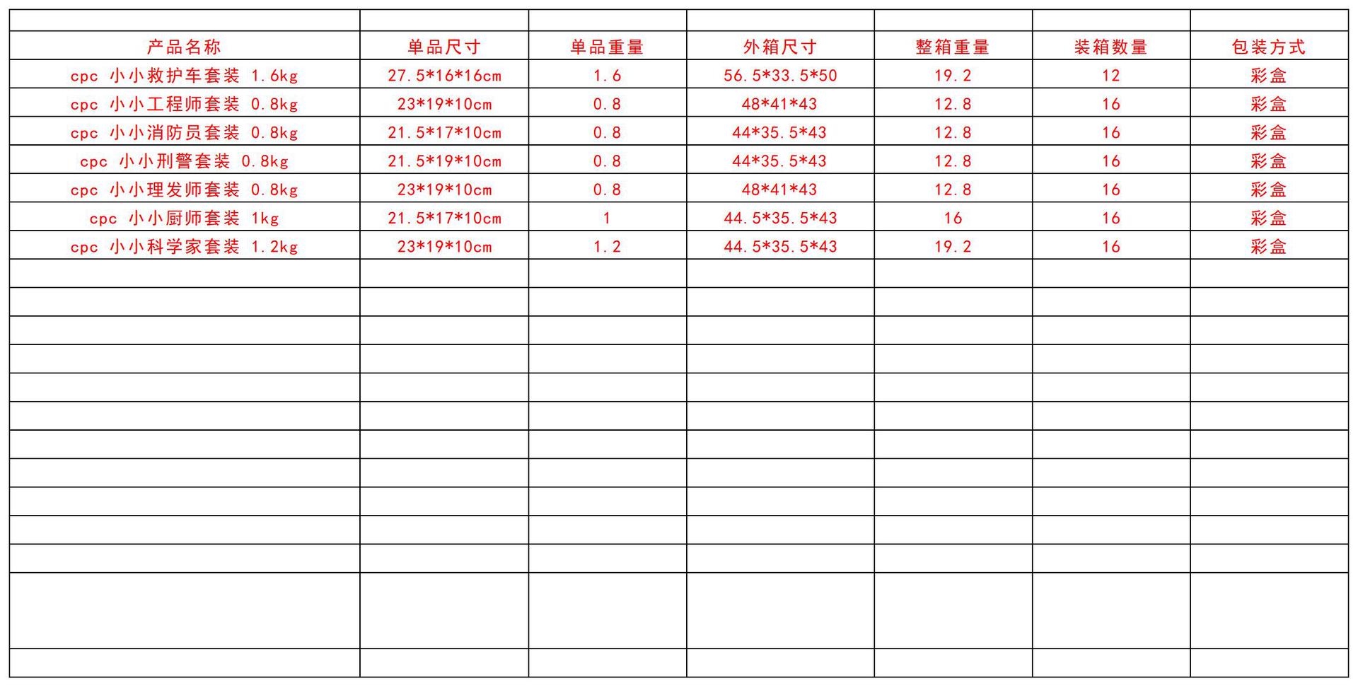 | Colores | Cpc pequeño traje de ambulancia 1.6kg,Cpc pequeño ingeniero conjunto 0,8 kg,Cpc juego de bombero pequeño 0,8 kg,Cpc pequeño juego de peluquero 0.6kg,Cpc Little Chef Set 1kg,Cpc Little Scientist 1.2kg |