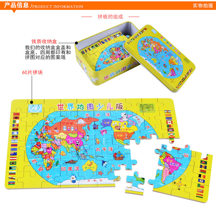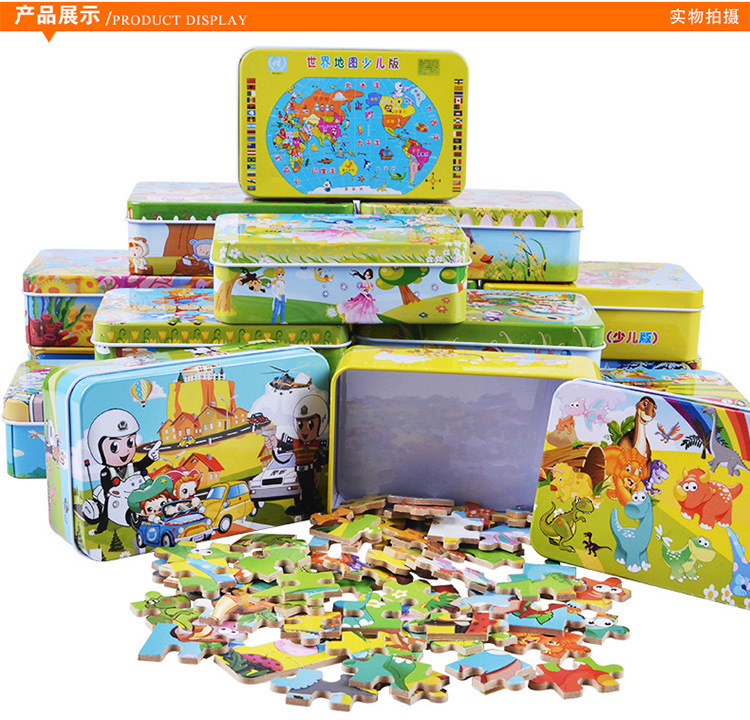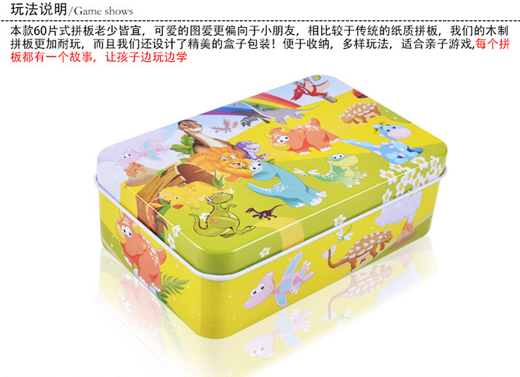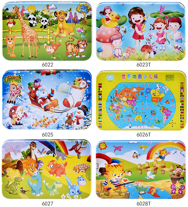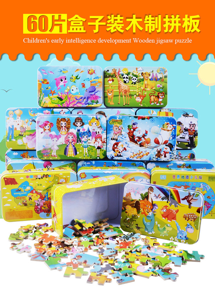 Niños de madera 60-pieza caja de hierro rompecabezas de madera de dibujos animados rompecabezas plano educación temprana juguetes educativos Kindergarten Regalos