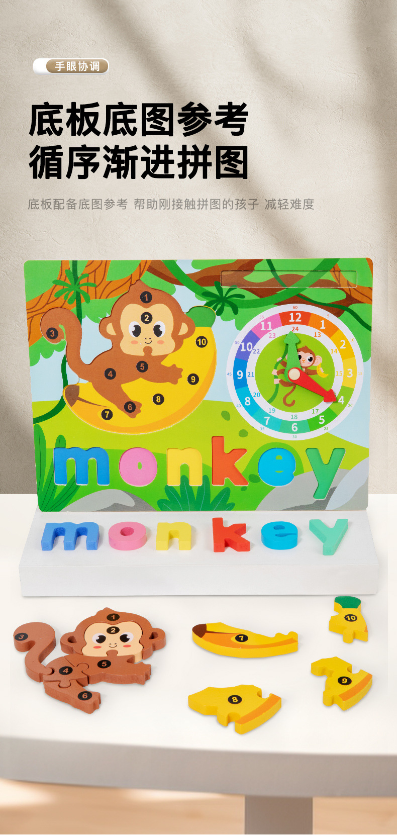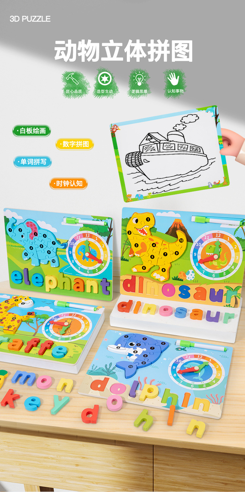 Certificado CE transfronterizo personalizado jardín de infantes educación temprana animales ortografía de palabras en inglés rompecabezas reloj material didáctico tablero de dibujo