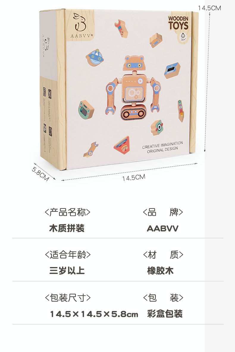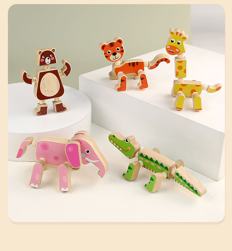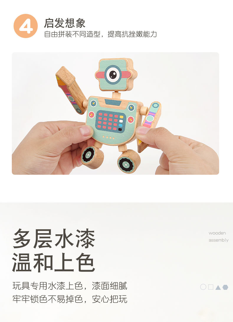Los niños ensamblan una variedad de robots de madera, bricolaje creativo, bloques de construcción tridimensionales de madera, juguetes de coordinación mano-ojo