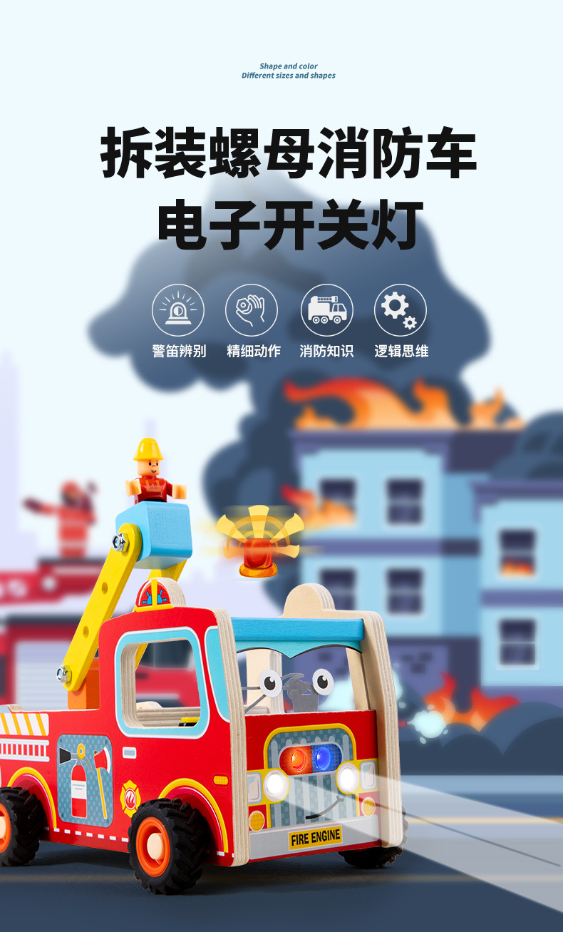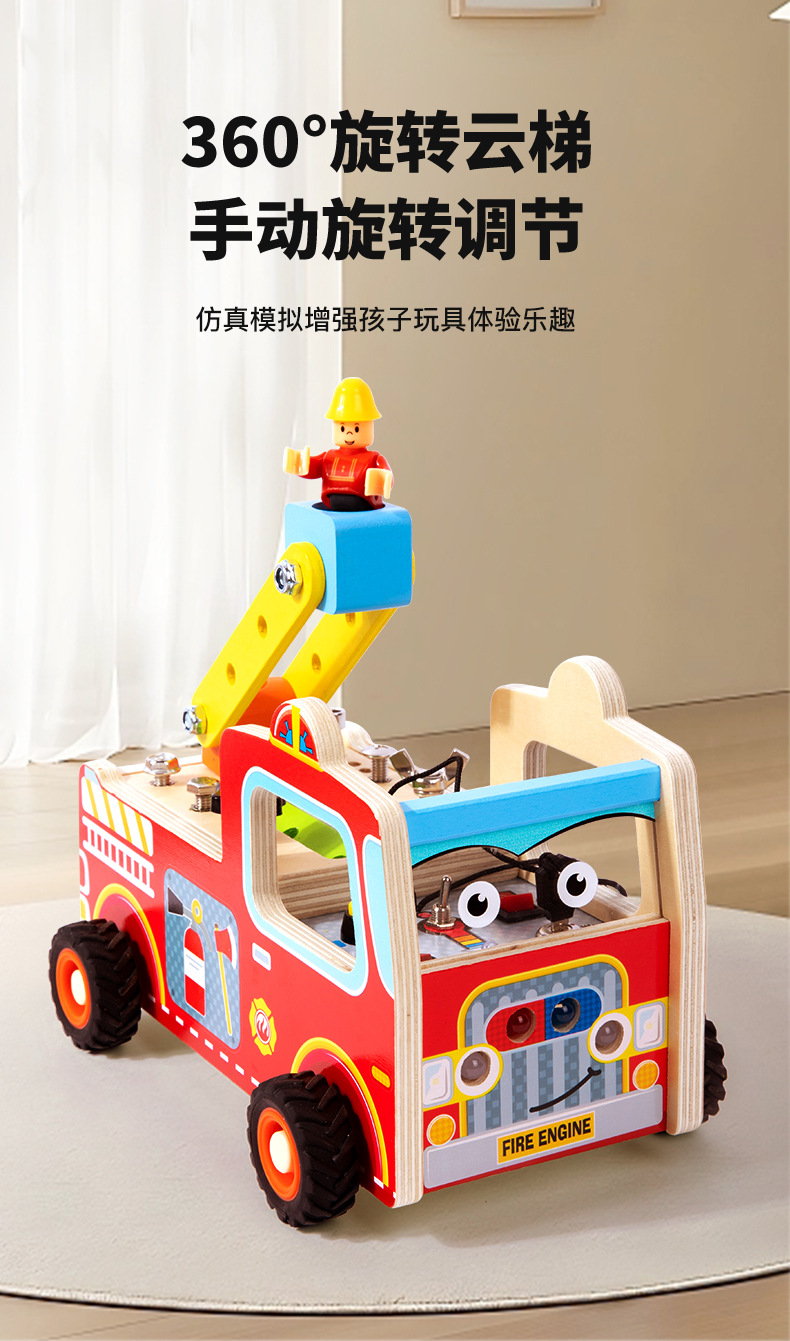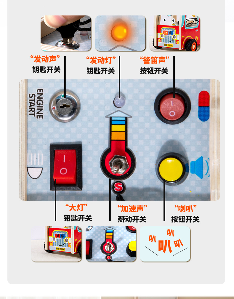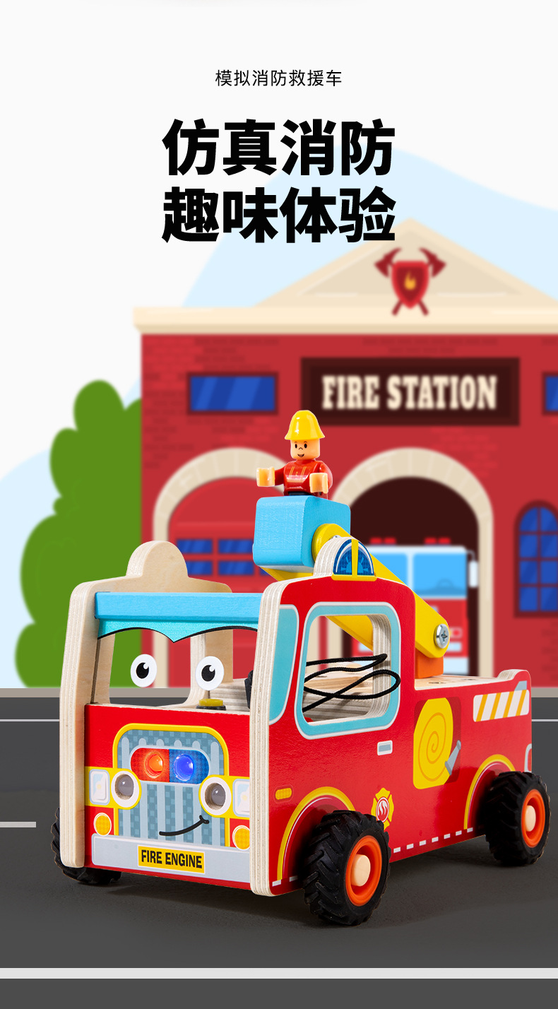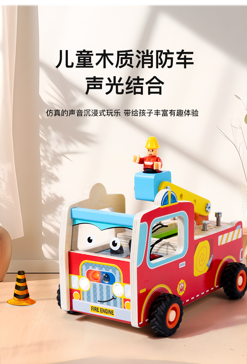 Coche de bomberos de luz y sonido de bricolaje de madera interruptor de llave encendido botón de luz LED educación temprana Montessori juguete de simulación de rompecabezas