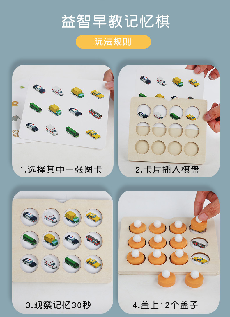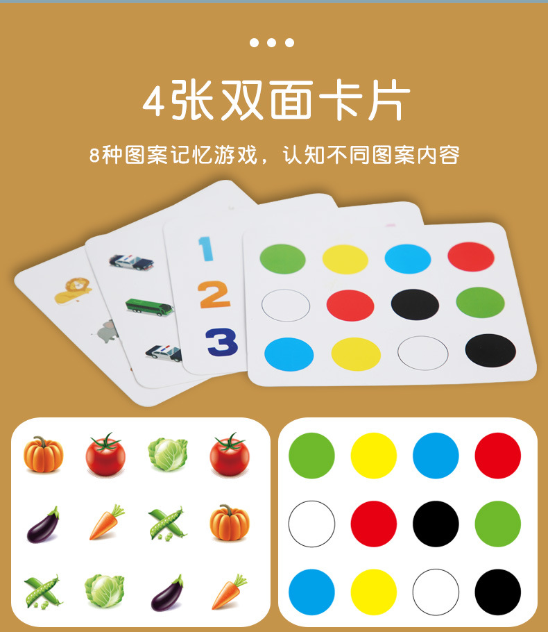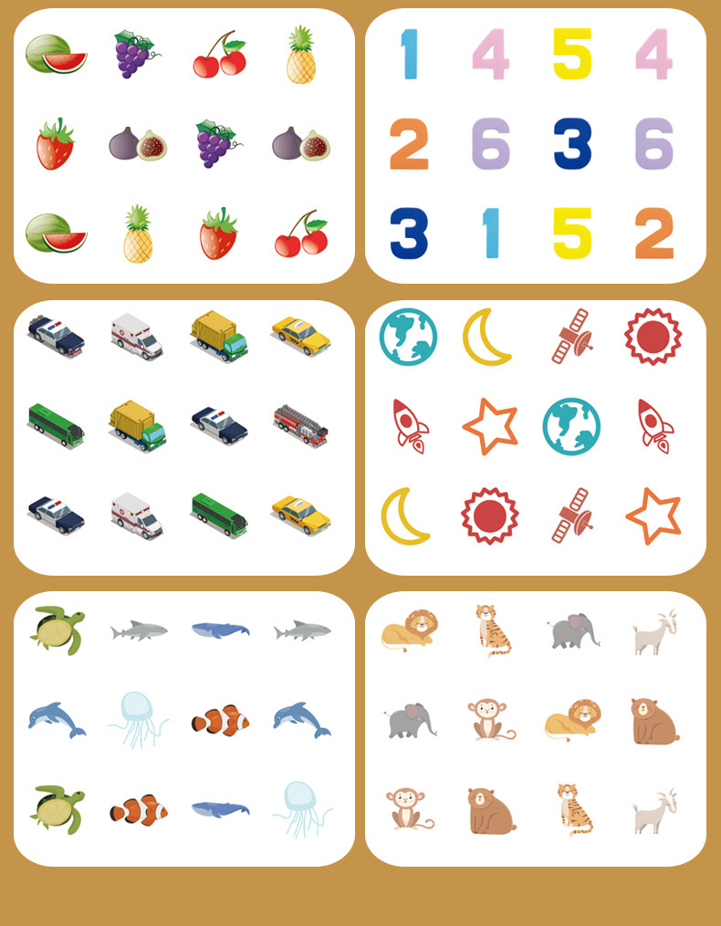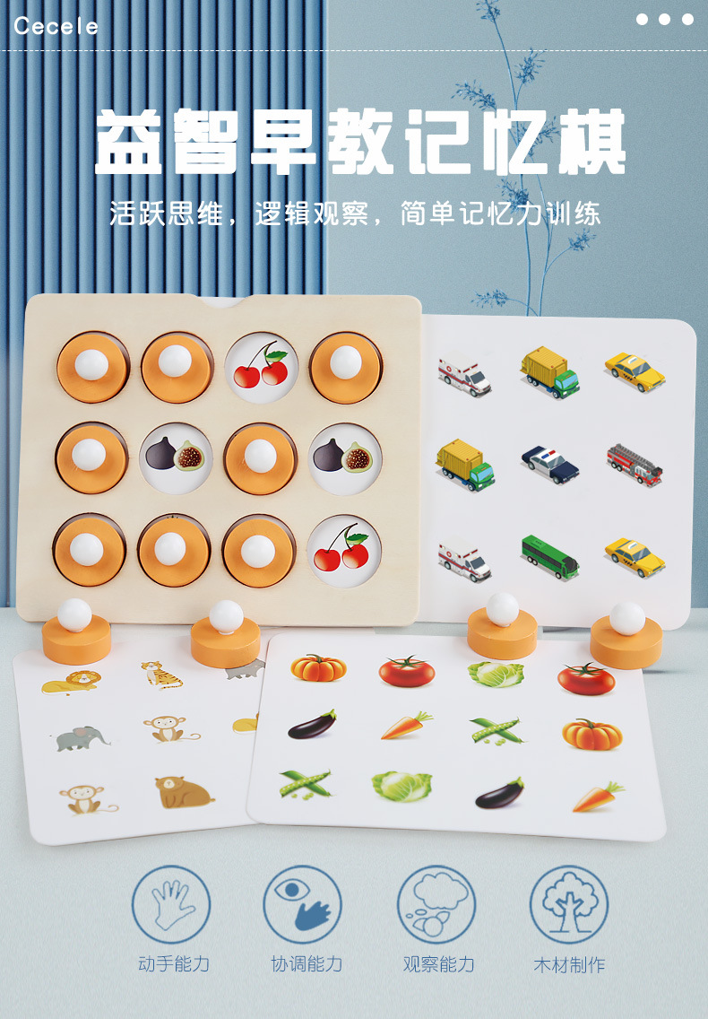| Colores | Juego de memoria de educación temprana de rompecabezas 0.08kg,Cpcce ajedrez de memoria volteo (modelo animal) 0,2 kg,Cpcce ajedrez de memoria volteo (modelo de tráfico) 0.2 |