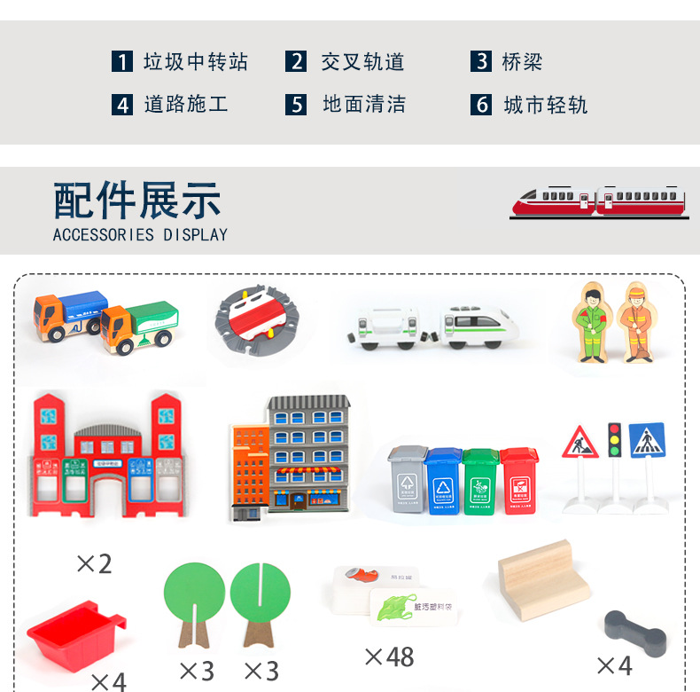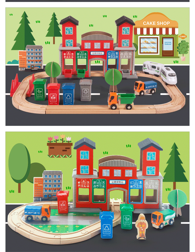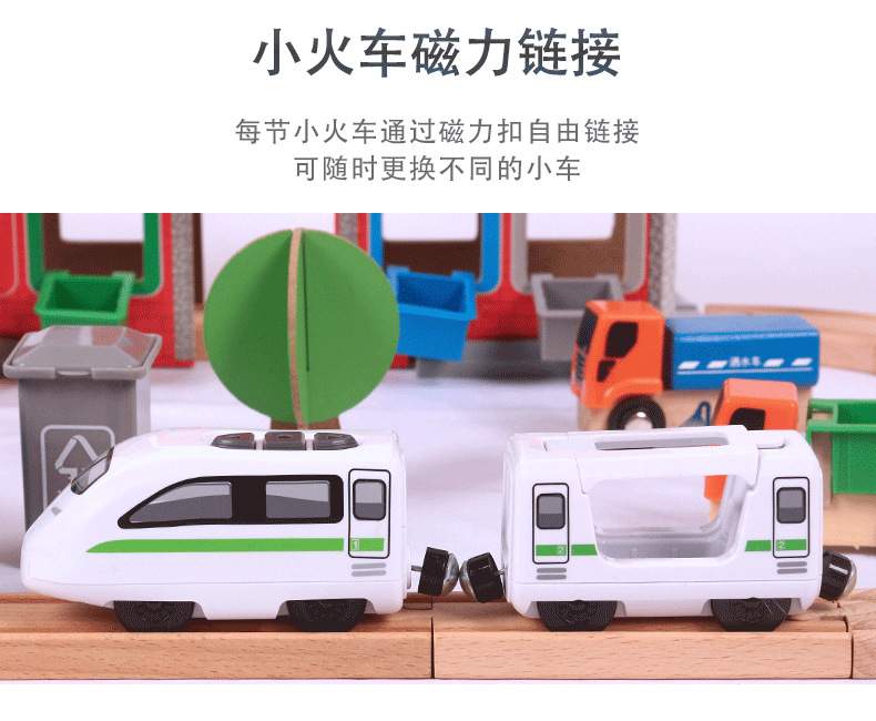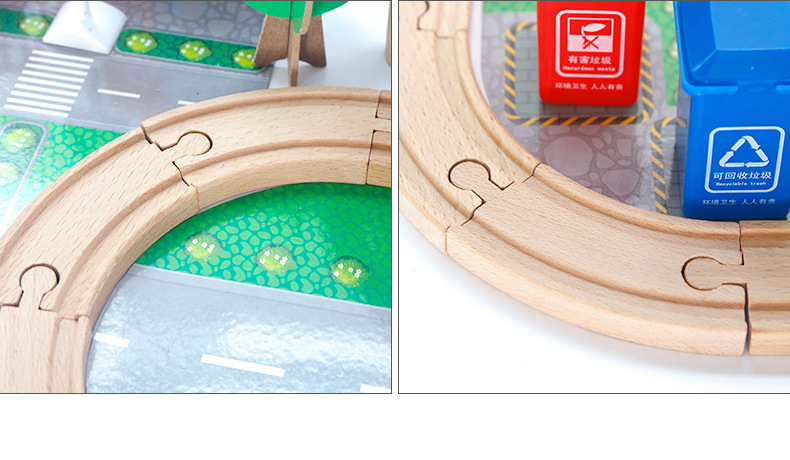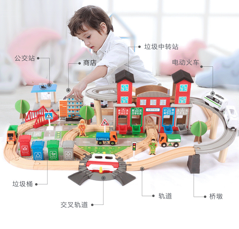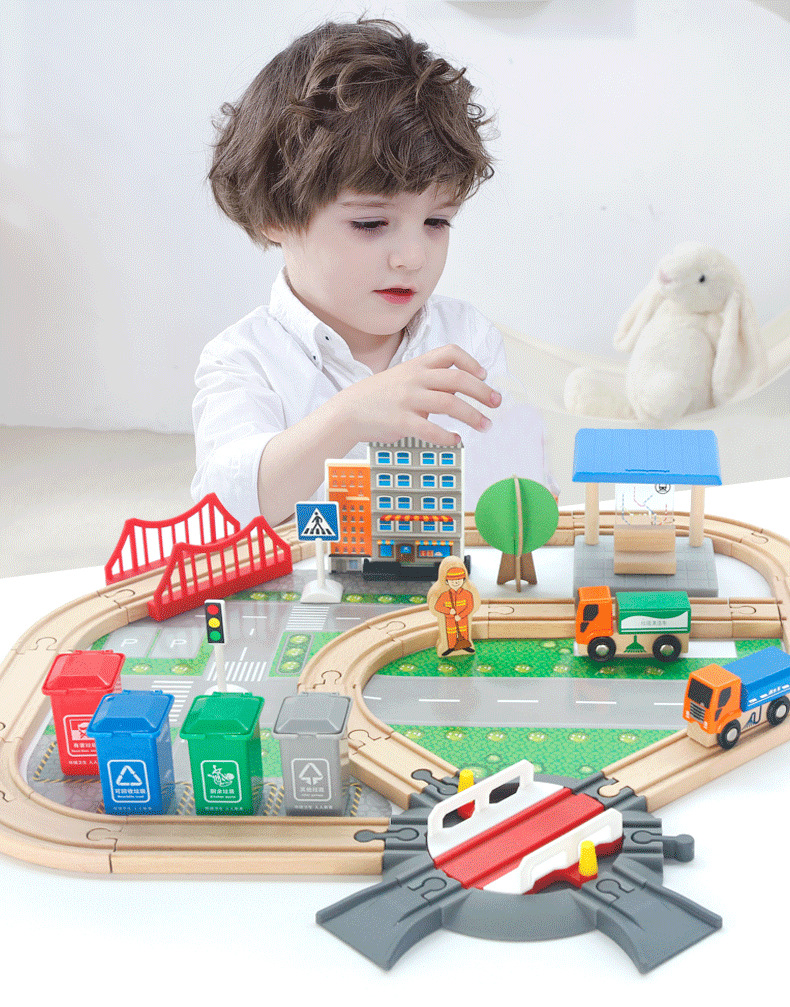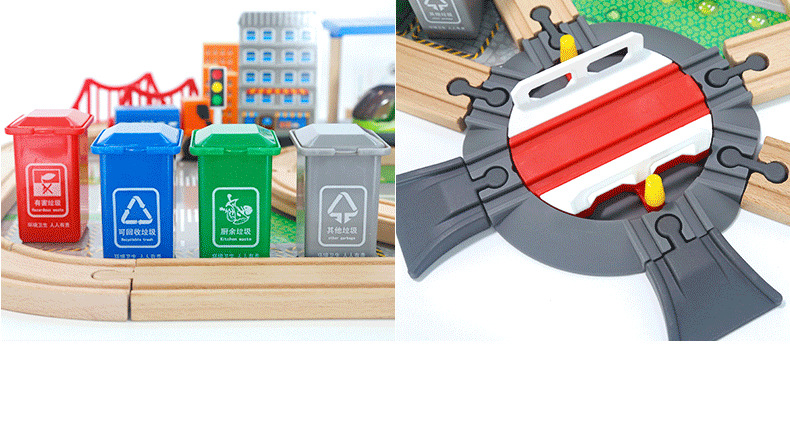 Educación infantil madera eléctrica 139 piezas de camión de ferrocarril de protección ambiental clasificación de basura ensamblaje de bloques de camión de ferrocarril de juguete