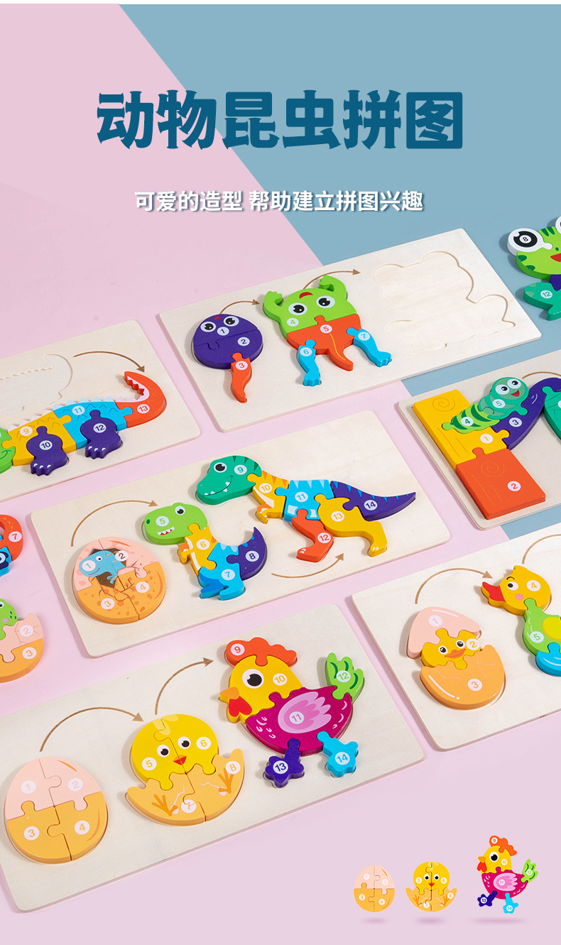 Puzzles de madera para bebés pequeños, niños, niños, niños, niños, animales, juguetes de ensamblaje