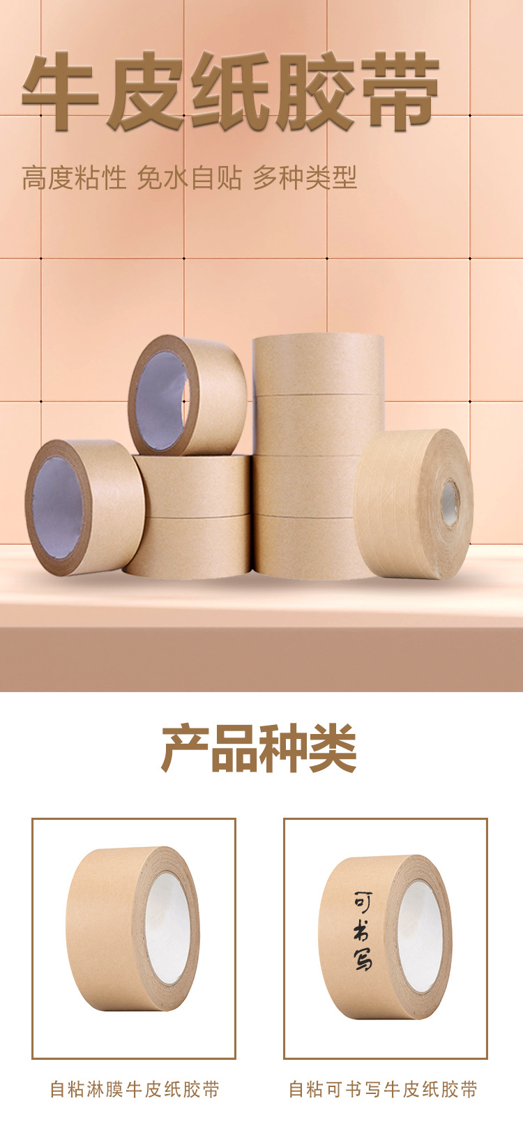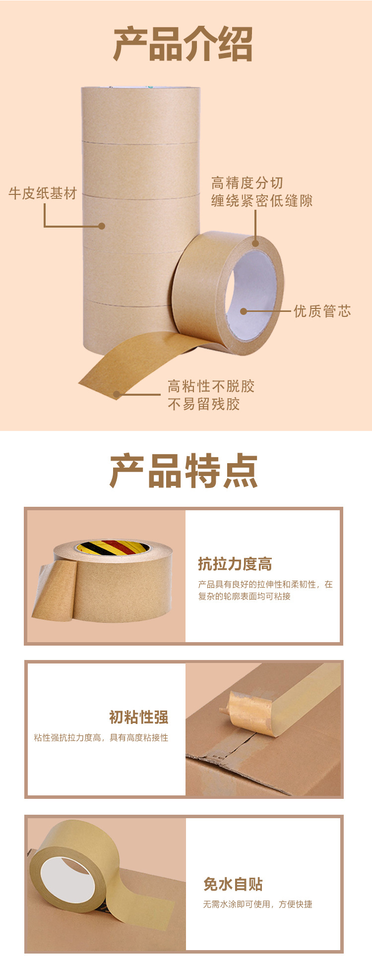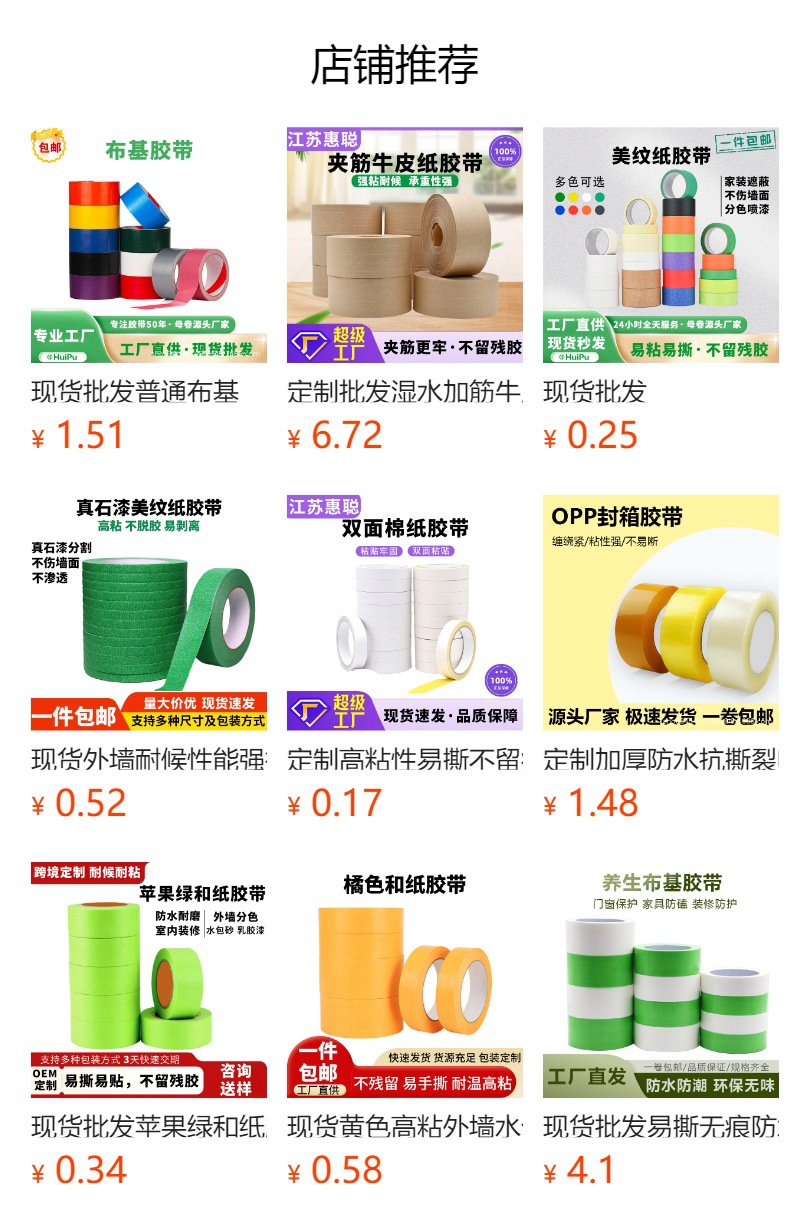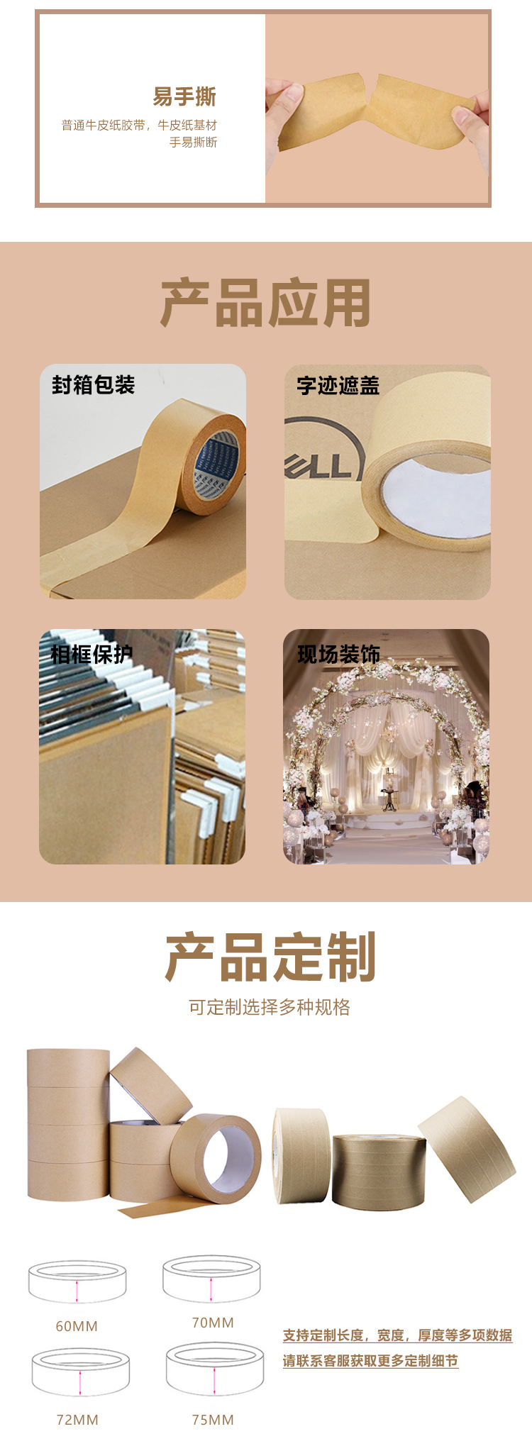 | Escenarios de uso | Cinta de papel kraft de película recubierto de alta viscosidad, sin agua, puede escribir 50 metros, cinta adhesiva desmenuzada, marco de fotos, cinta de sellado de pintura al por mayor |