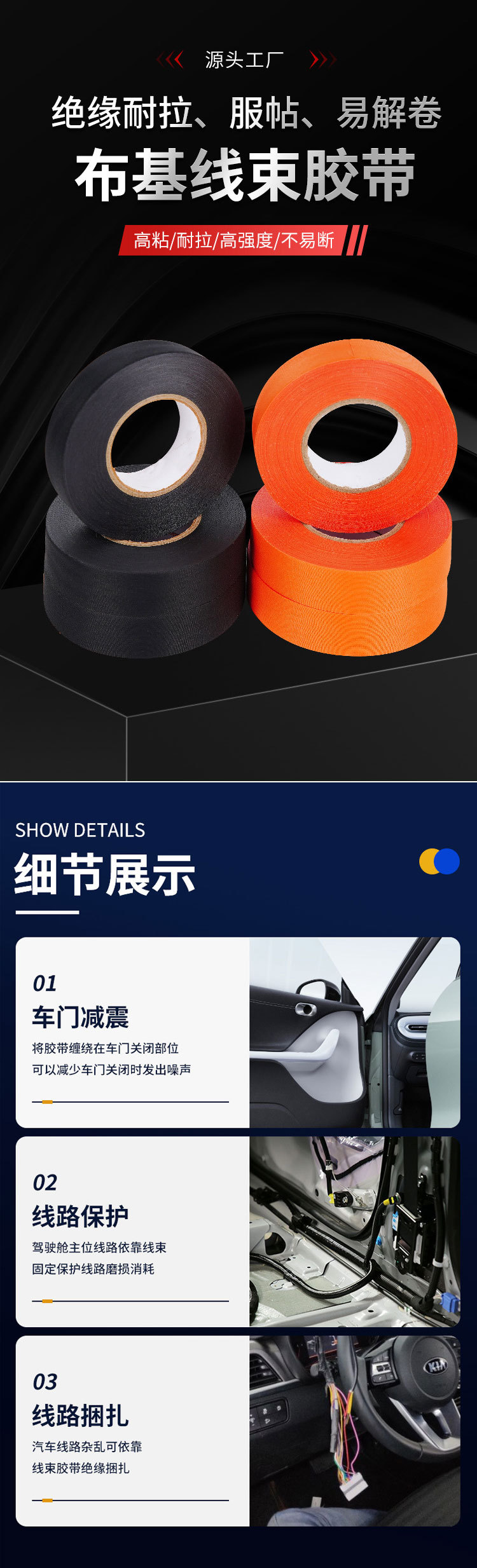 La cinta de arnés de hilo a base de tela de poliéster negro se puede rasgar a mano 0.16mm, anti-envejecimiento, resistencia a altas temperaturas, resistencia al desgaste, reducción de ruido y reducción de impactos para automóviles