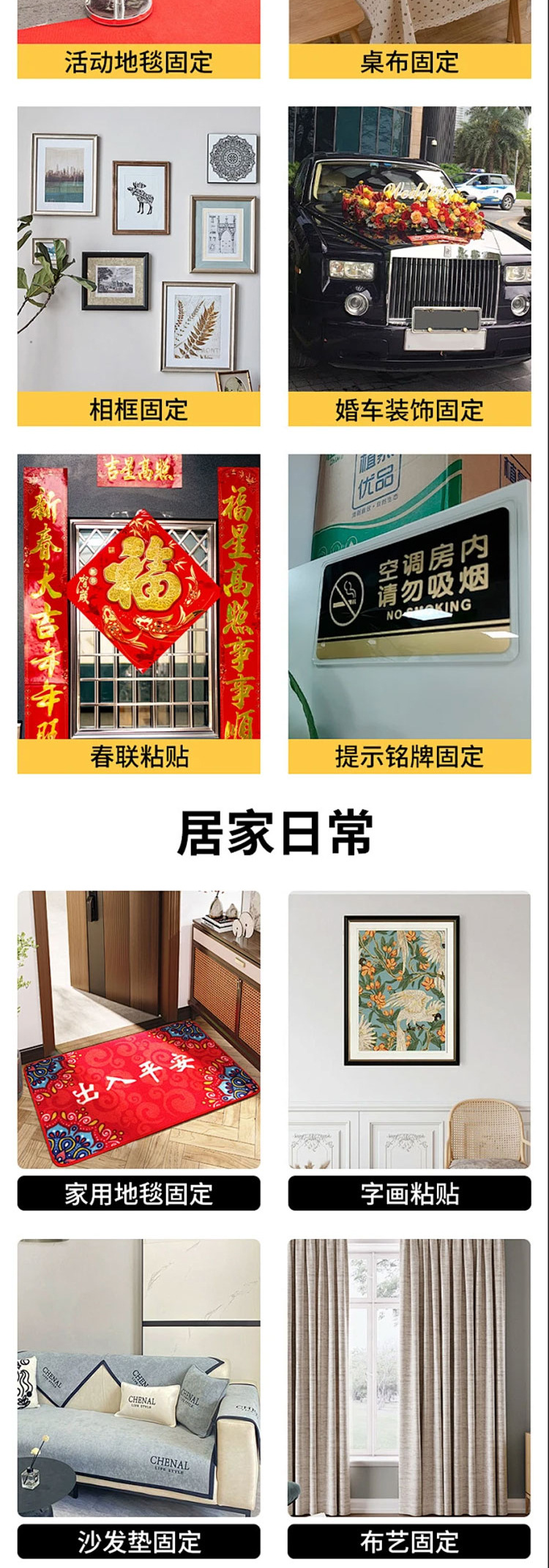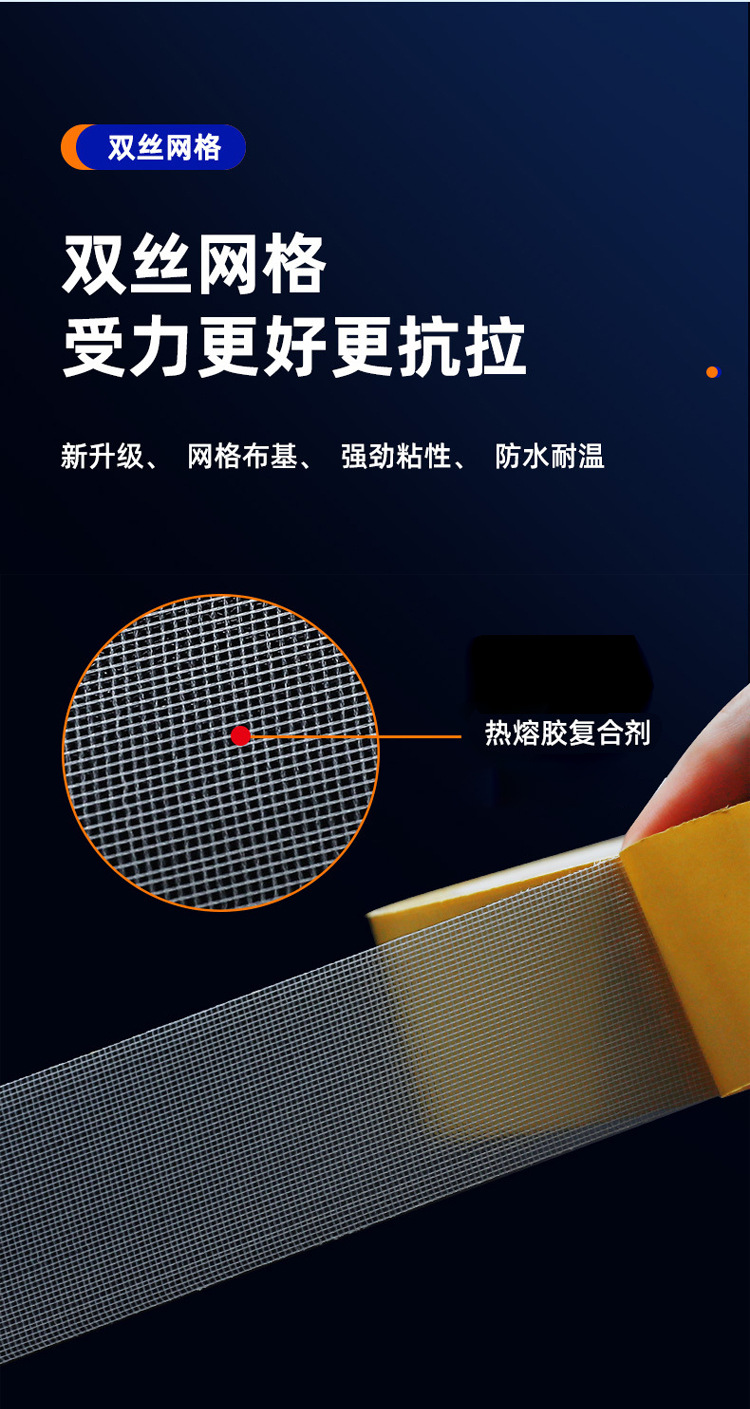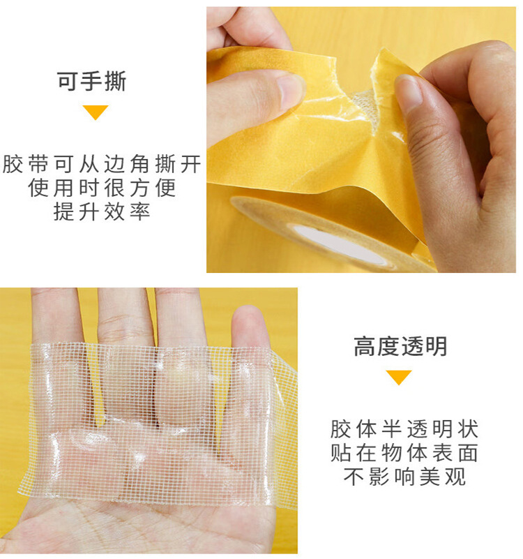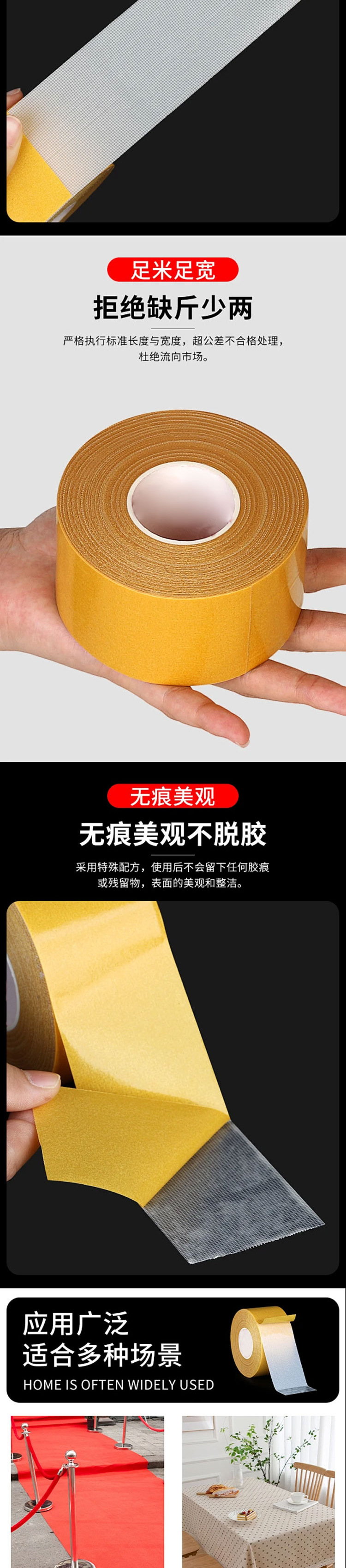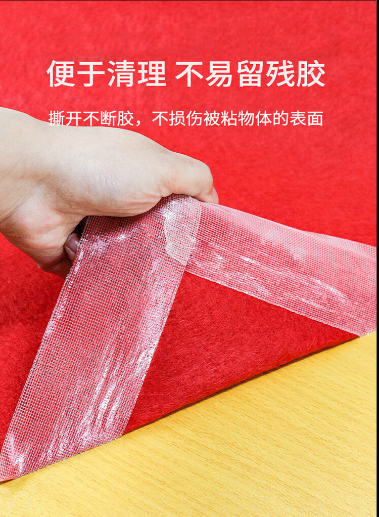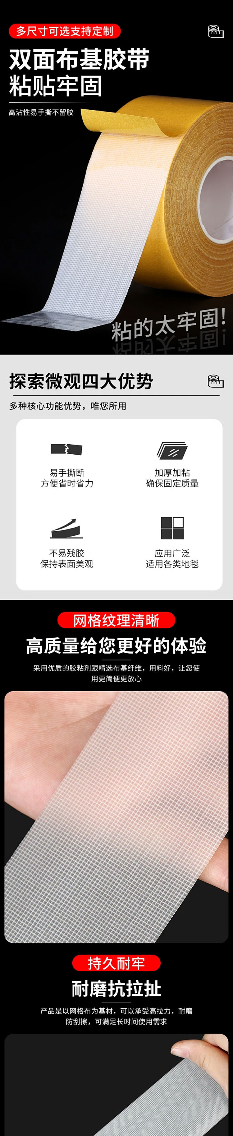 | Nombre | Cinta a base de tela de doble cara Alfombra de malla de alta viscosidad Cinta de doble cara Exposición de bodas Cinta a base de tela adhesiva de doble cara que no deja marcas |