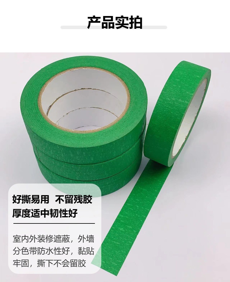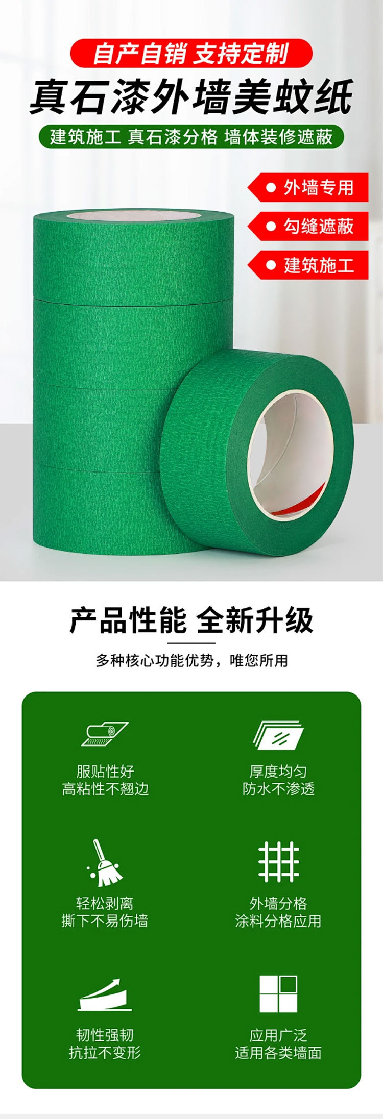 | Escenarios de aplicación | Cinta de papel adhesiva, pintura de piedra real para paredes exteriores, papel de enmascaramiento de pintura dividida, papel de enmascaramiento de paredes exteriores verde de alta viscosidad |