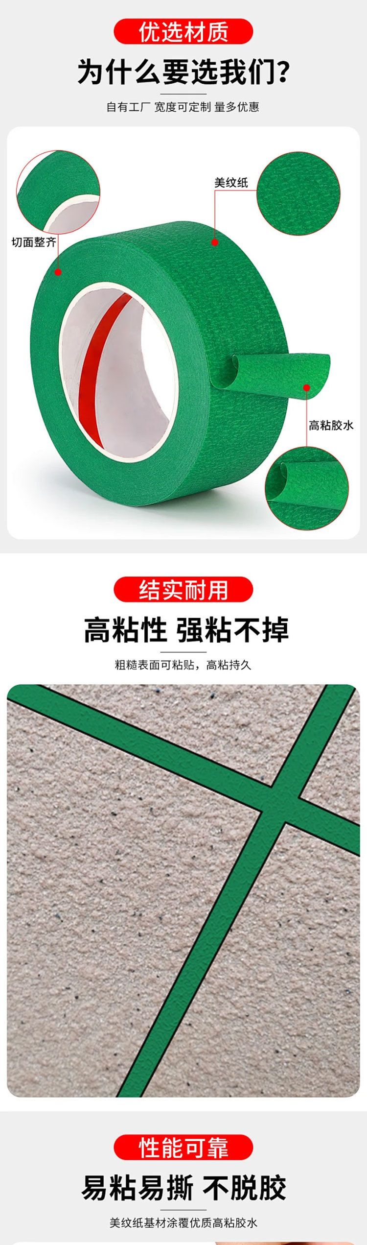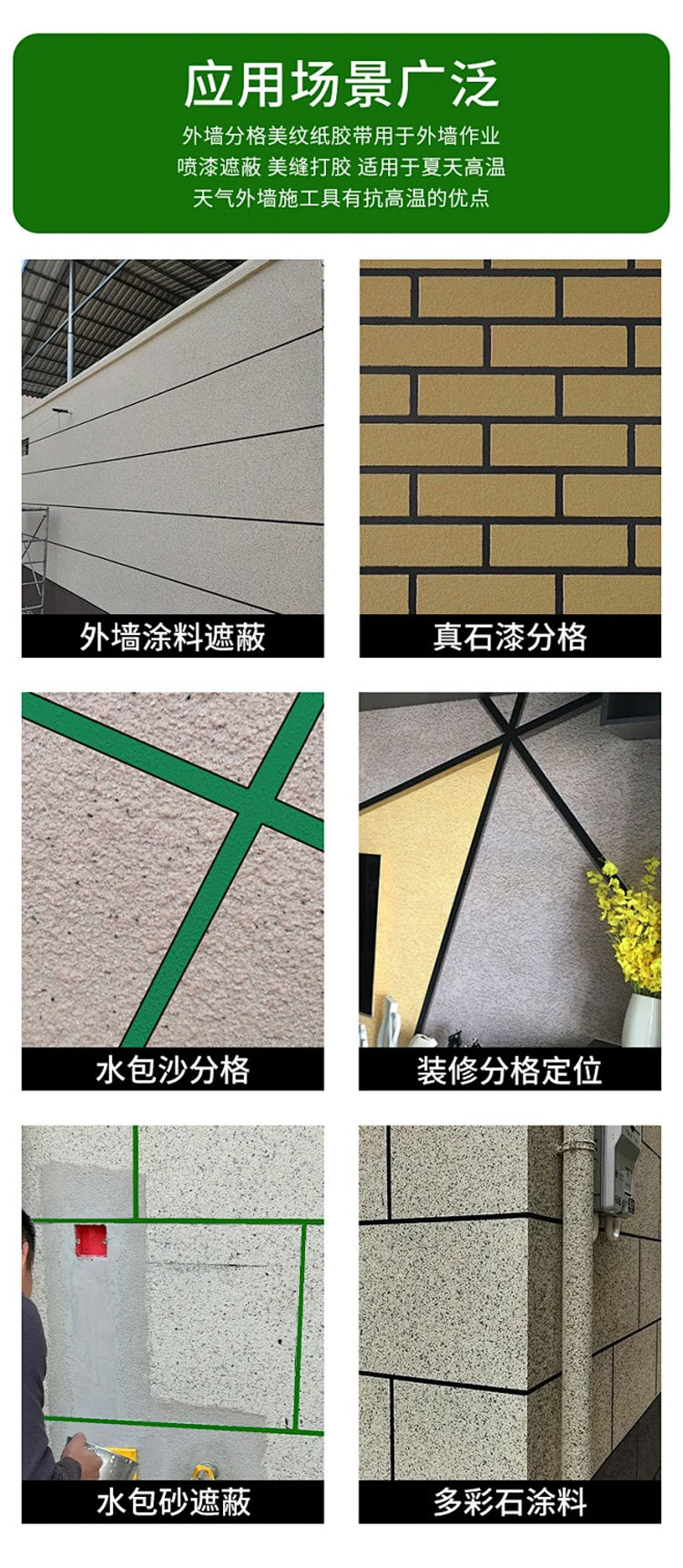 | Nombre | Cinta de papel de textura verde, fuerte adherencia, alta adherencia, pintura de piedra real para paredes exteriores, ladrillos de imitación, separación de colores y marcado, imprimación sin presión, fácil de rasgar |