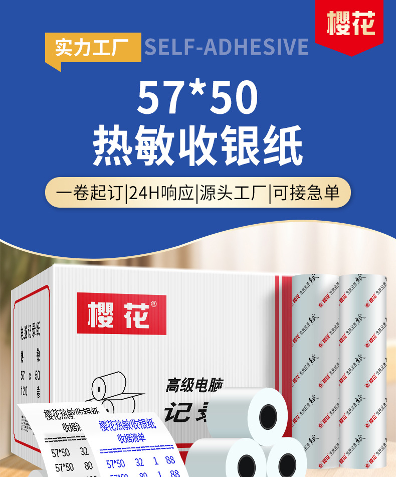 Flor de cerezo 57*50mm caja registradora térmica papel de impresión Papel de recibo Meituan supermercado fabricante de papel de impresión térmica