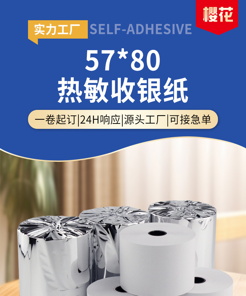 Suministro directo de fábrica de flor de cerezo 57*80 papel de caja registradora térmica papel de impresión rollo grande Meituan fuente de papel de recibo para llevar fabricante