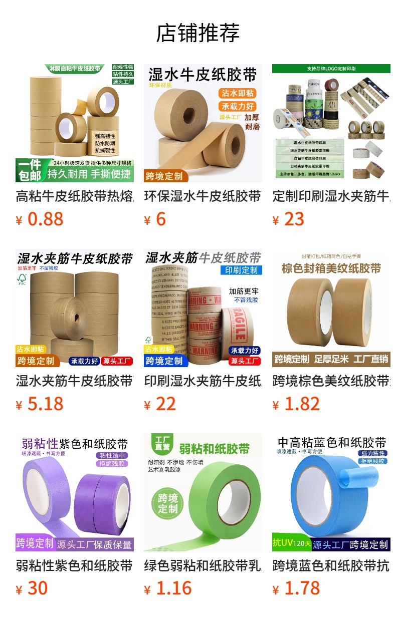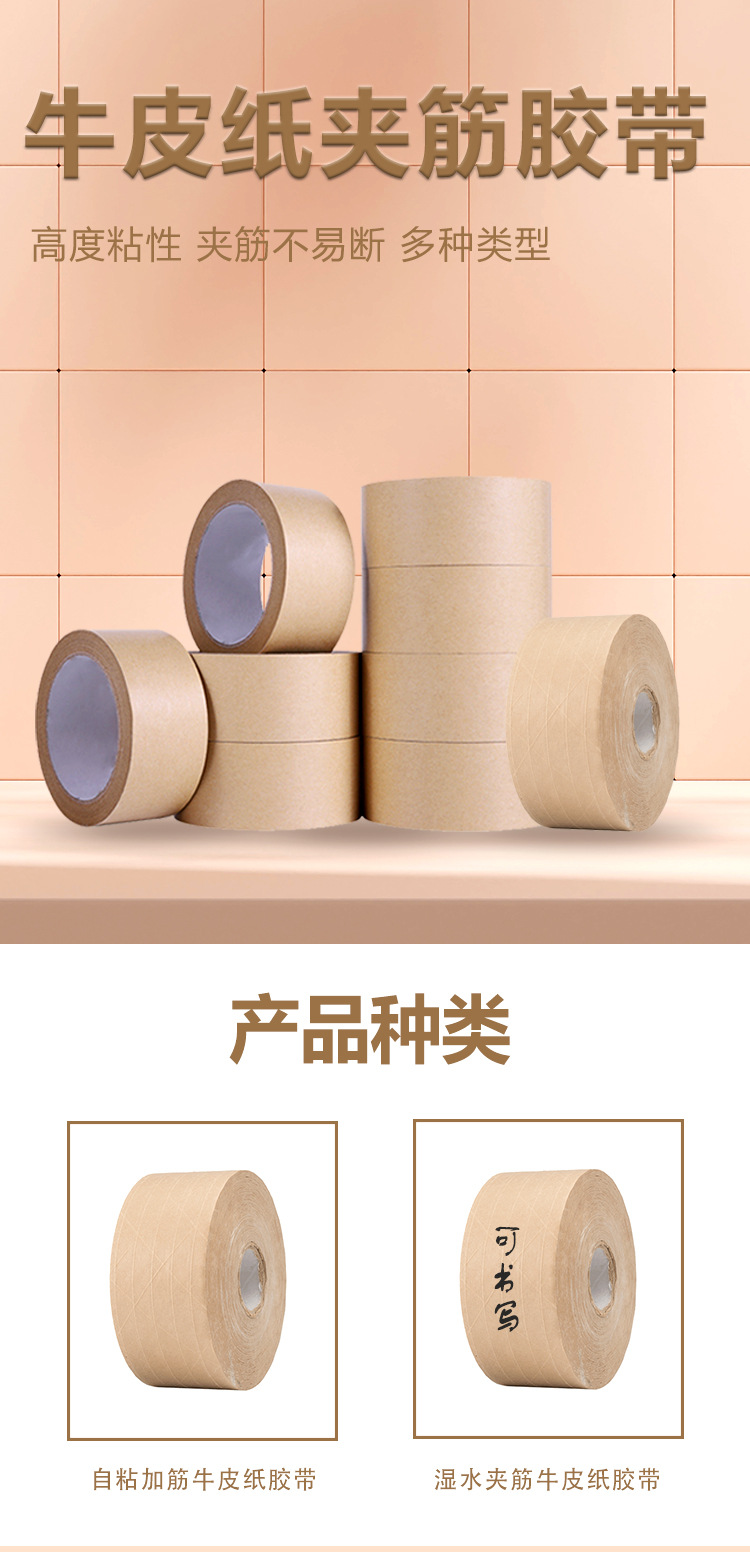 | Nombre | Embalaje especial de comercio exterior, sellado, refuerzo, agua húmeda, cinta de papel kraft, fábrica de origen, cinta de fibra de alta tenacidad |