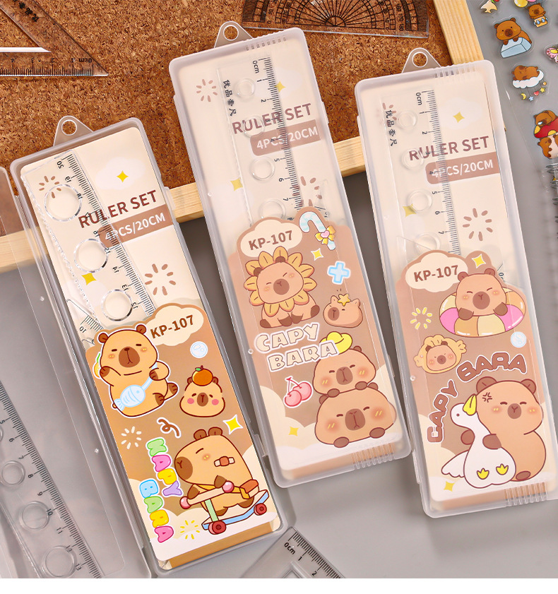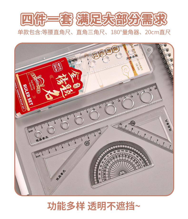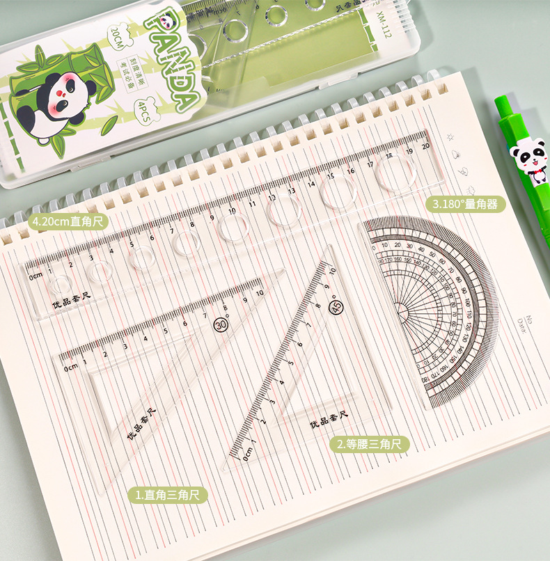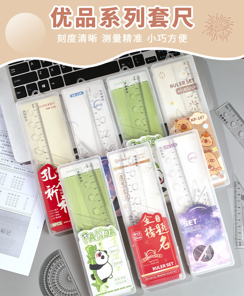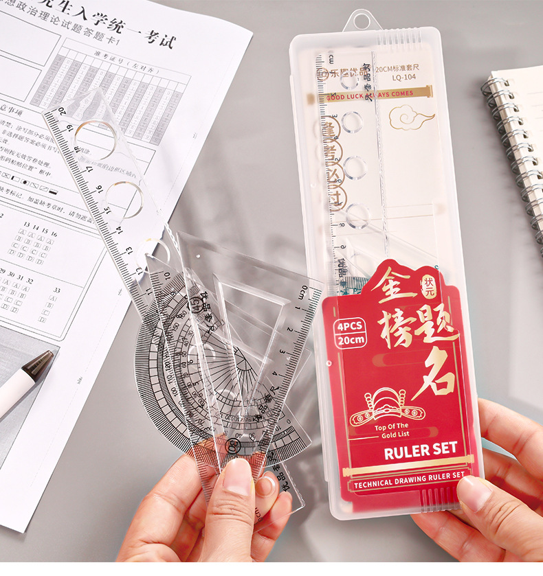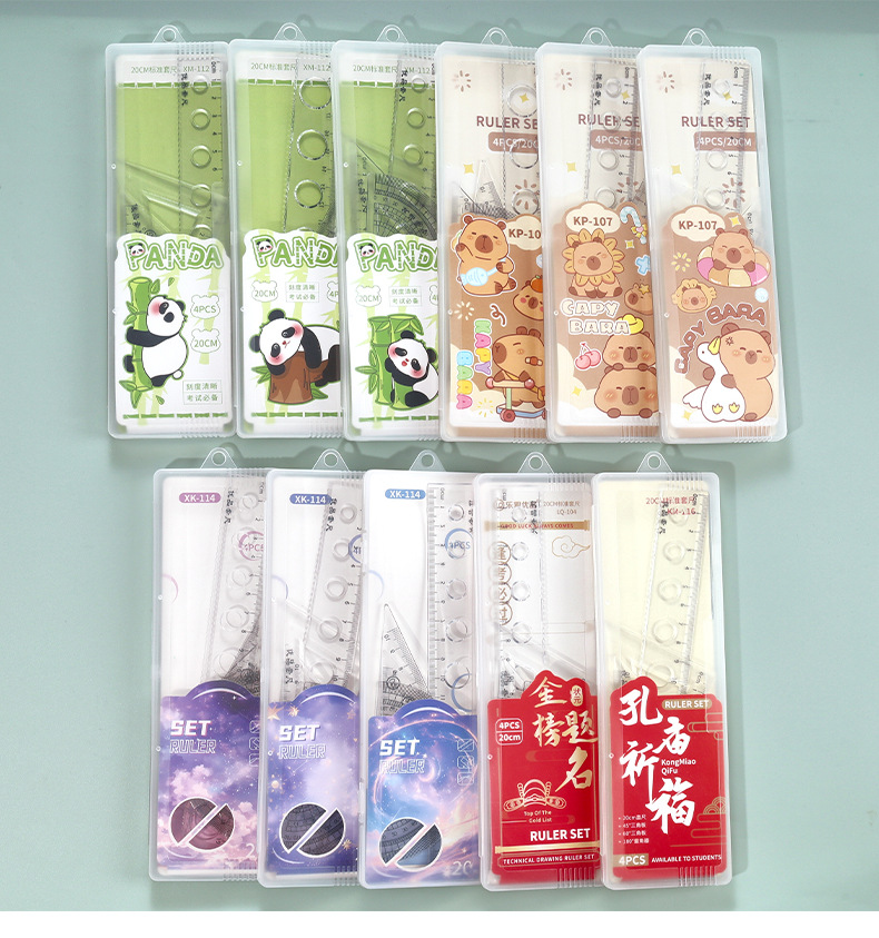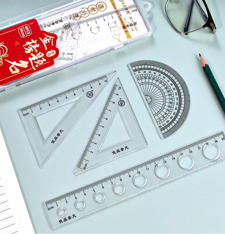 Juego de cuatro piezas de dibujos animados para estudiantes, regla de alto valor de 20cm, regla triangular, medidor de ángulo, juego de regla en caja al por mayor