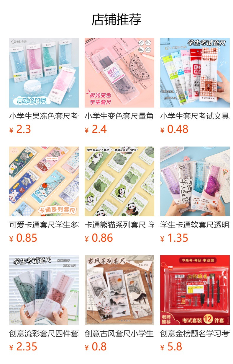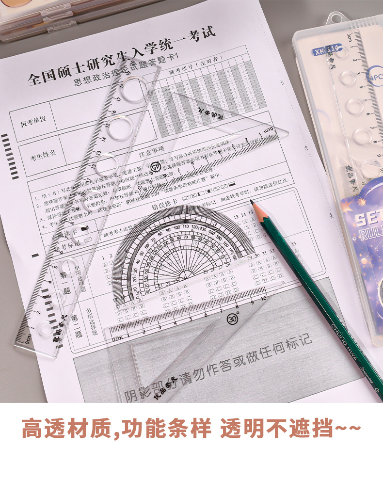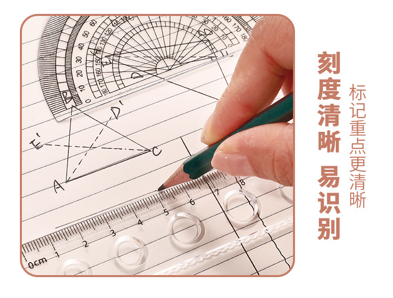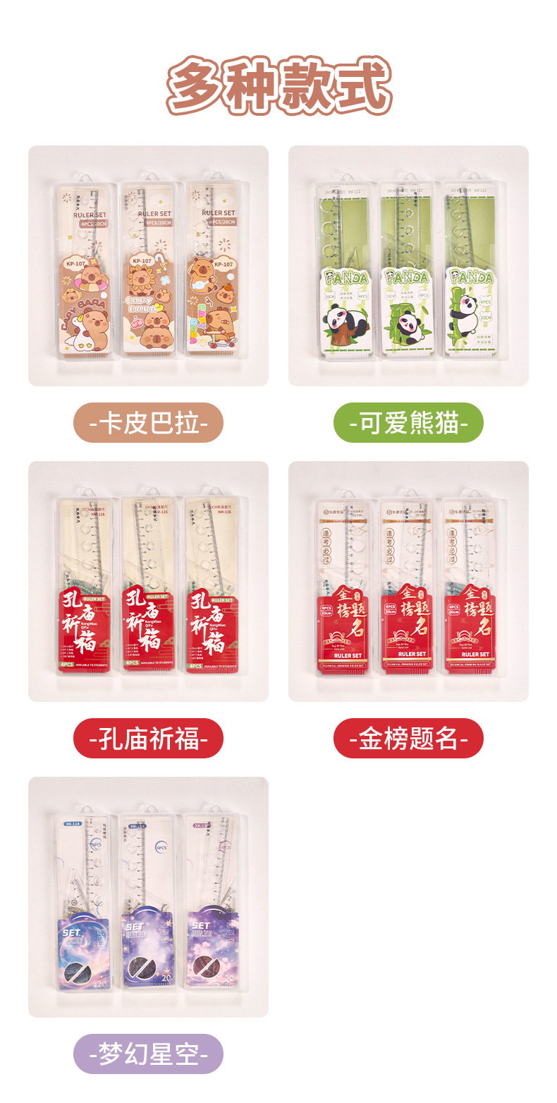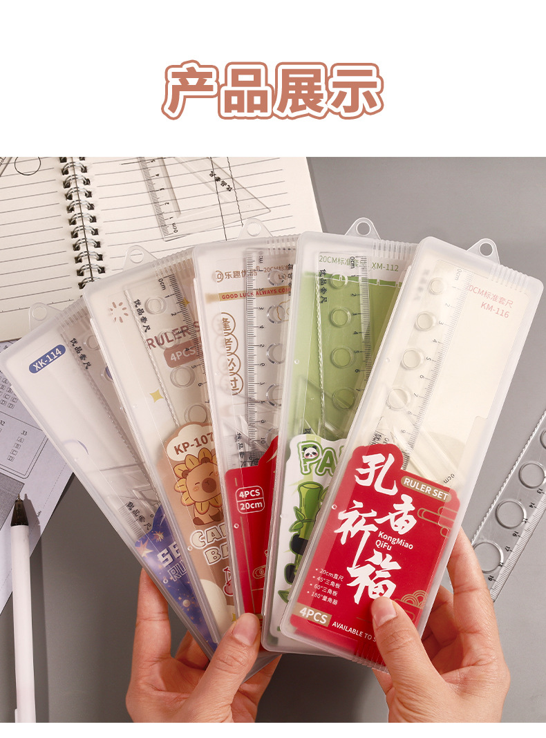 Juego de cuatro piezas de dibujos animados para estudiantes, regla de alto valor de 20cm, regla triangular, medidor de ángulo, juego de regla en caja al por mayor