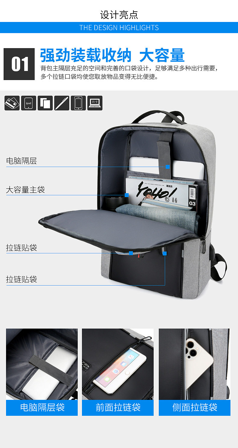 Transfronterizo de los hombres de negocios bolsa de ordenador portátil multifuncional USB mochila de gran capacidad mochila imprimible logo