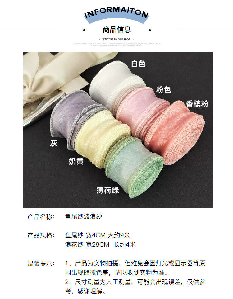 | Colores | Hilo de cola de pez/No. 4 blanco/ancho de aproximadamente 4cm/largo de aproximadamente 9 metros,Hilo de cola de pescado/n. ° 5 polvo claro/ancho de aproximadamente 4cm/largo de aproximadamente 9 metros,Hilo de cola de pez/No. 7 Symphony Blue/Ancho de aproximadamente 4cm/Largo de aproximadamente 9 metros,Hilo de cola de pez/brote de nieve de color n. ° 8/ancho de aproximadamente 4cm/largo de aproximadamente 9 metros,Hilo de cola de pez/polvo de fantasía n. ° 9/ancho de aproximadamente 4cm/largo de aproximadamente 9 metros,Hilo de cola de pez/No. 12 Symphony Purple/Ancho de aproximadamente 4cm/Largo de aproximadamente 9 metros,Hilo de ola de borde de perlas/polvo de champán/ancho 28CM/largo aproximadamente 4 metros,Cinturón de cuadrícula aleatorio 1 metro,Hilo de onda lateral liso/blanco/ancho 28CM/largo aproximadamente 3,6 metros,Hilo de ola de borde de perlas/negro/ancho 28CM/largo aproximadamente 3,6 metros,Hilo de onda lateral liso/negro/ancho 28CM/largo aproximadamente 3,6 metros,Hilo de onda Phnom Penh/negro/ancho 28CM/largo aproximadamente 3,6 metros,Hilo de ola de borde de perlas/blanco/ancho 28CM/largo aproximadamente 3,6 metros,Hilo de onda Phnom Penh/blanco/ancho 28CM/largo aproximadamente 3,6 metros,Hilo de onda lateral simple/polvo de champán/ancho 28CM/largo aproximadamente 3,6 metros,Hilo de cola de pescado/champán n ° 2/ancho de aproximadamente 4cm/largo de aproximadamente 9 metros,Hilo de cola de pez/No. 1 verde hierba/ancho de aproximadamente 4cm/largo de aproximadamente 9 metros,Hilo de cola de pescado/n. ° 6 beige/ancho de aproximadamente 4cm/largo de aproximadamente 9 metros,Hilo de cola de pez/No. 11 Symphony White/Ancho de aproximadamente 4cm/Largo de aproximadamente 9 metros |