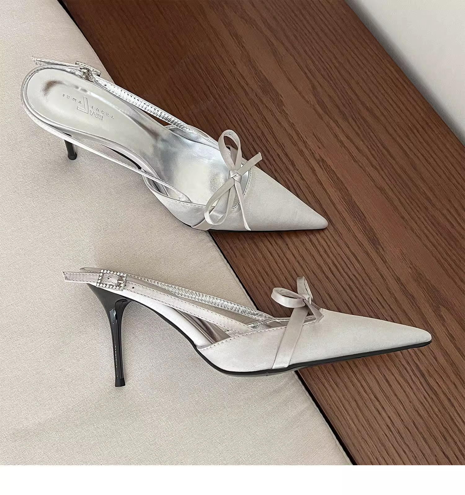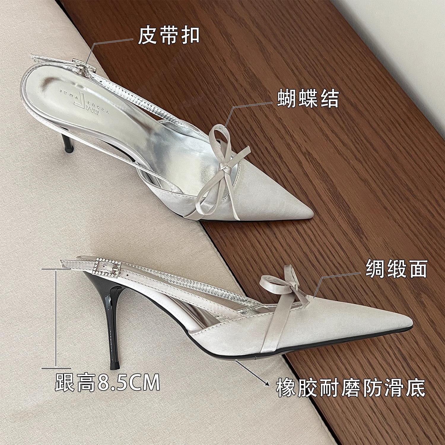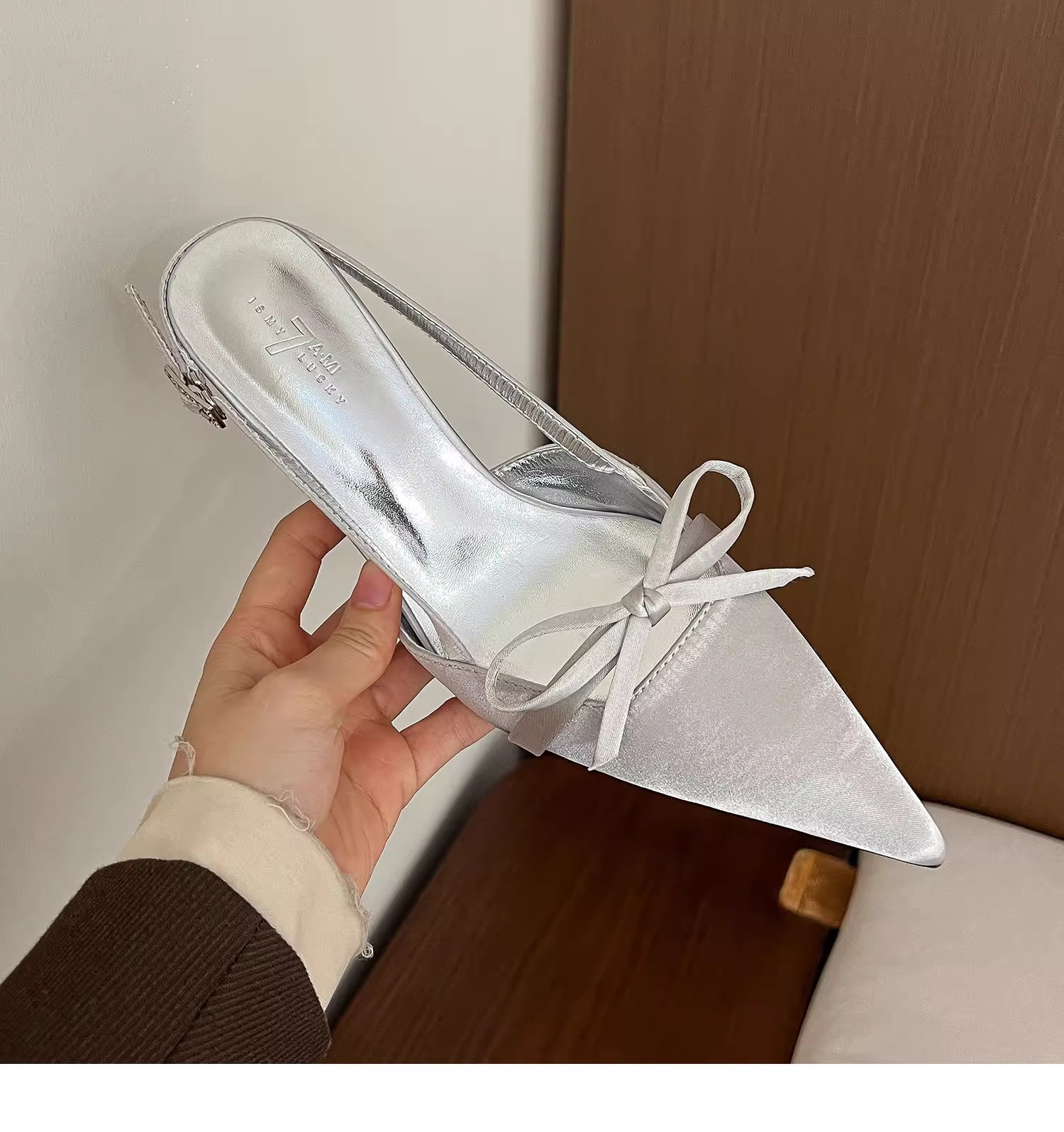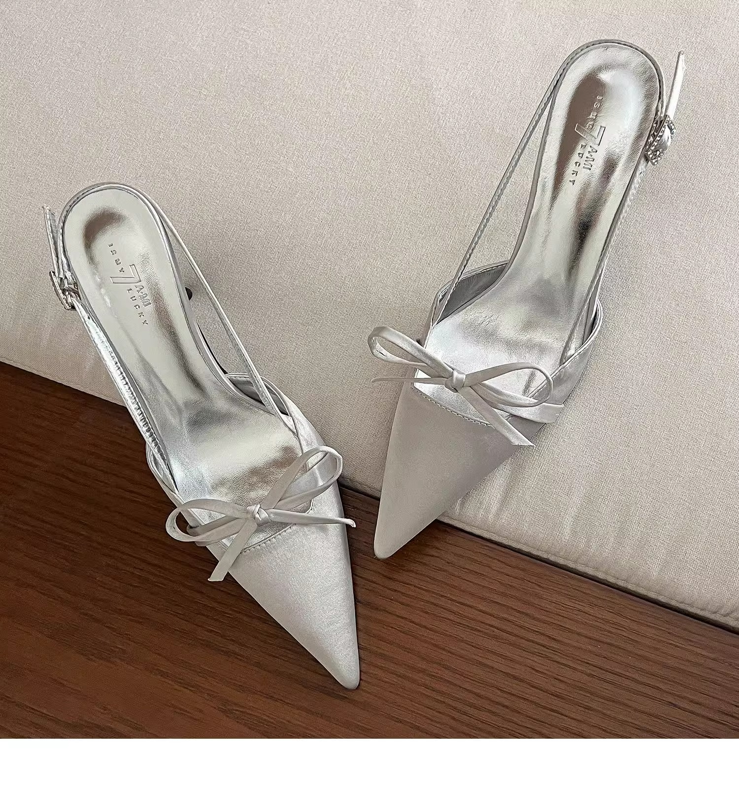 ¡El estudio es frío y gentil! Sandalias plateadas con lazo puntiagudo, tacones de aguja de una palabra de verano para mujer