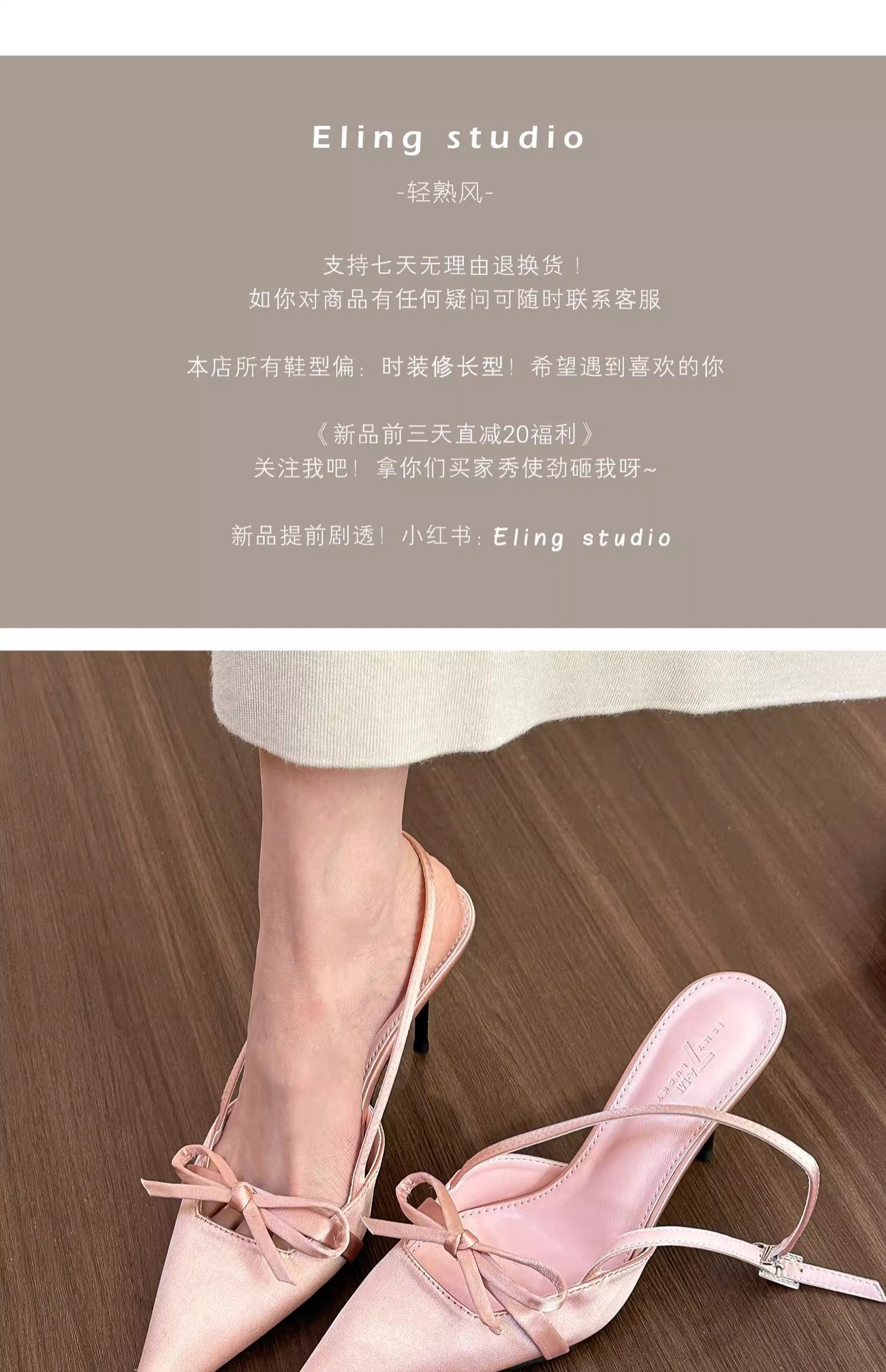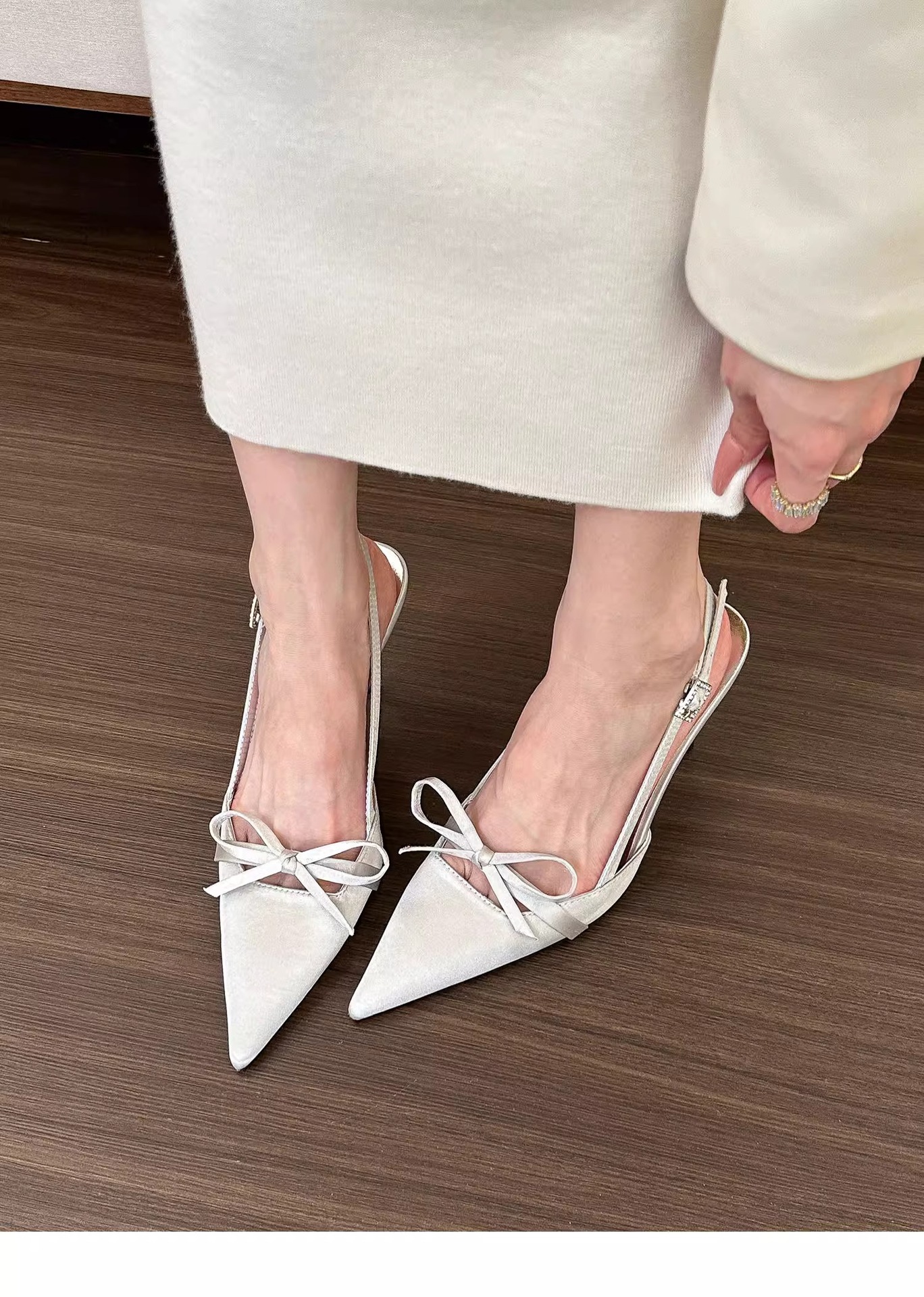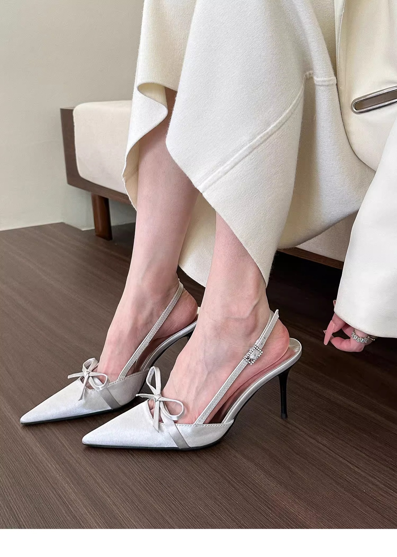 ¡El estudio es frío y gentil! Sandalias plateadas con lazo puntiagudo, tacones de aguja de una palabra de verano para mujer