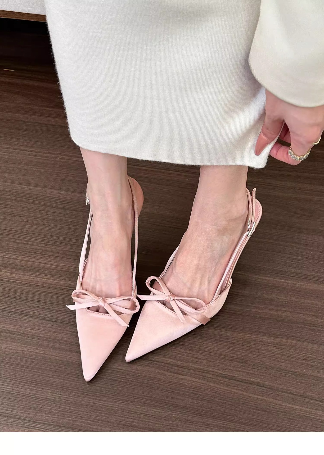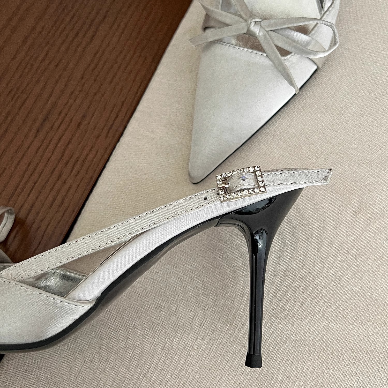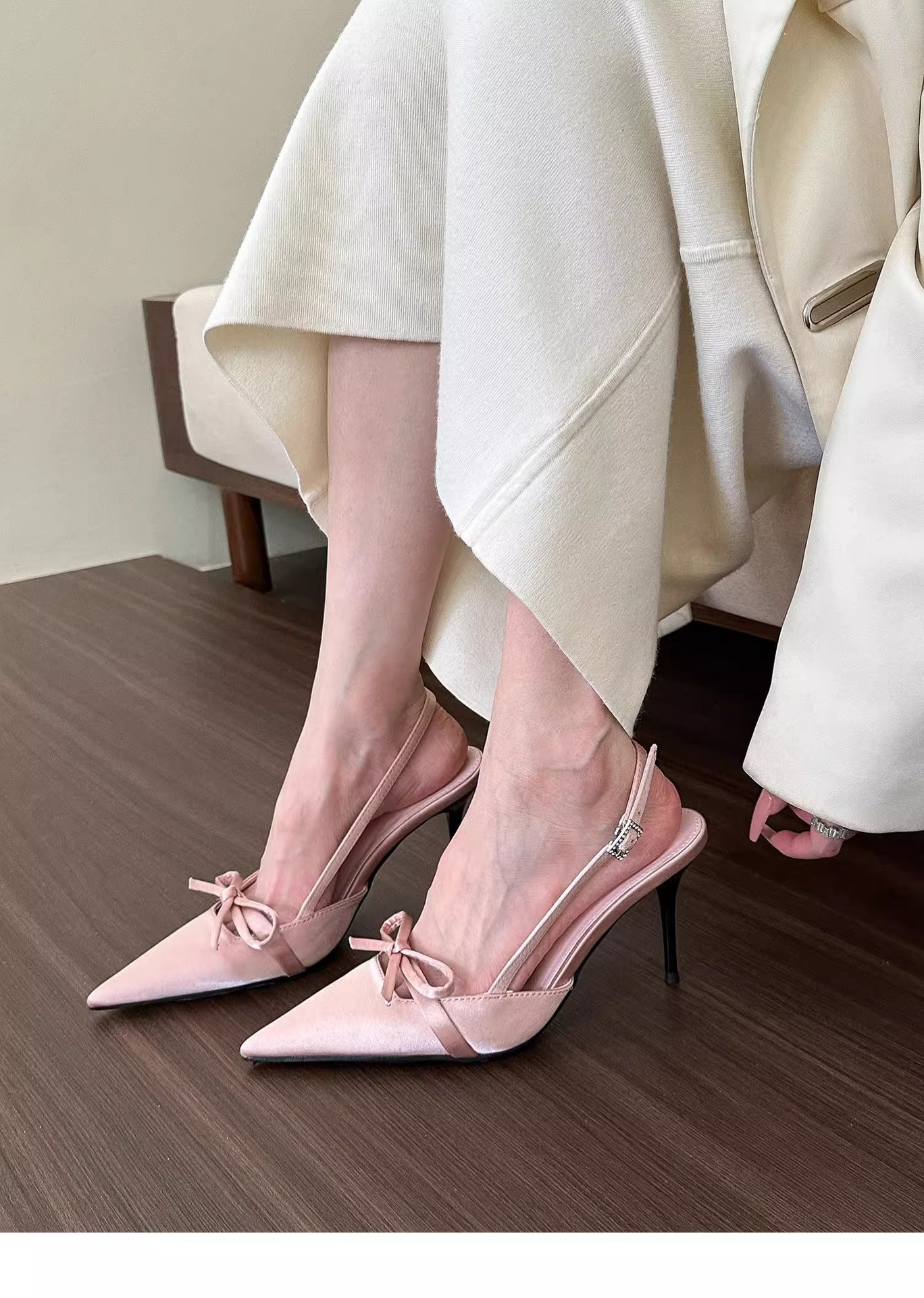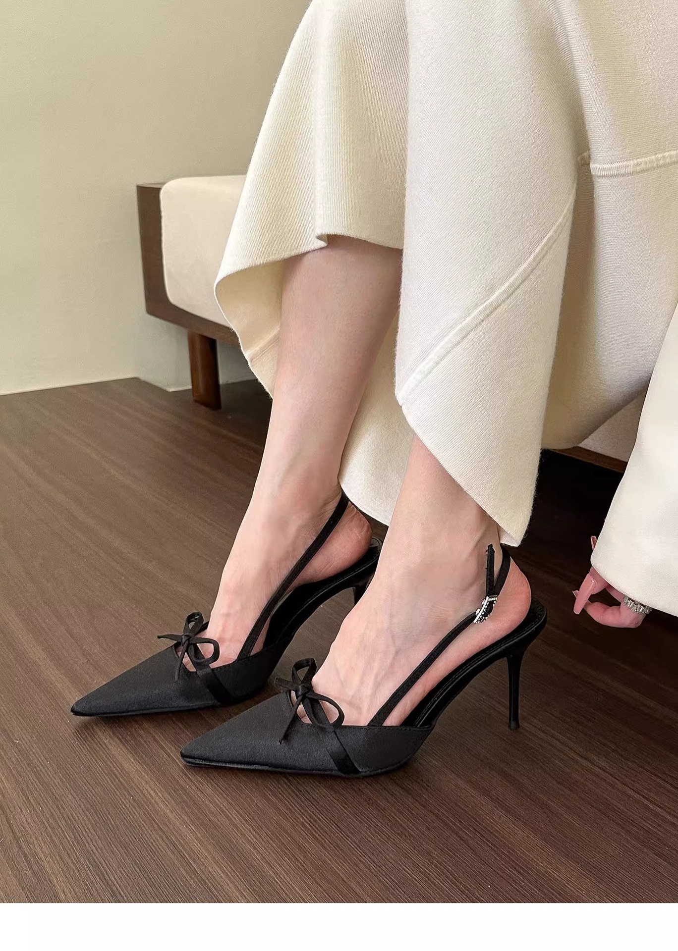 ¡El estudio es frío y gentil! Sandalias plateadas con lazo puntiagudo, tacones de aguja de una palabra de verano para mujer
