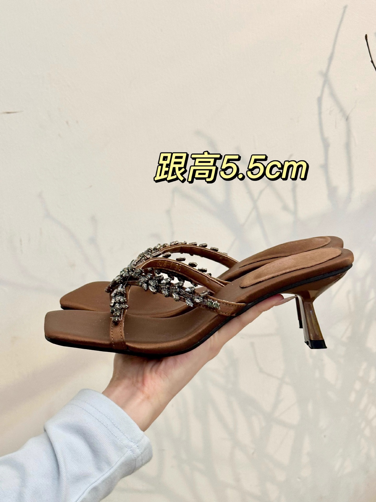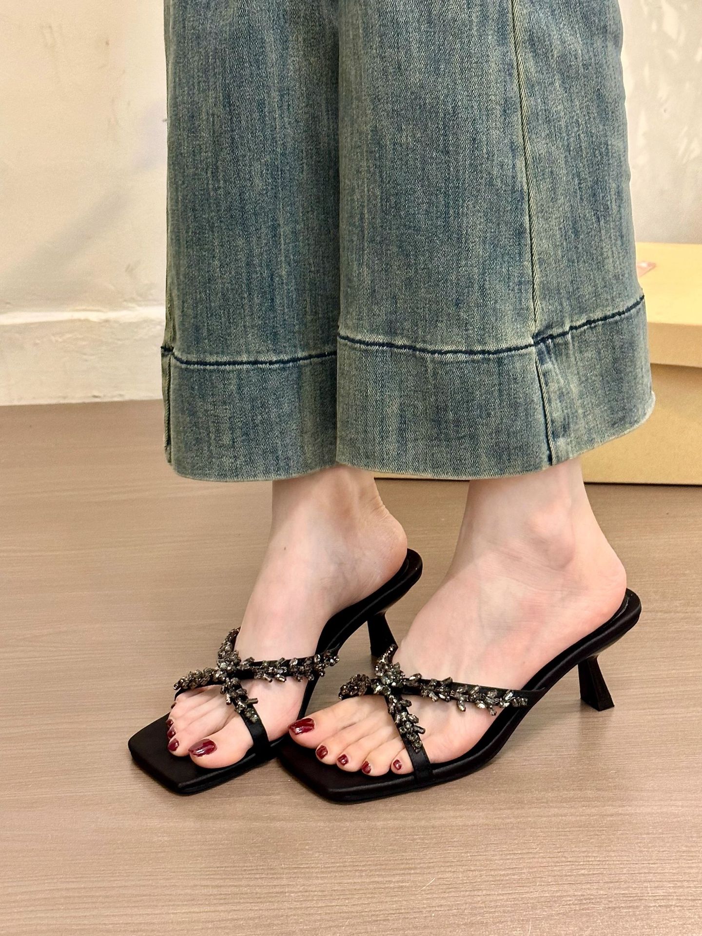 ¡Tiniendo hijas antiguas! Temperamento raso cabeza cuadrada diamantes de imitación con sandalias de tacón de aguja sandalias de gato de verano femenino