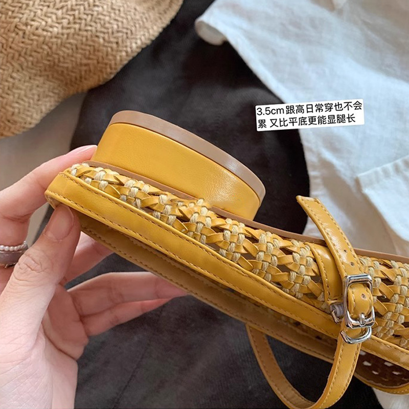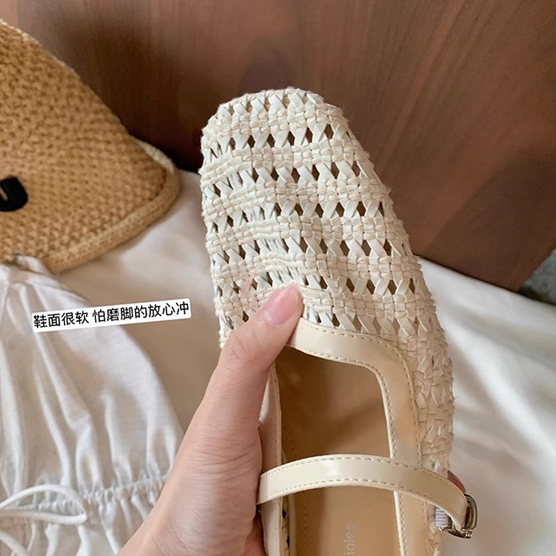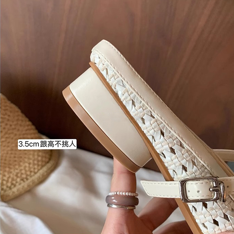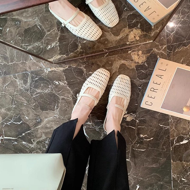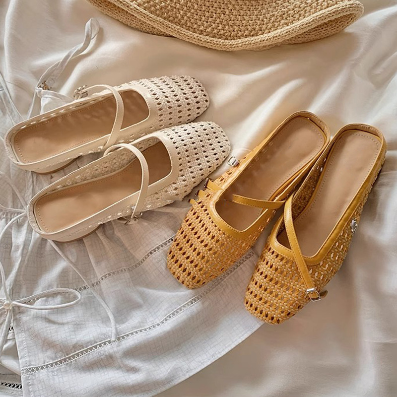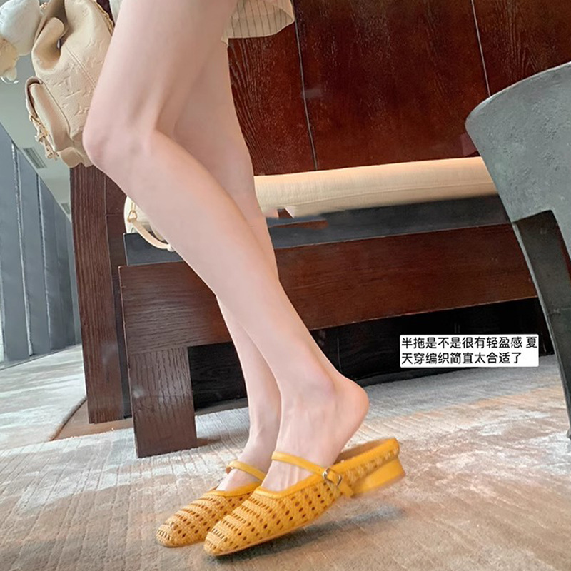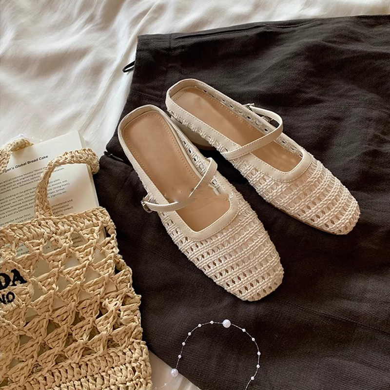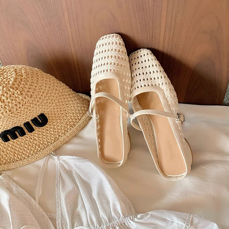 Grape Mom Summer retro tejido cuadrado hueco cabeza de una palabra con sandalias de tacón grueso Muller media pantuflas ropa exterior femenina
