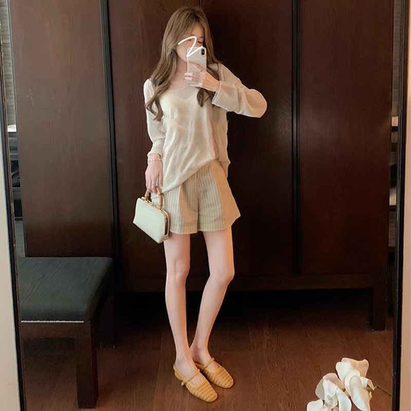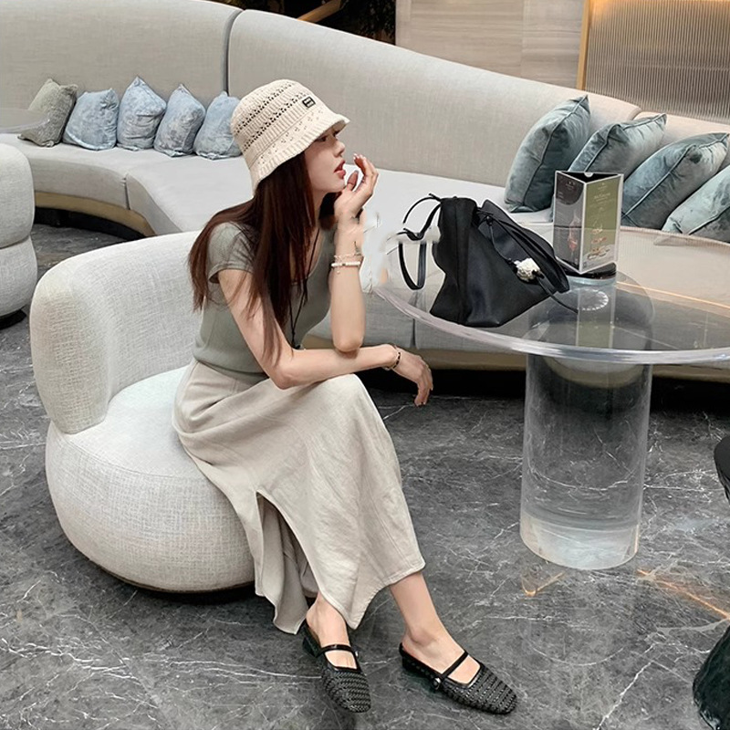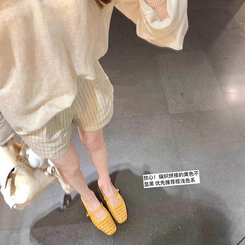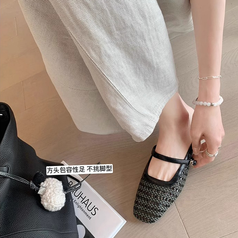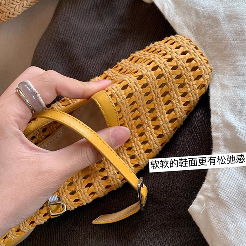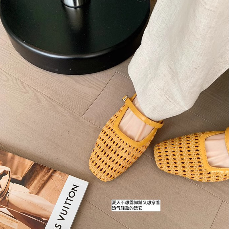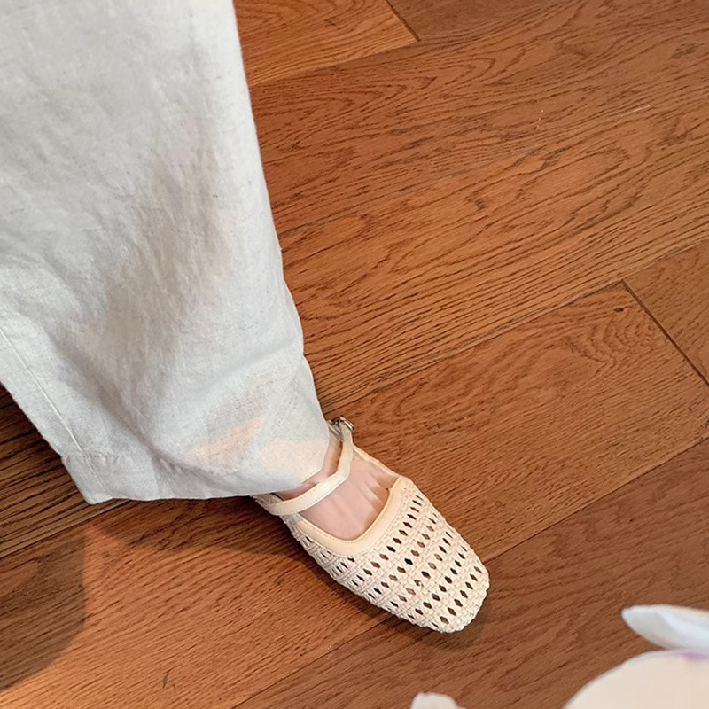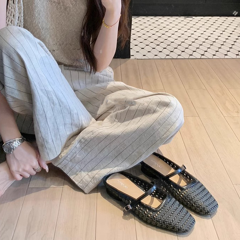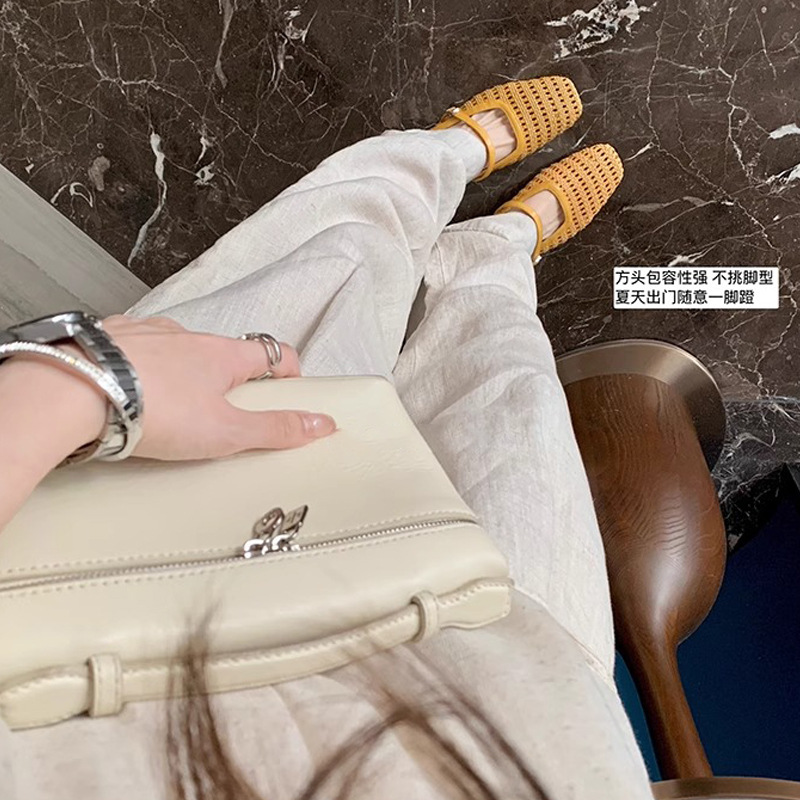 Grape Mom Summer retro tejido cuadrado hueco cabeza de una palabra con sandalias de tacón grueso Muller media pantuflas ropa exterior femenina