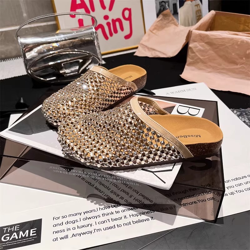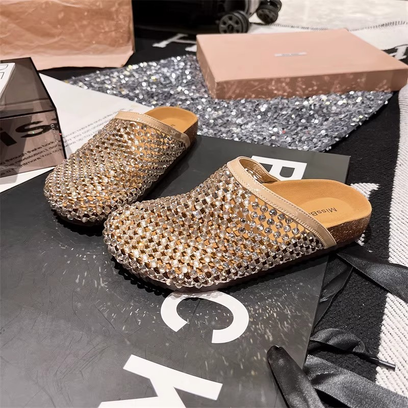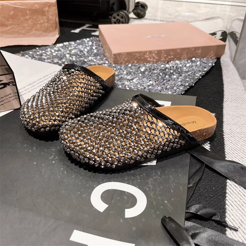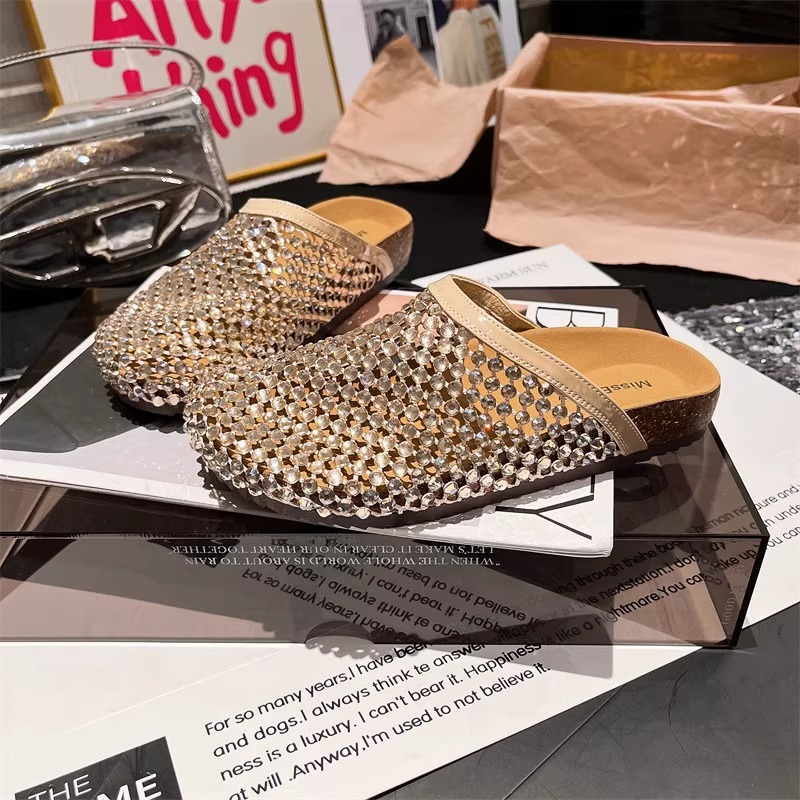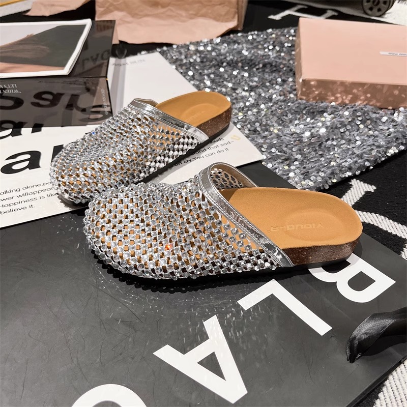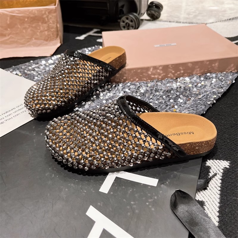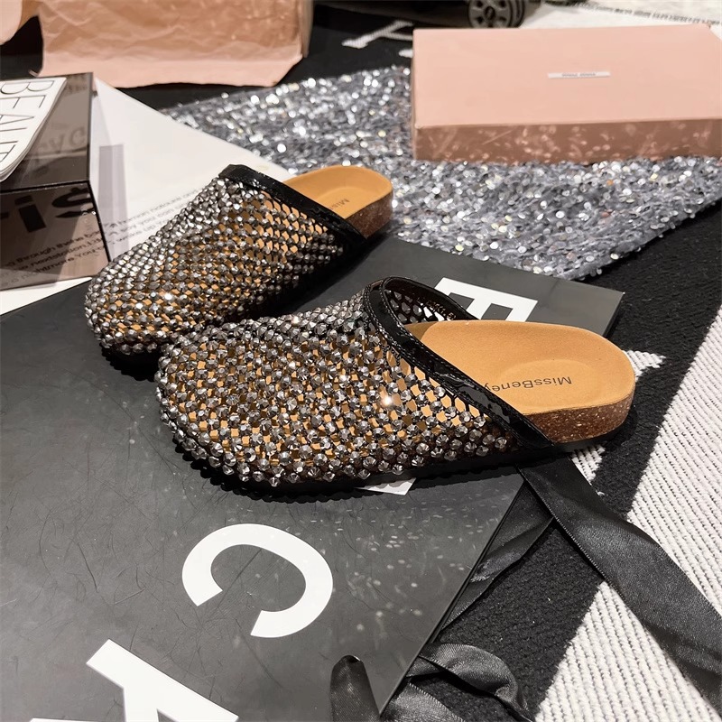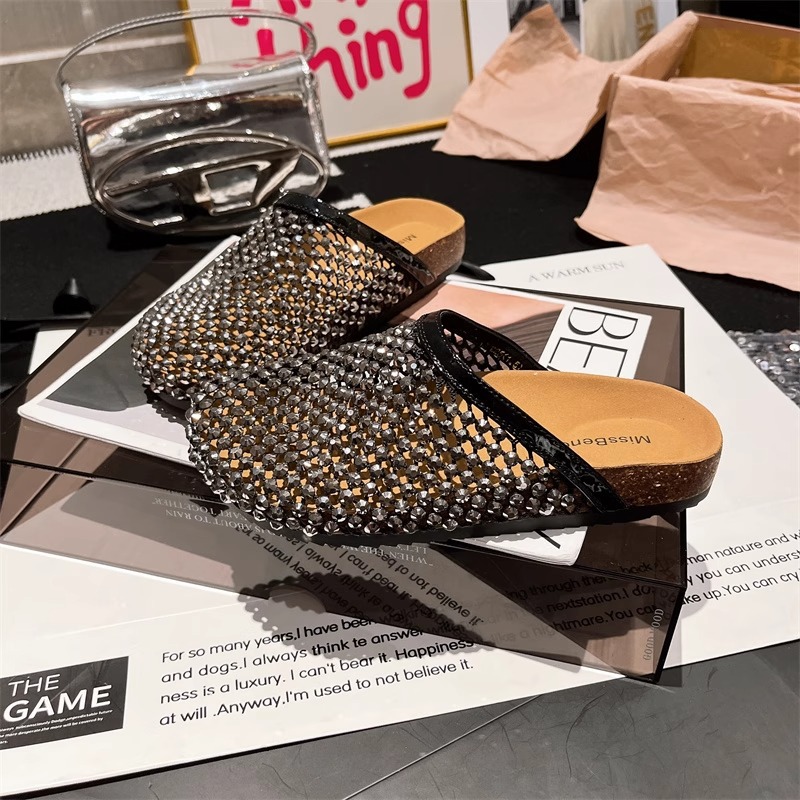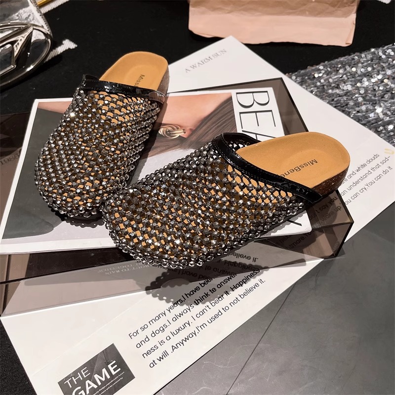 2025 verano diamantes de imitación diamantes red de pesca Baotou cabeza grande Baotou medias pantuflas sandalias zapatos de Tobken zapatos planos de mujer