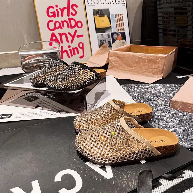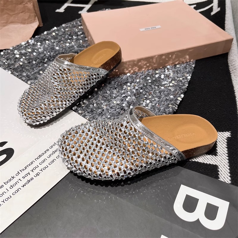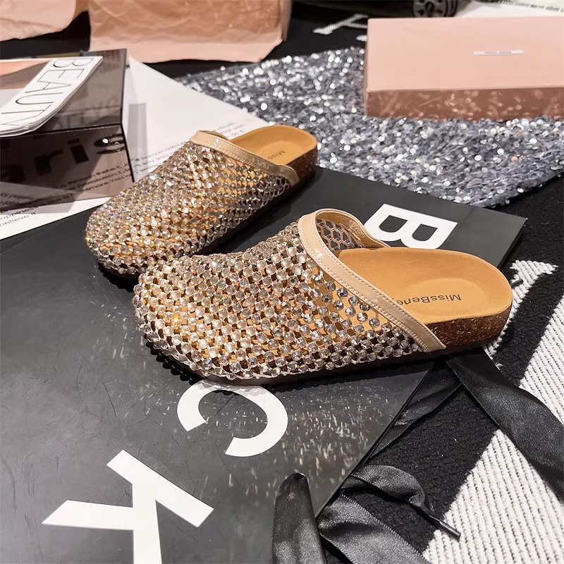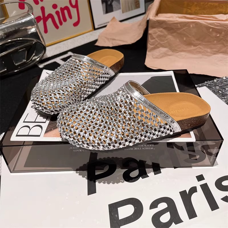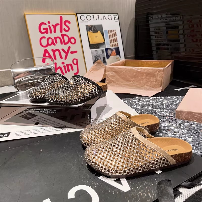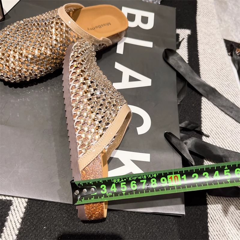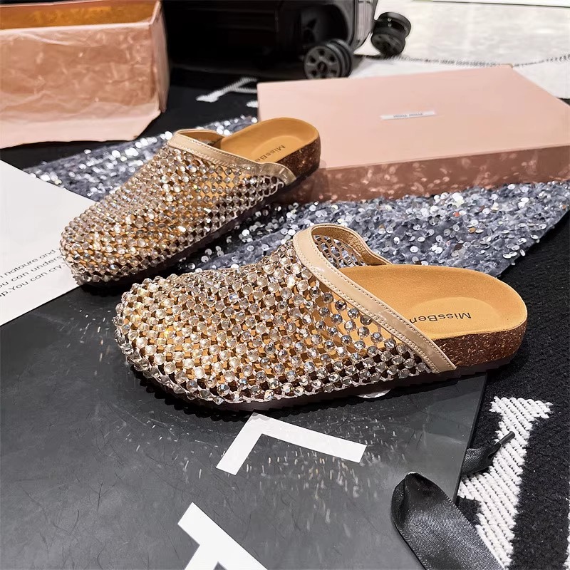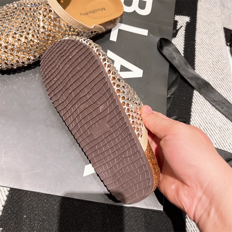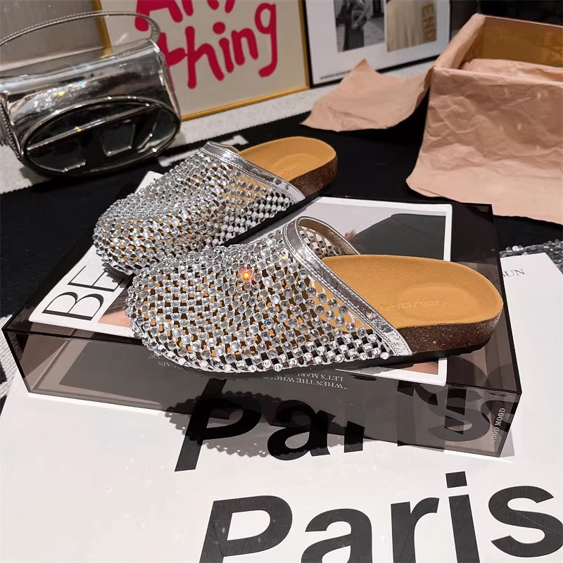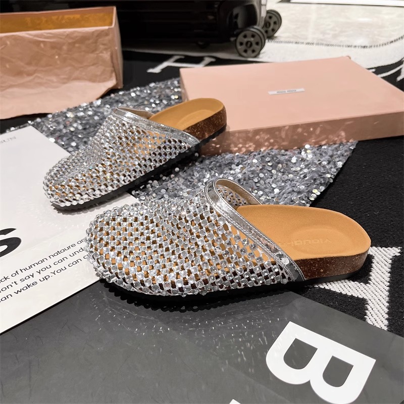 2025 verano diamantes de imitación diamantes red de pesca Baotou cabeza grande Baotou medias pantuflas sandalias zapatos de Tobken zapatos planos de mujer