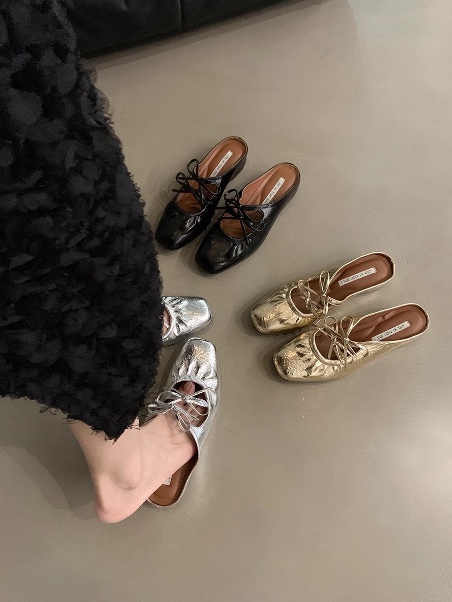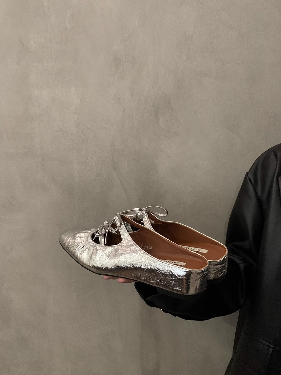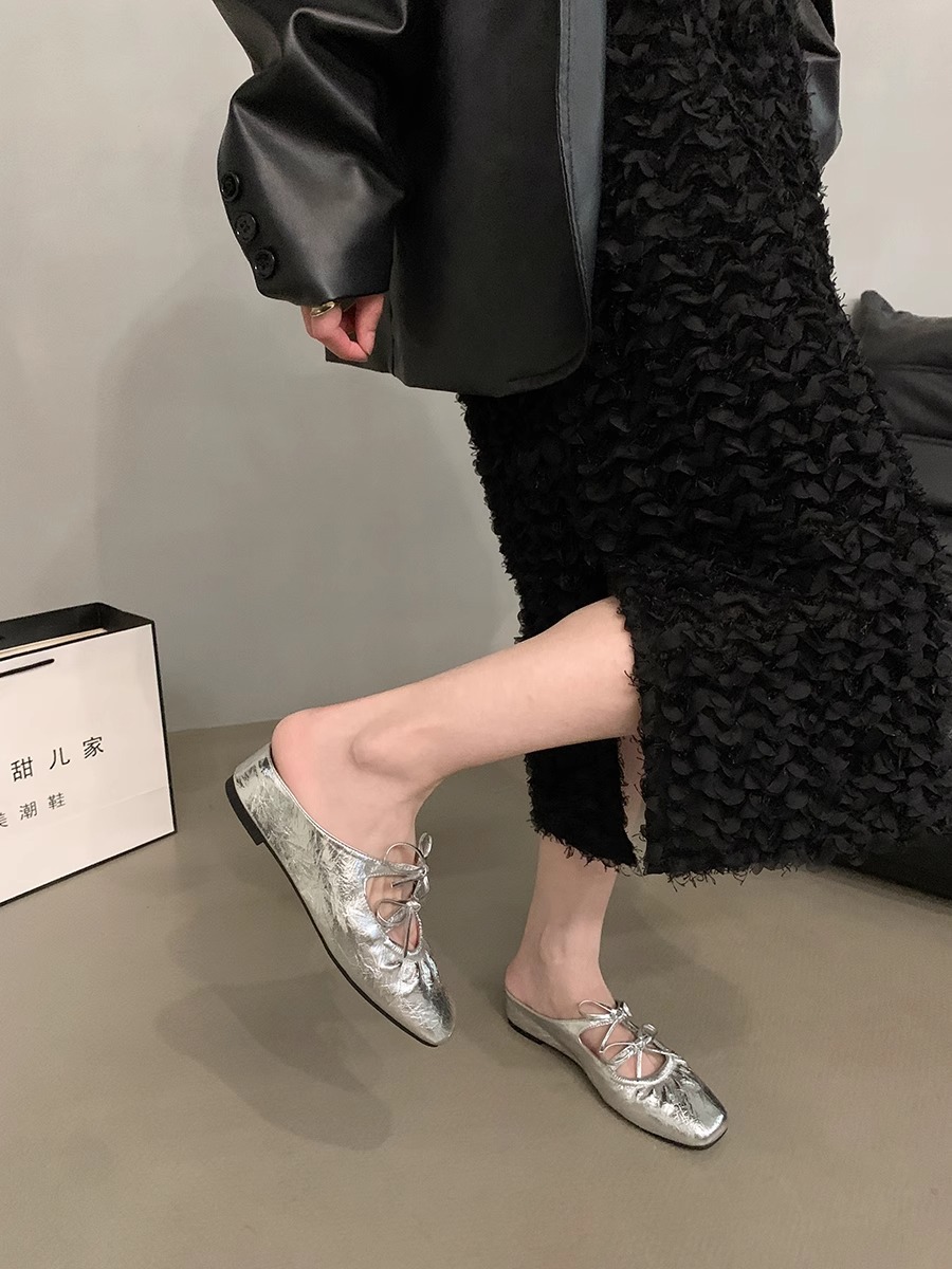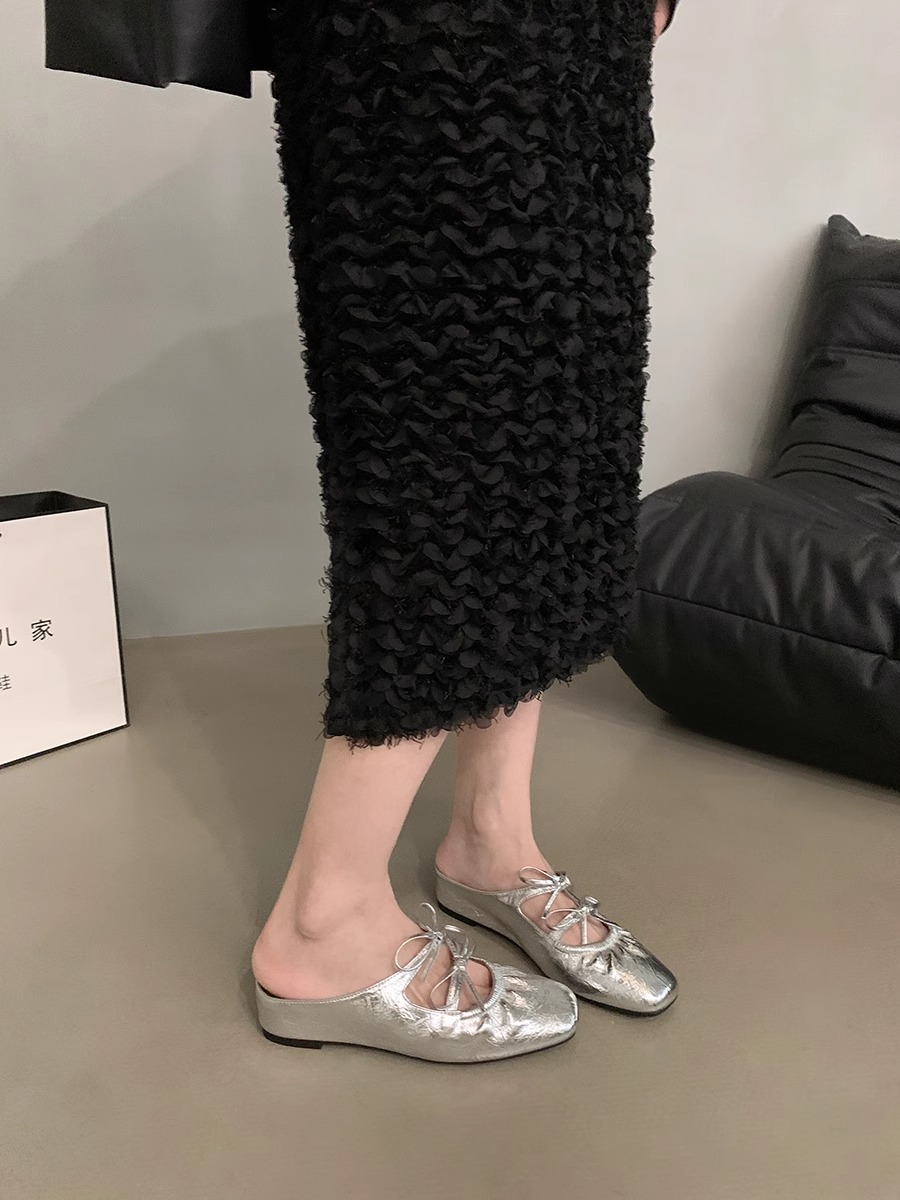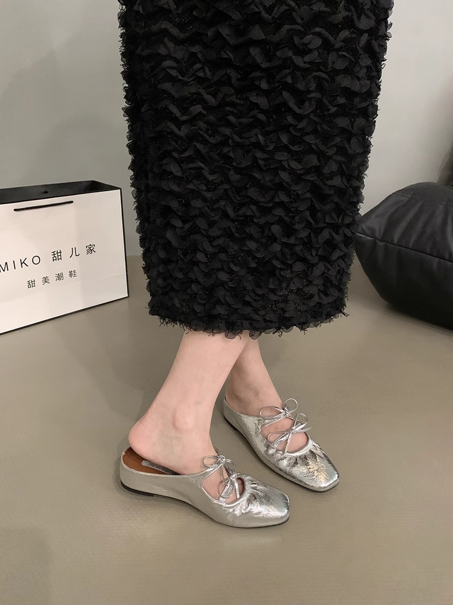 Inner realce bowknot plateado puntera medio arrastre zapatos de mujer moda exterior 2025 nuevas sandalias Mary Jane de verano