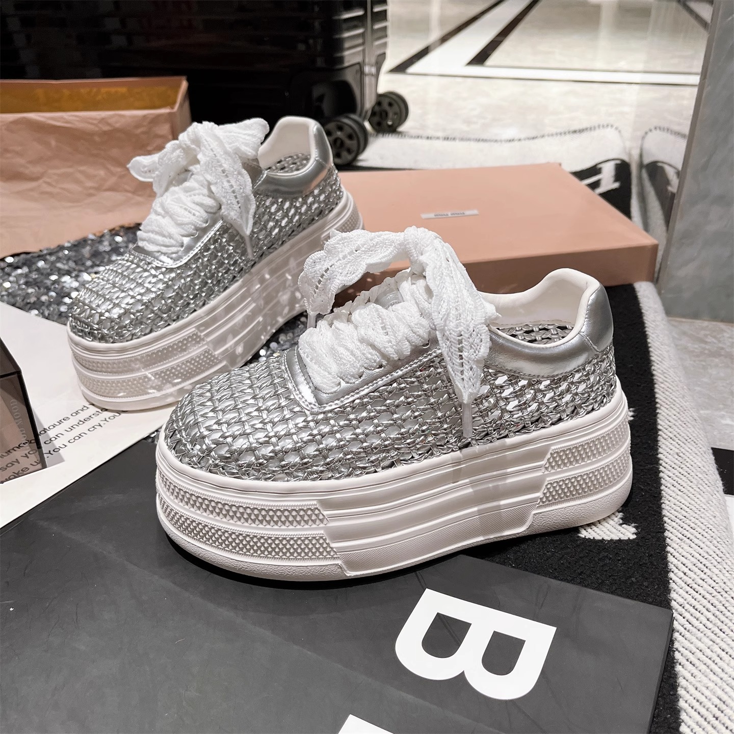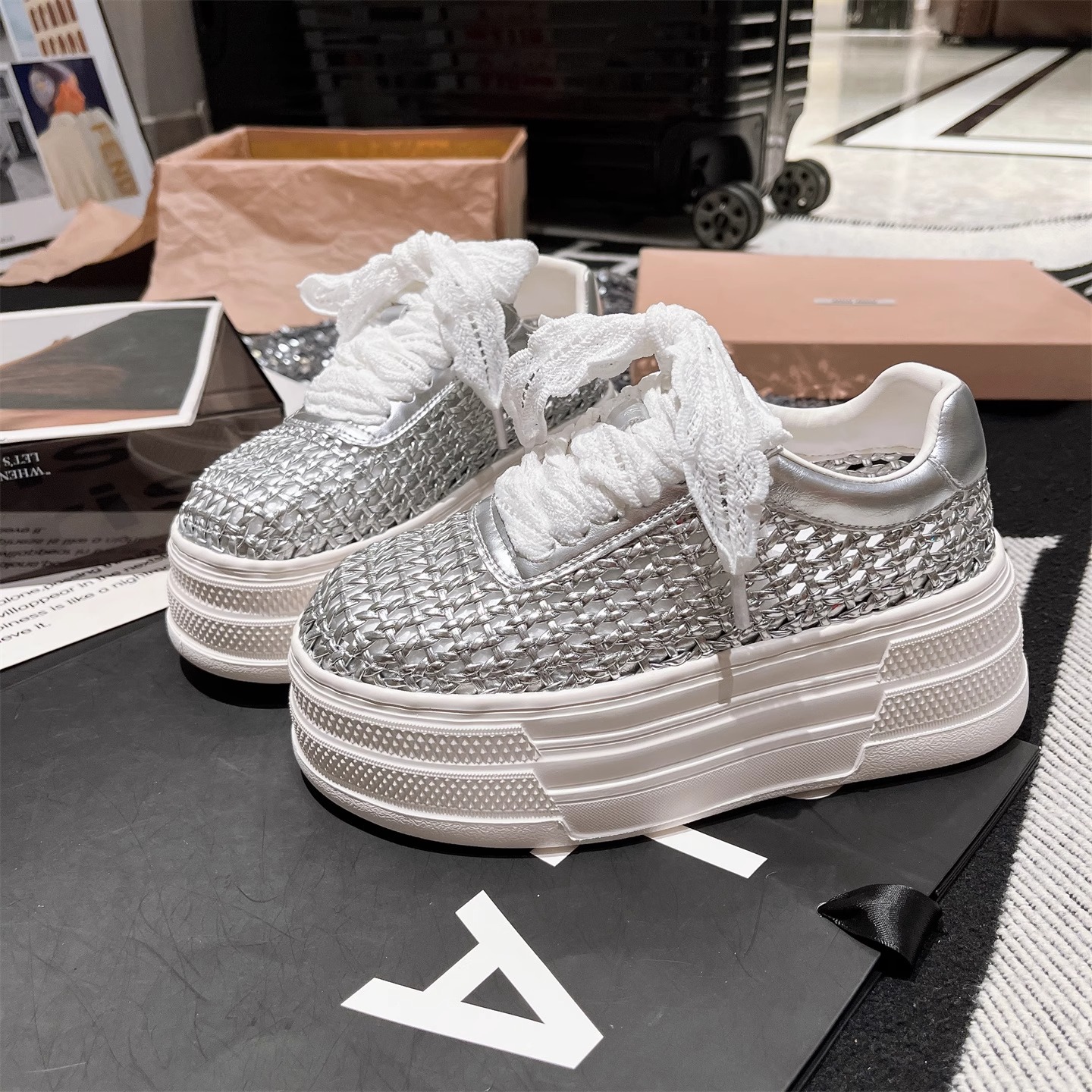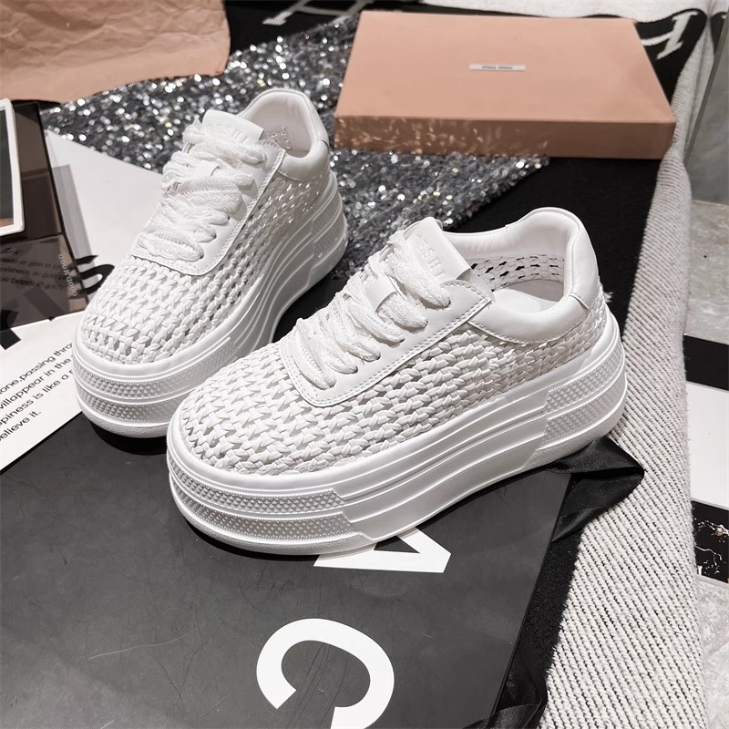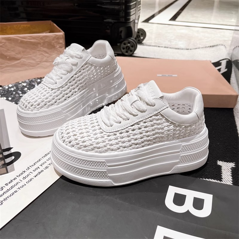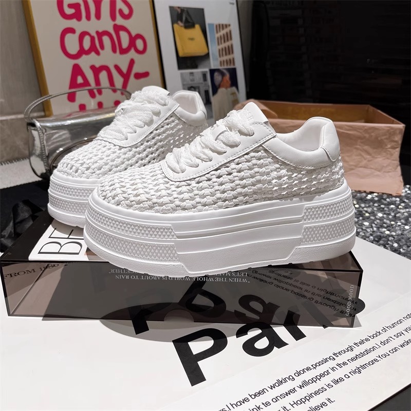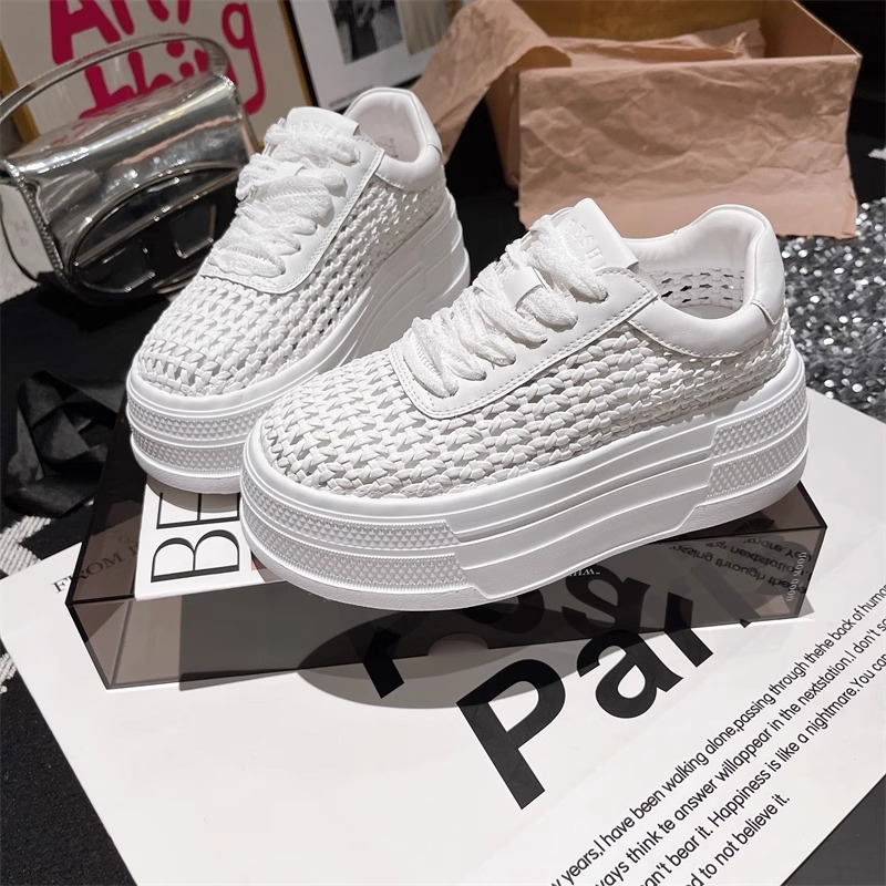 2025 nuevo estilo zapatos casuales de altura de suela gruesa zapatos huecos tejidos de cuero zapatos de mujer pequeños zapatos blancos zapatos deportivos