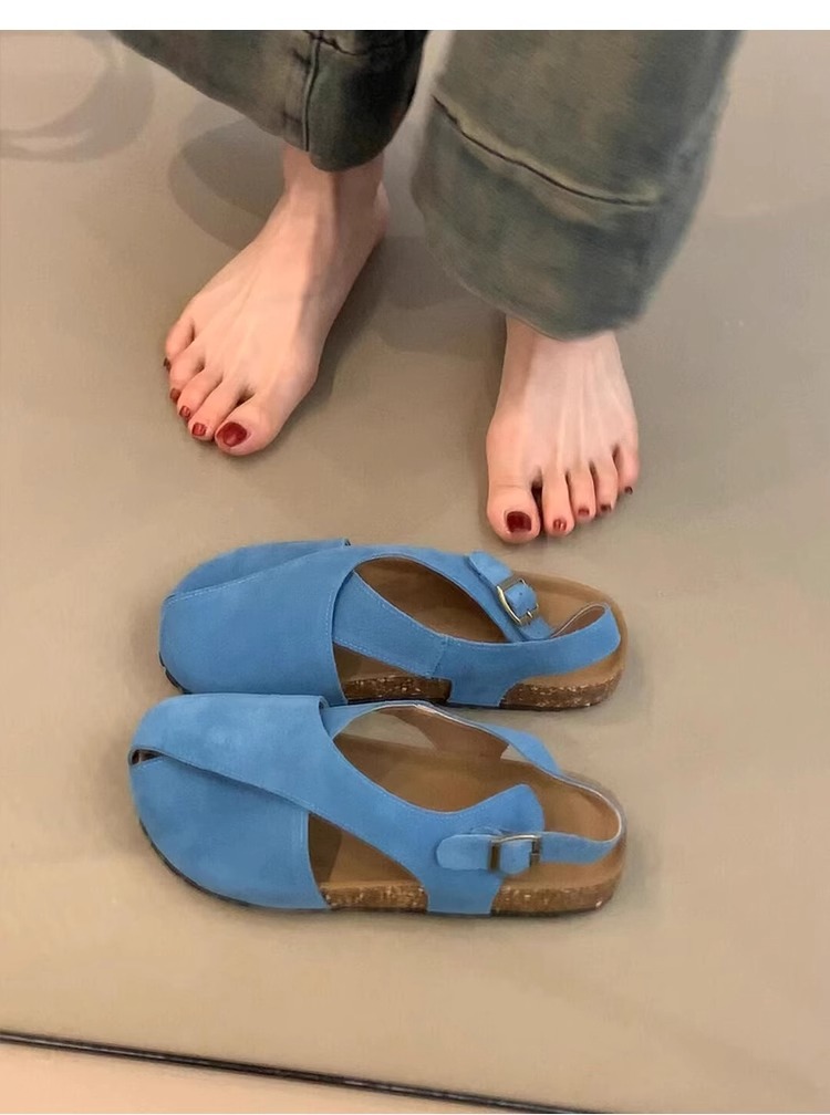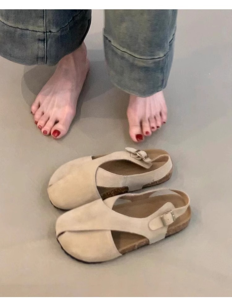 Versión de piel de oveja ~ Nuevas sandalias planas de cuero esmerilado de punta redonda con hebilla de una palabra para mujer
