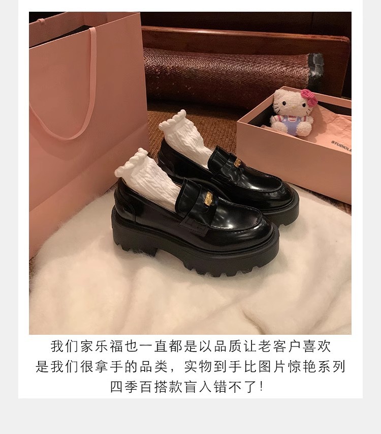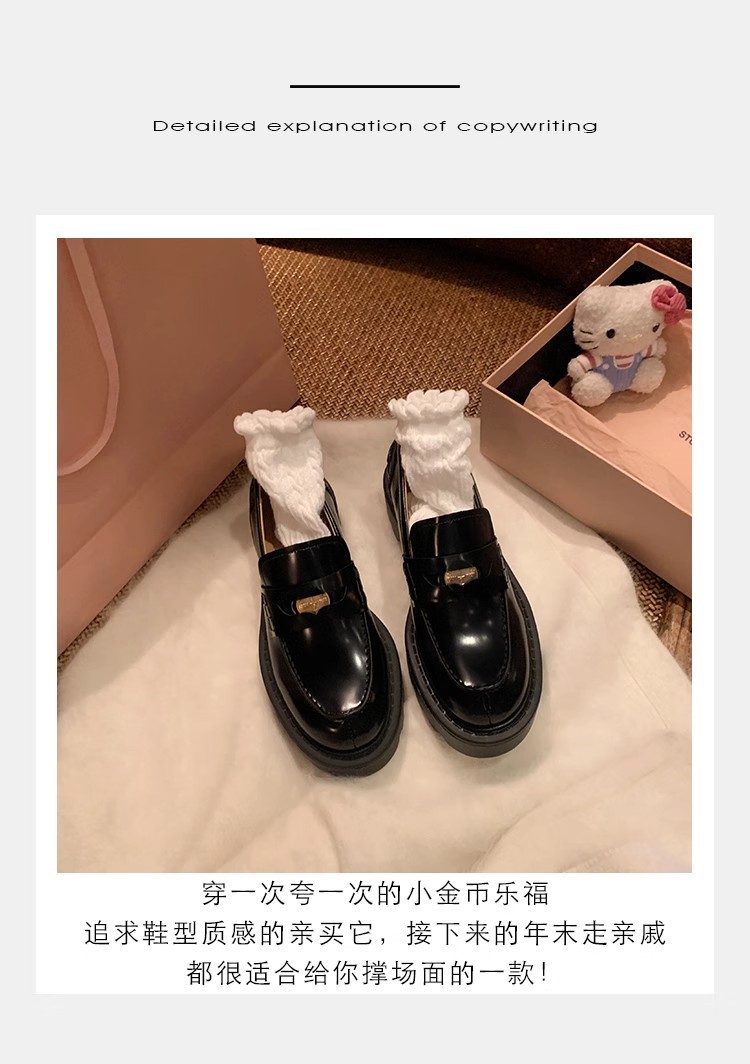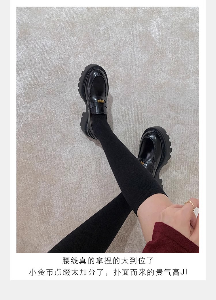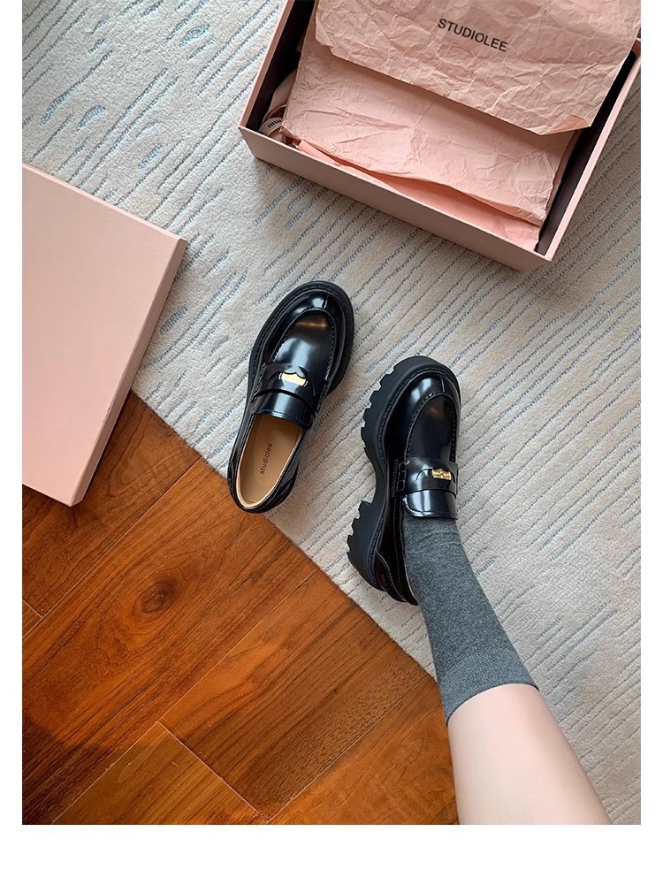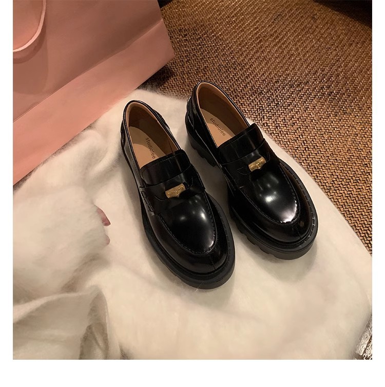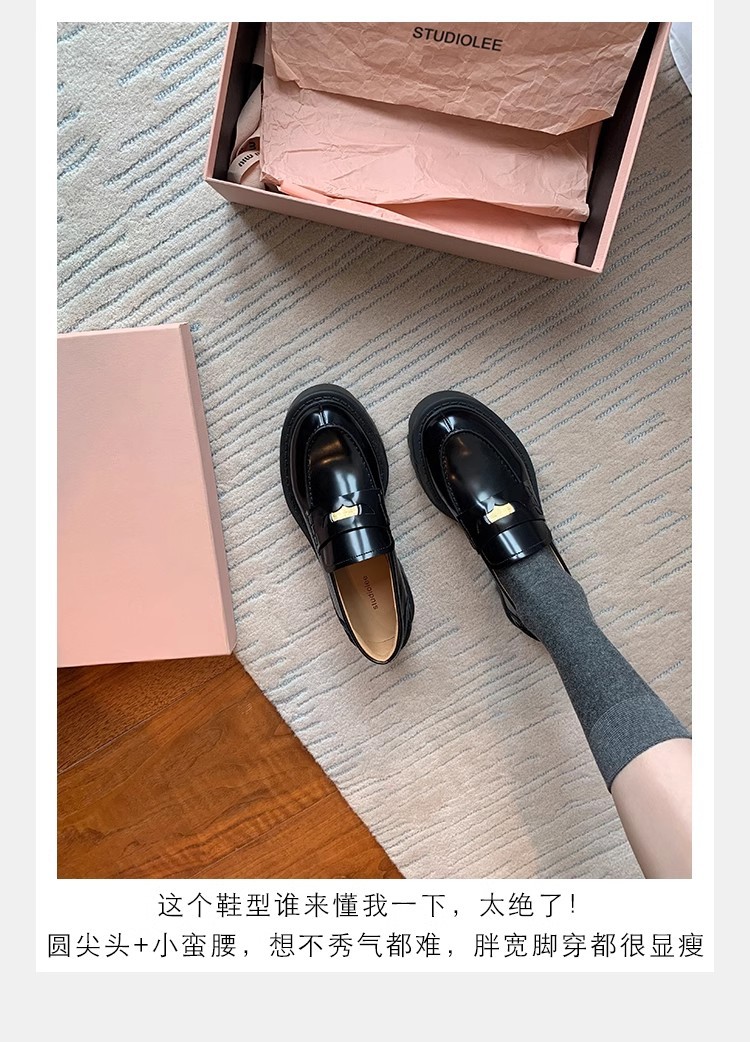 Versión de piel de vaca ~ Grape Mom mismo estilo, moneda de oro pequeña, punta redonda, tacón grueso, zapatos Lefu, zapatos de cuero de plataforma para mujer