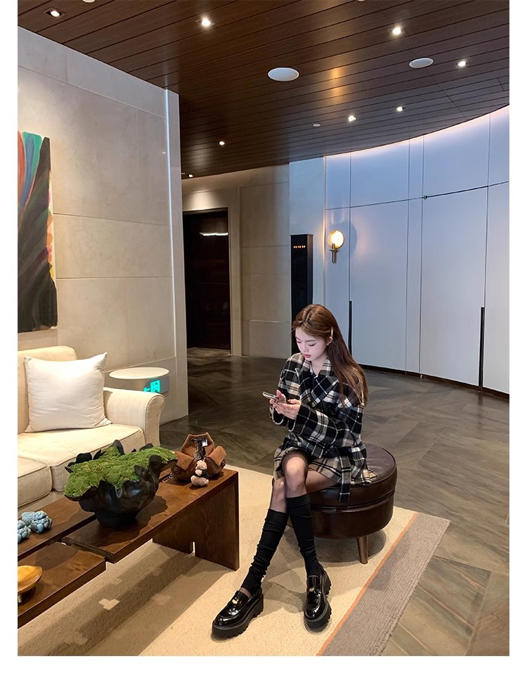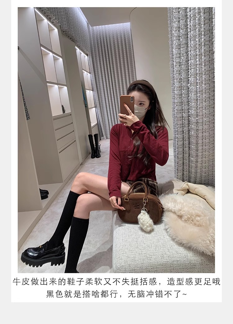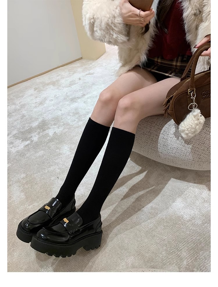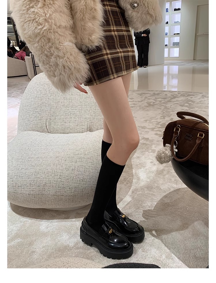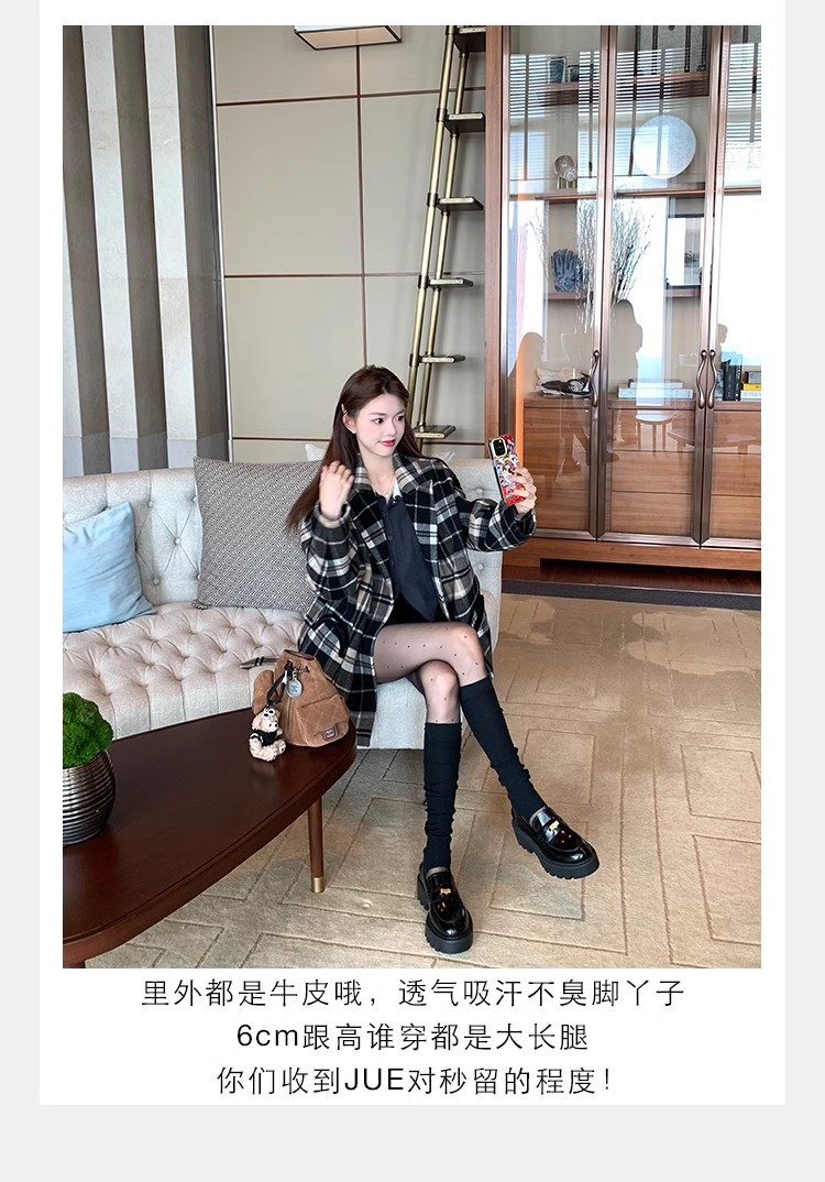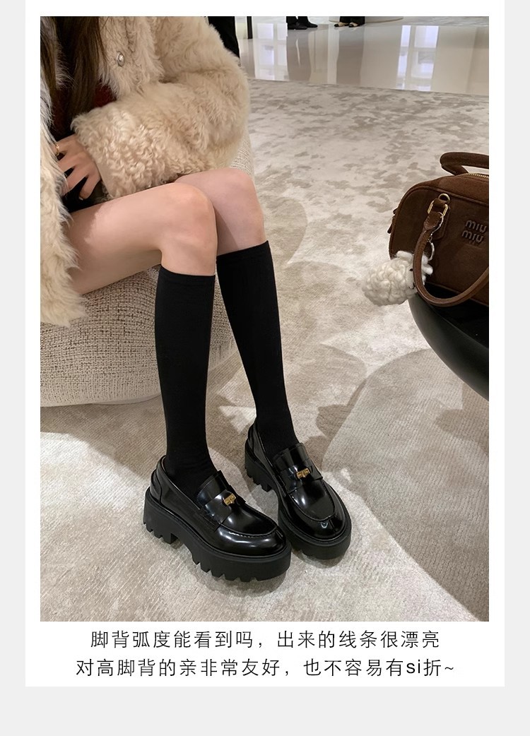 Versión de piel de vaca ~ Grape Mom mismo estilo, moneda de oro pequeña, punta redonda, tacón grueso, zapatos Lefu, zapatos de cuero de plataforma para mujer