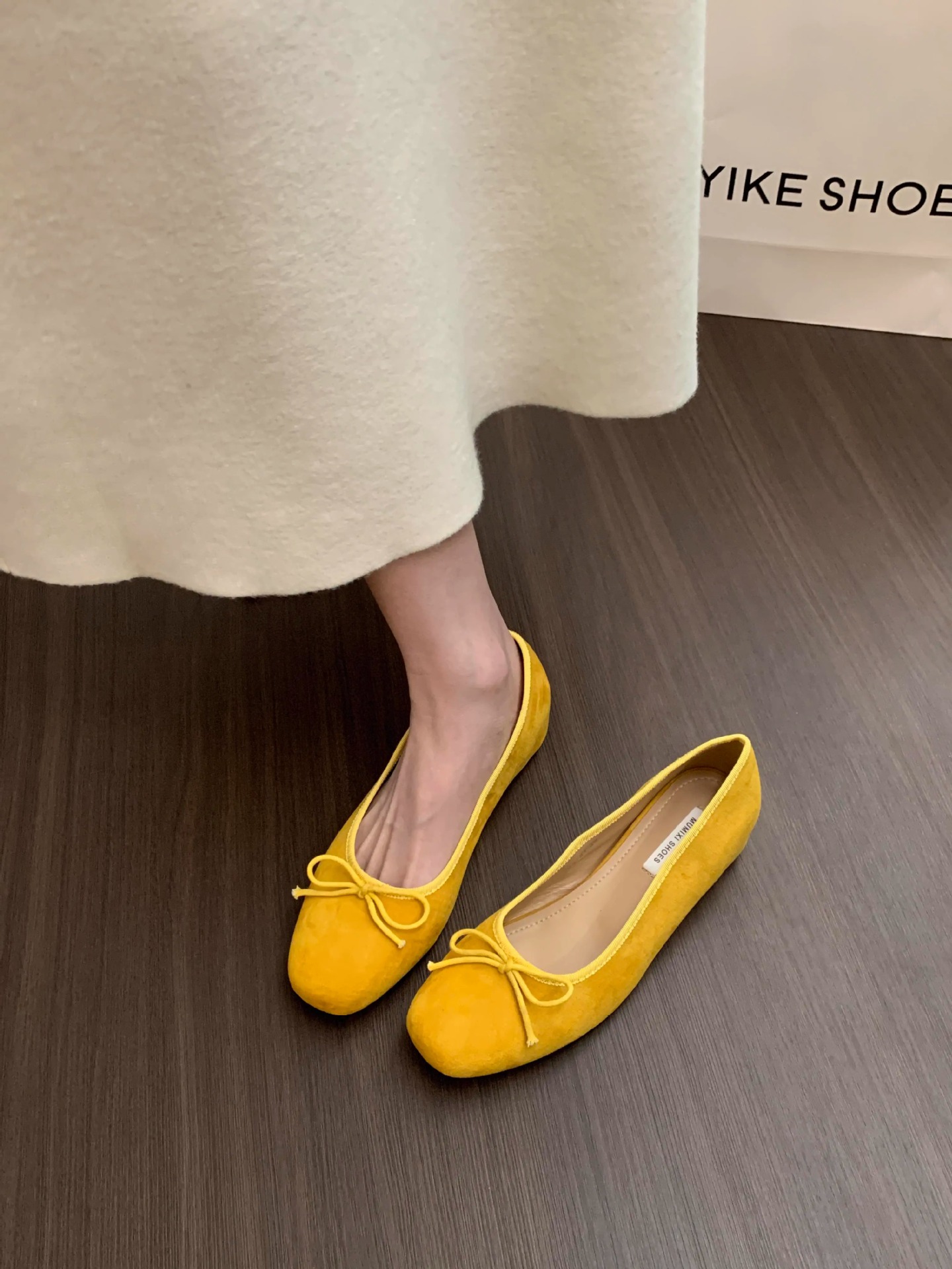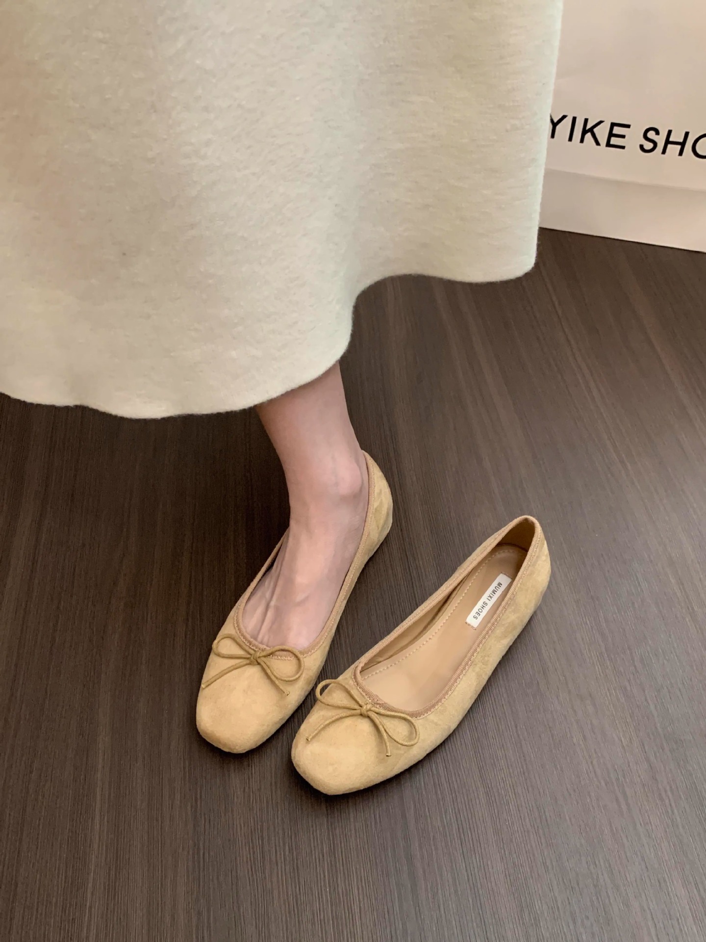 Zapatos individuales de ballet de gamuza realzados en estilo francés, zapatos de mujer 2025 nuevos zapatos de noche rojos con lazo de primavera y otoño