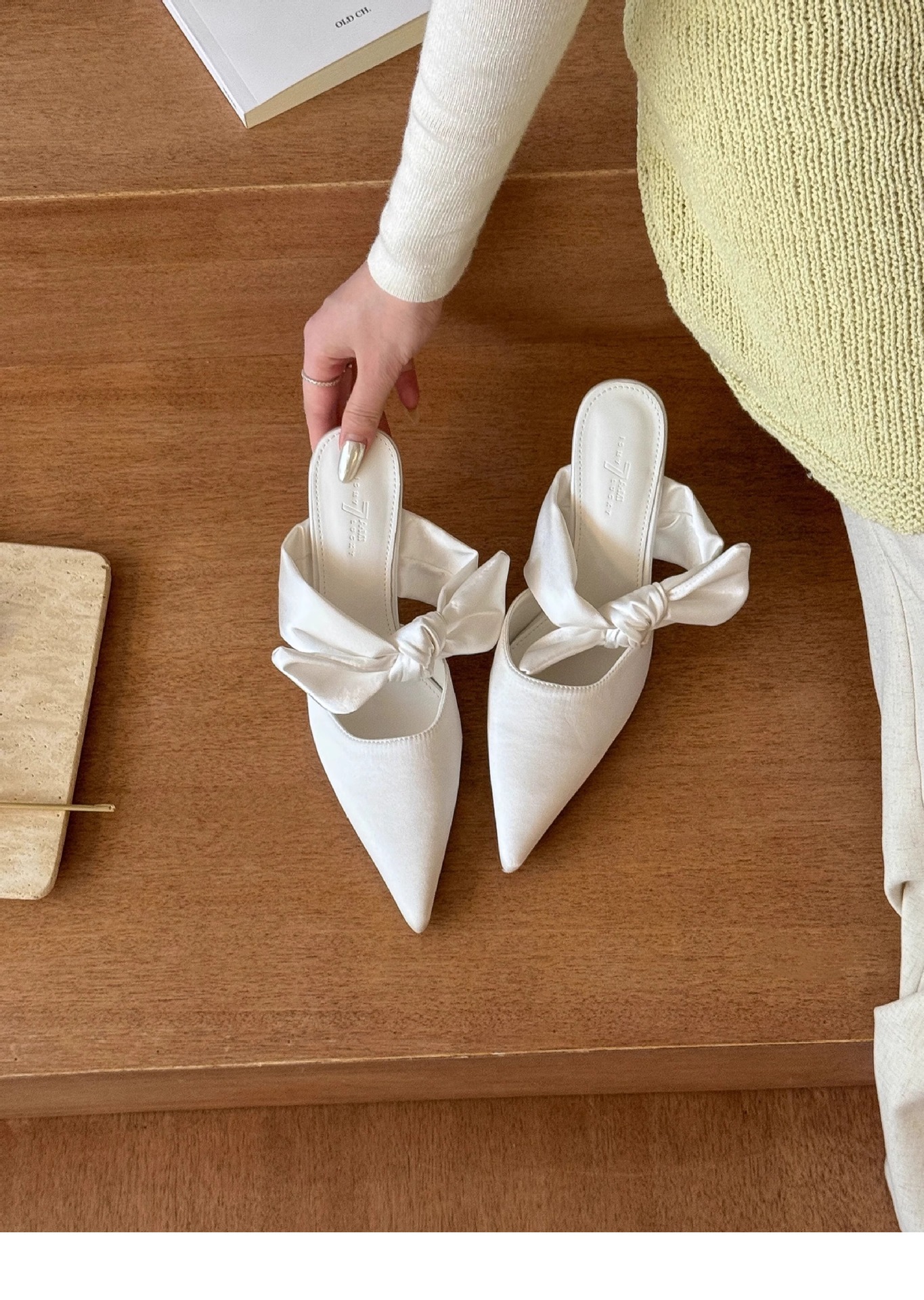 ¡Elingstudio Naibai Senior! Satén puntiagudo bowknot Muller tacones de aguja mujer puntera media pantufla