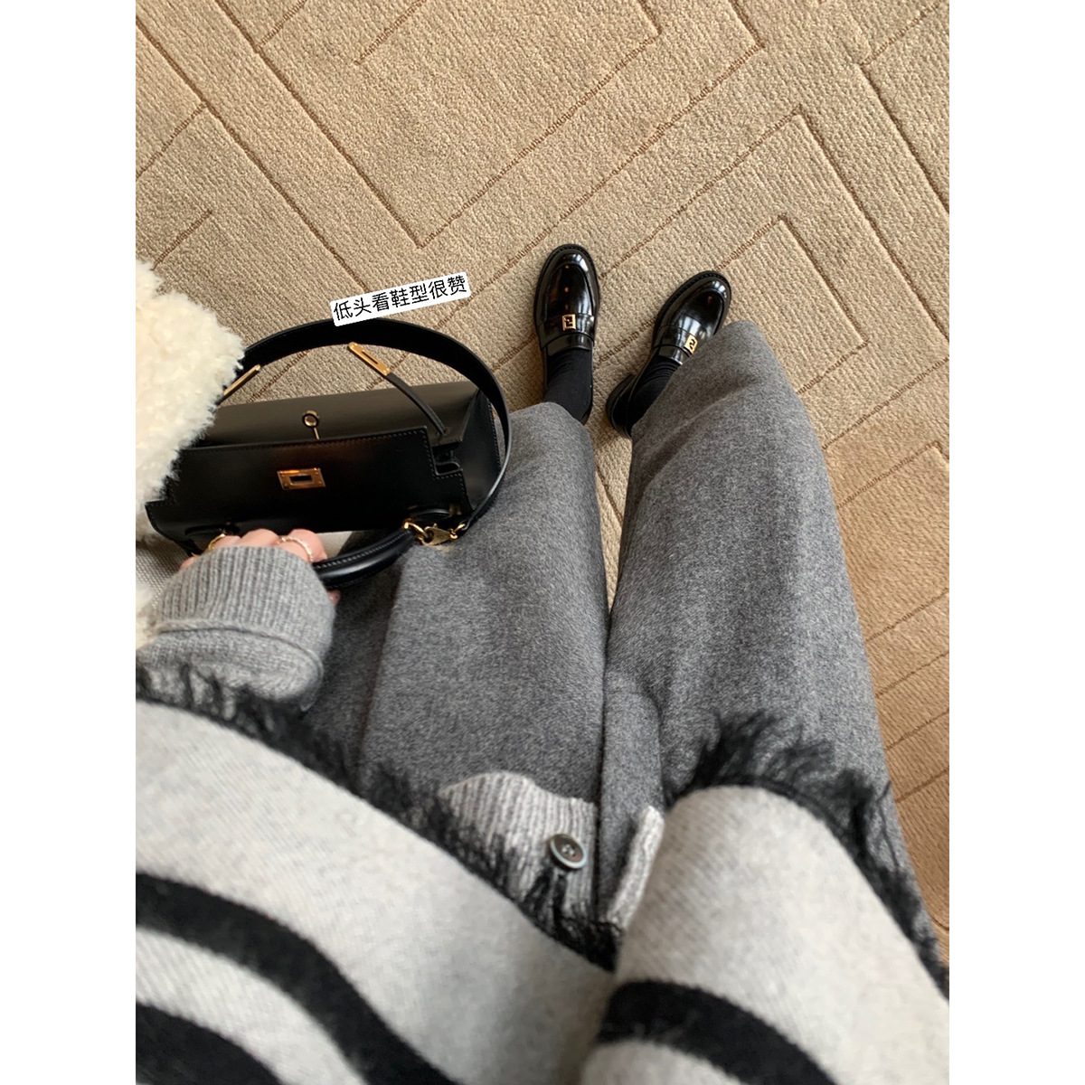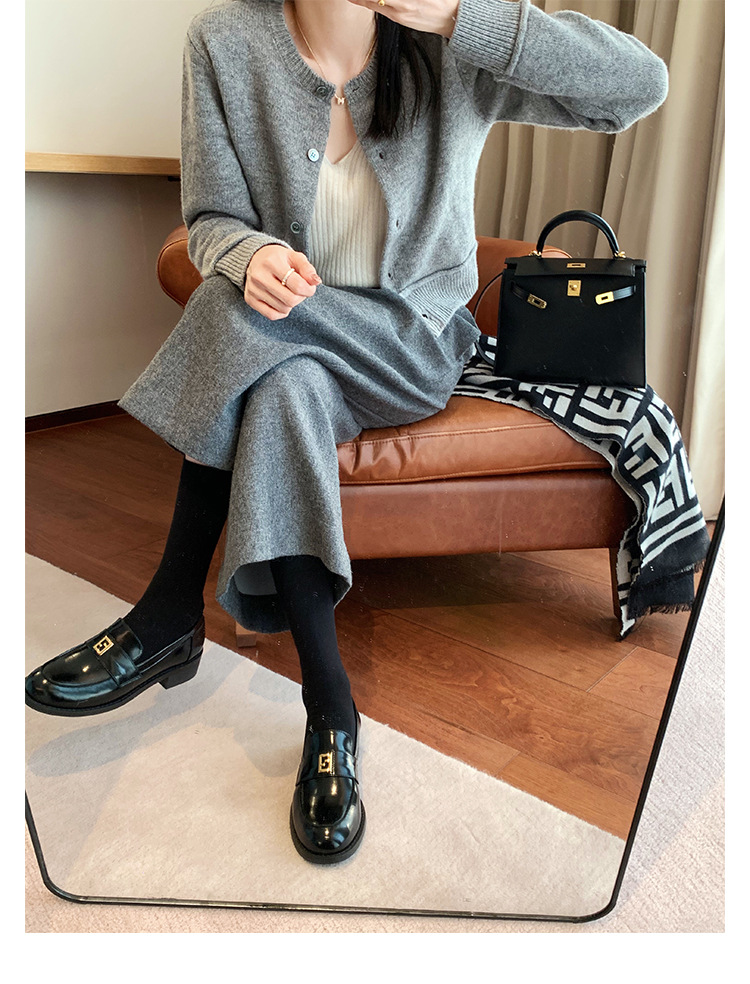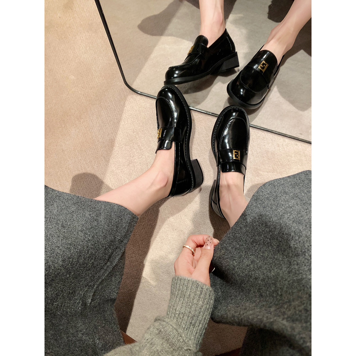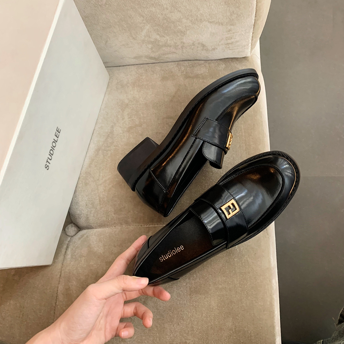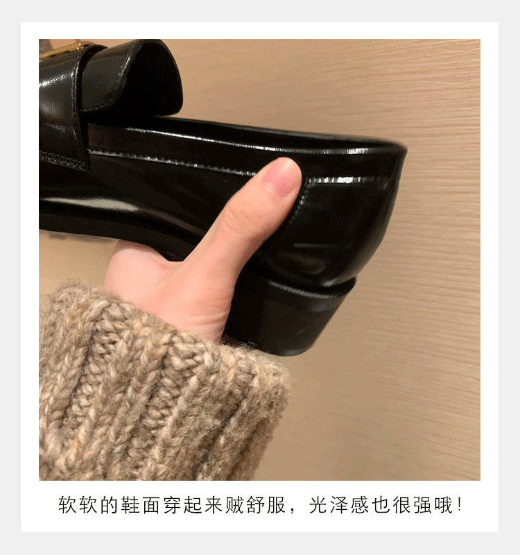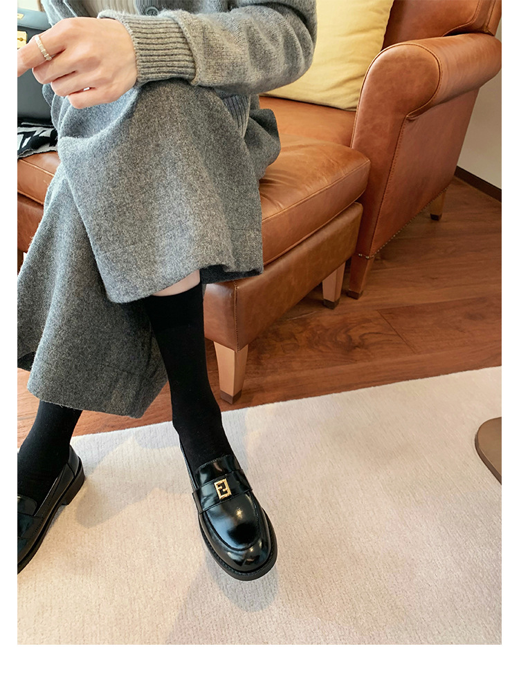 Grape Mom primavera nuevo estilo dorado pequeño botón cuadrado estilo británico cabeza redonda salvaje tacón grueso Lefu zapatos de cuero pequeño mujer