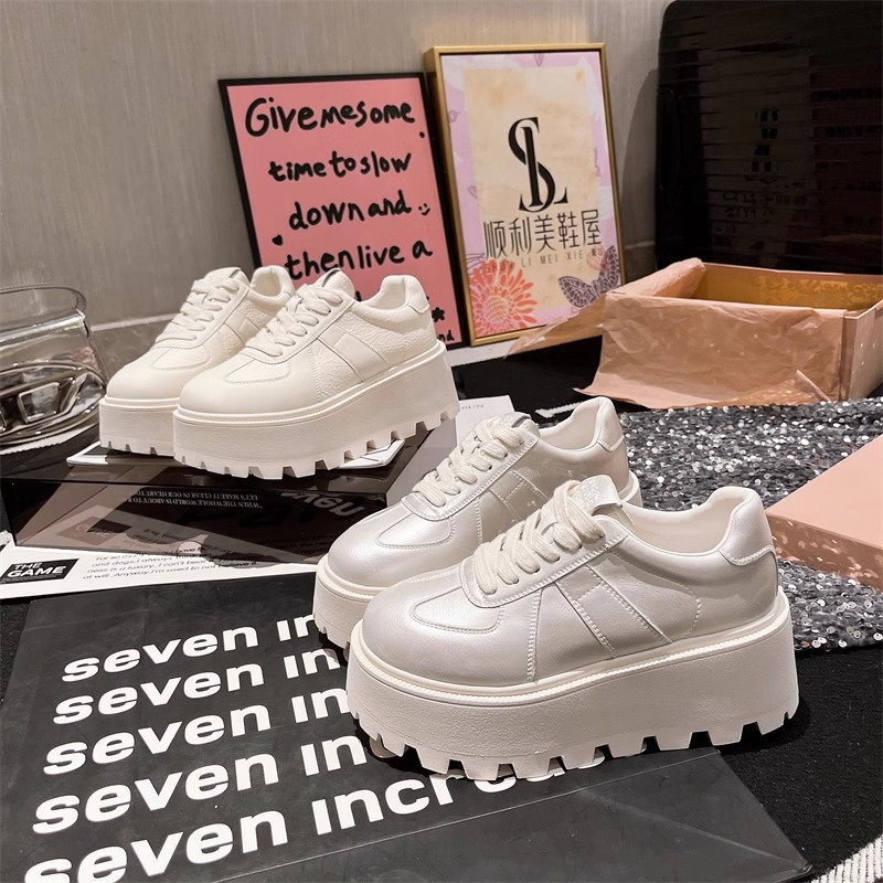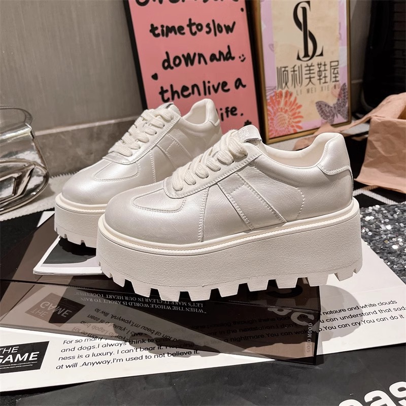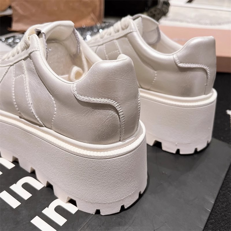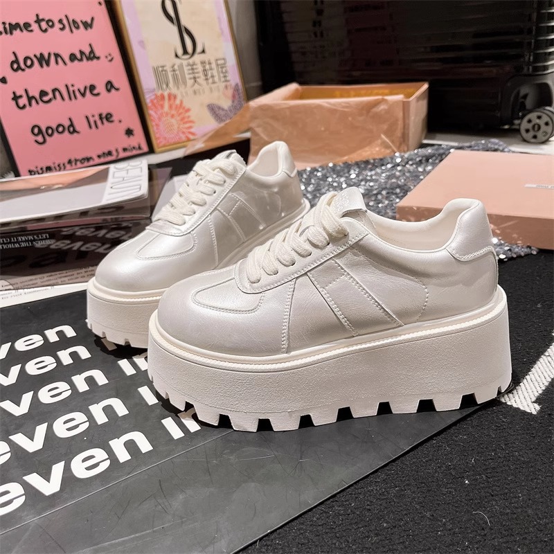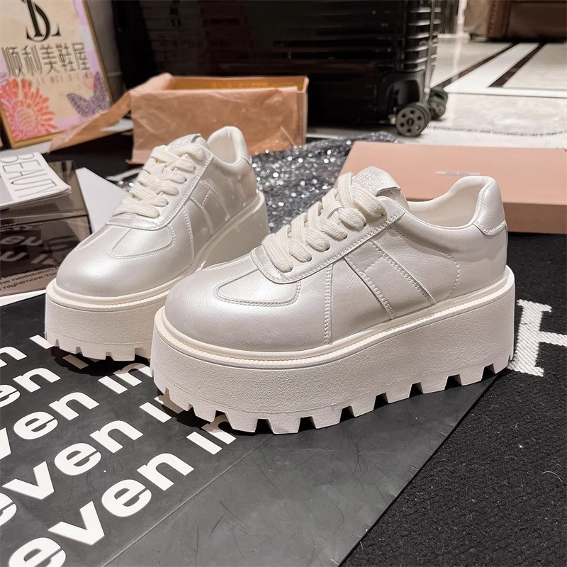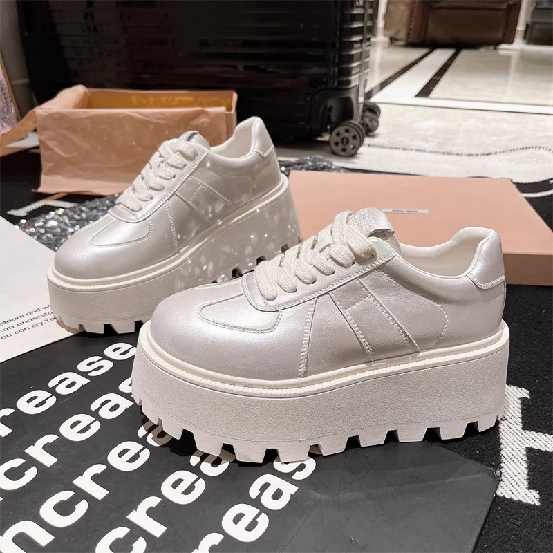 Muffins de cuero de fondo grueso, zapatos blancos perlados, zapatos de skate casuales, zapatos de pan de entrenamiento, zapatos de altura para mujeres.