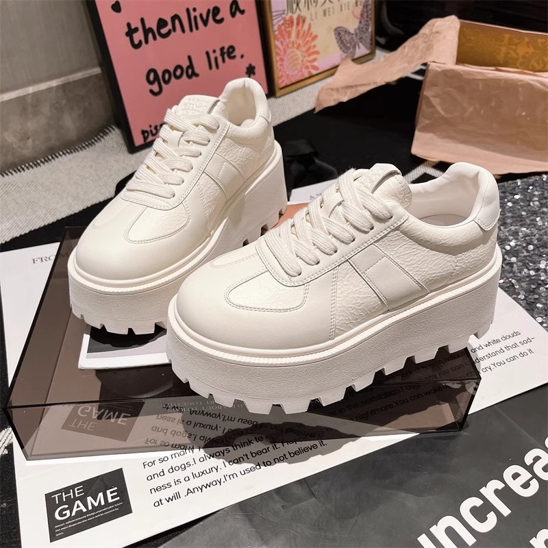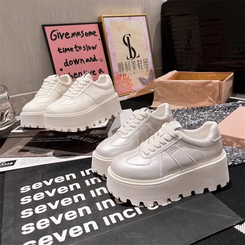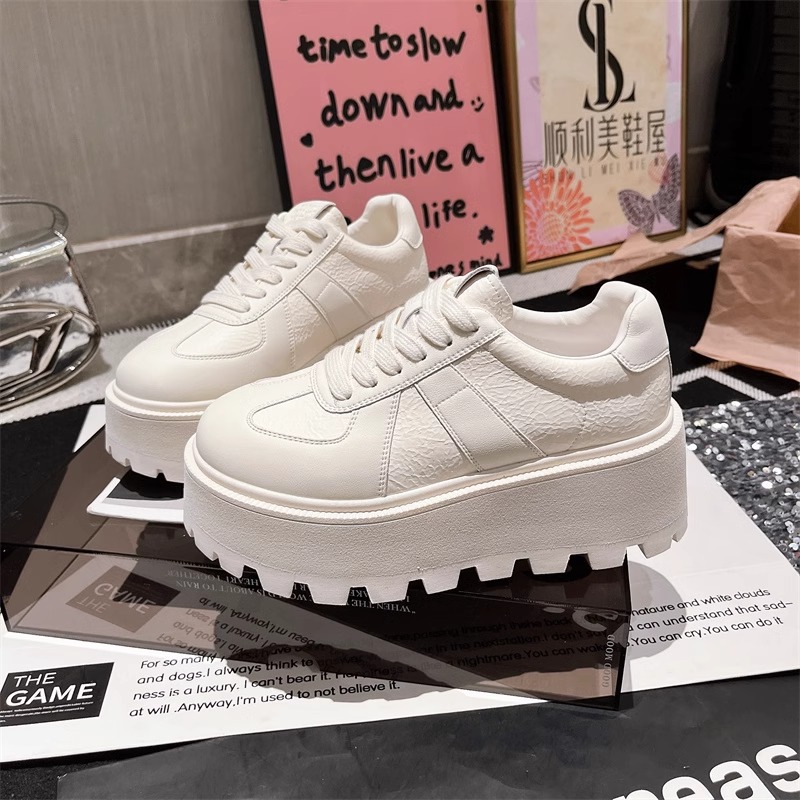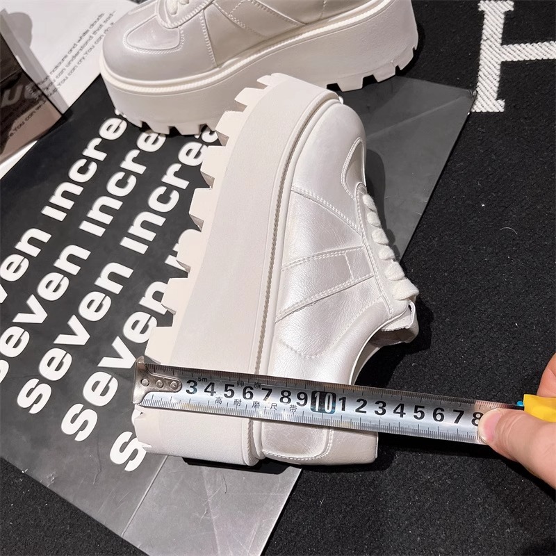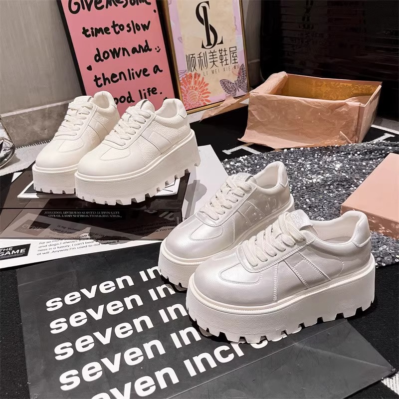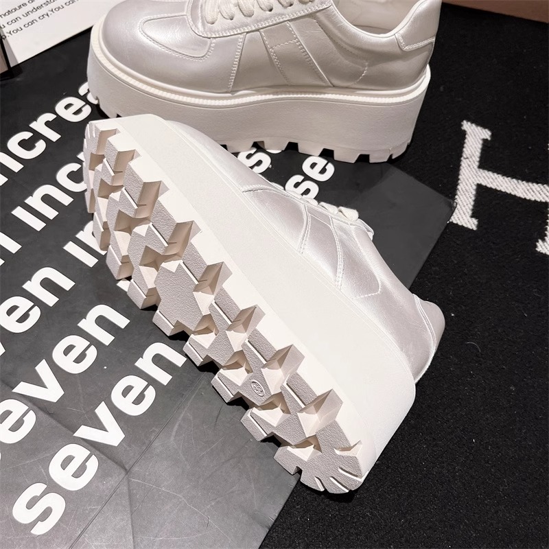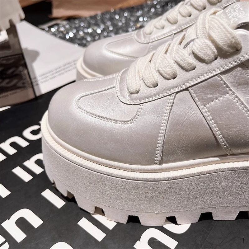 Muffins de cuero de fondo grueso, zapatos blancos perlados, zapatos de skate casuales, zapatos de pan de entrenamiento, zapatos de altura para mujeres.