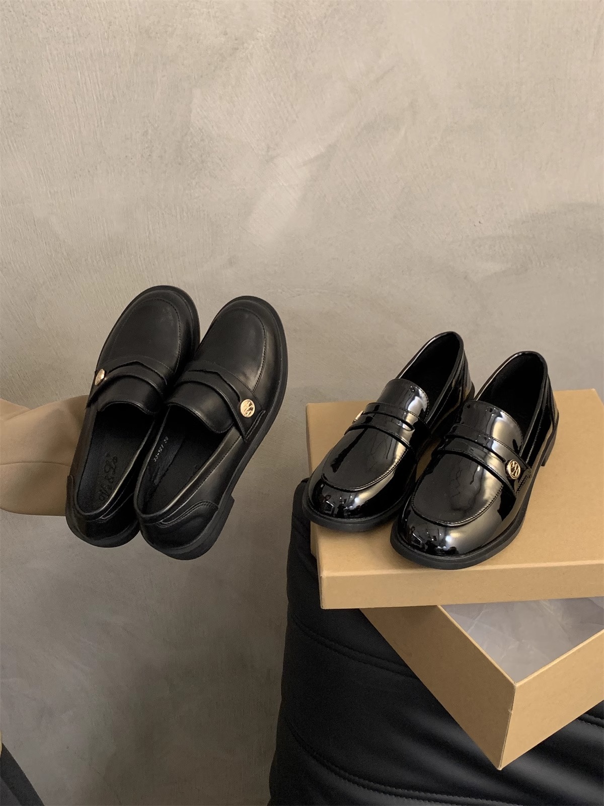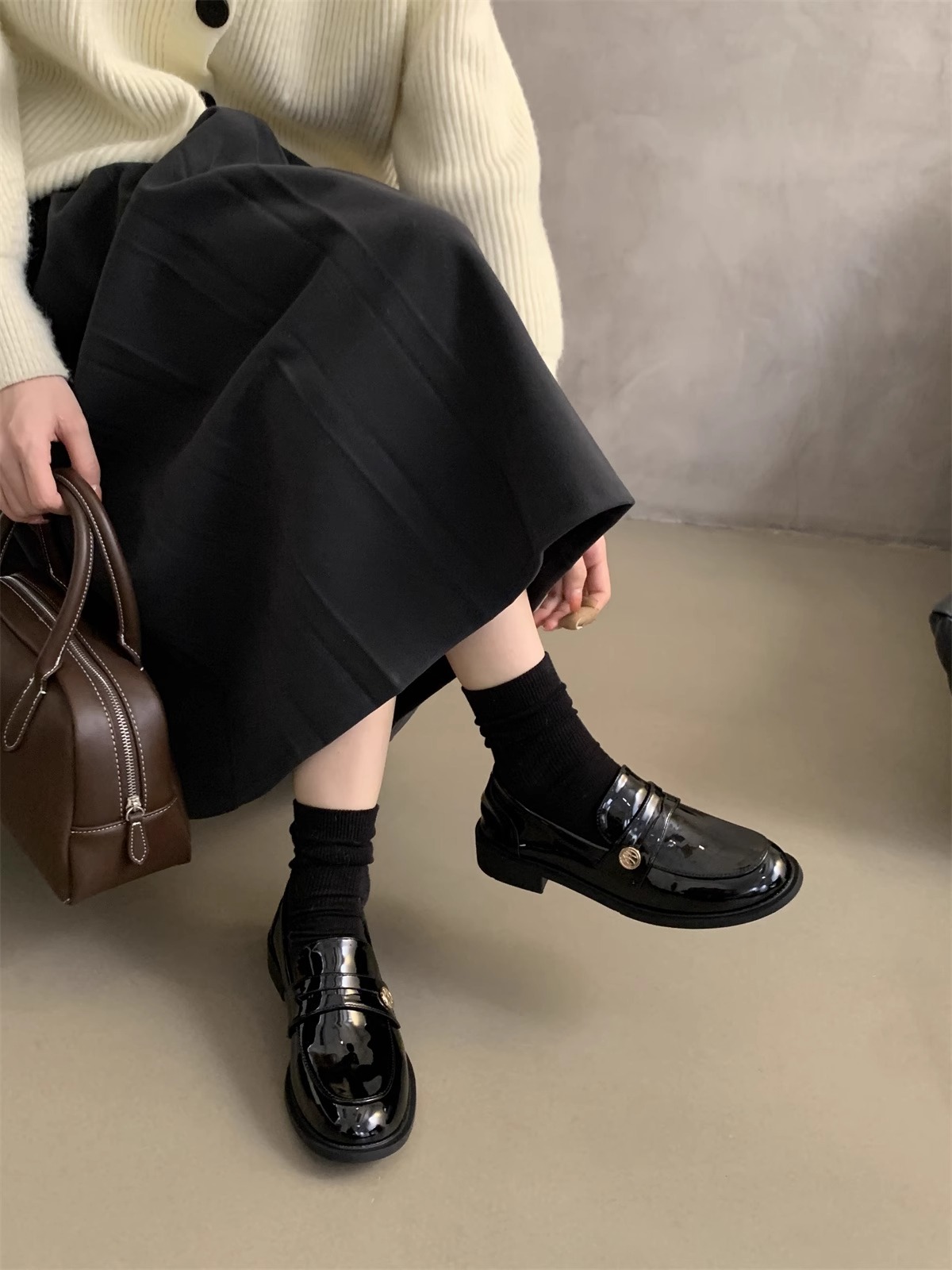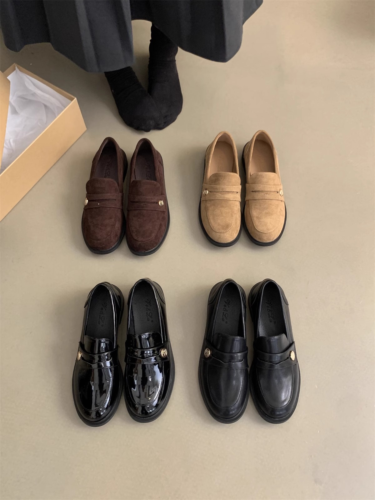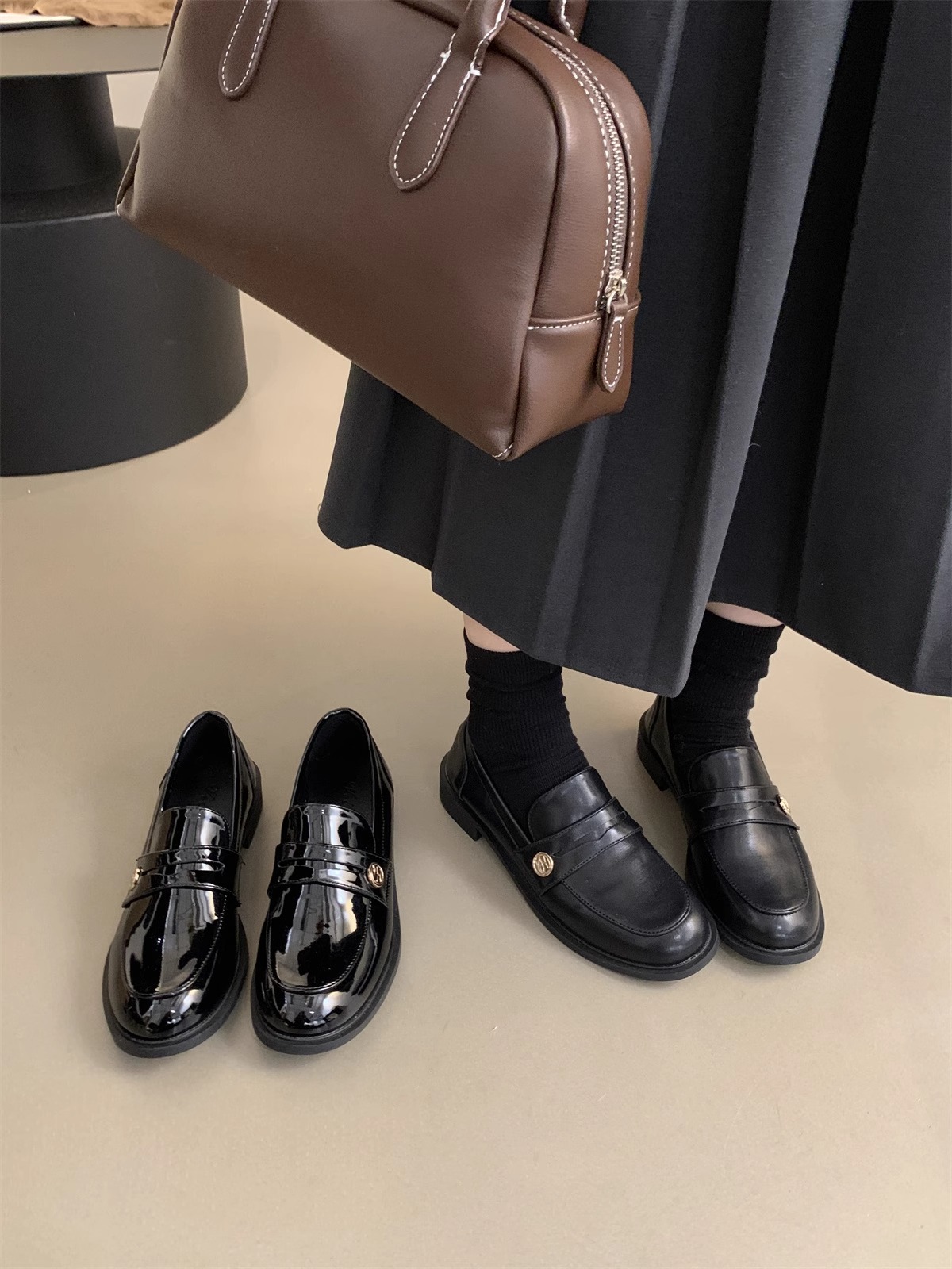 Zapatos de cuero pequeños británicos para mujer 2025 primavera nuevo estilo francés de estilo coreano cabeza redonda retro viaje un pie tacón grueso mocasines