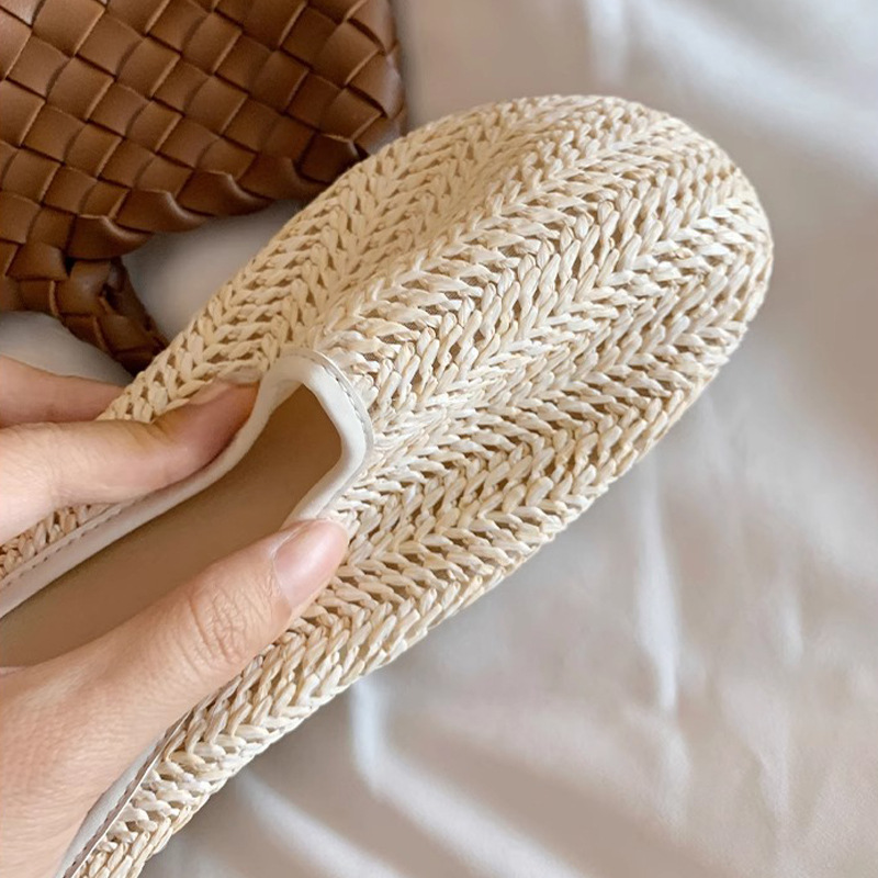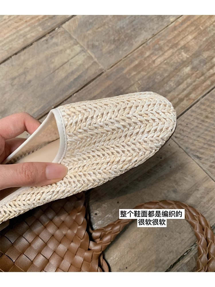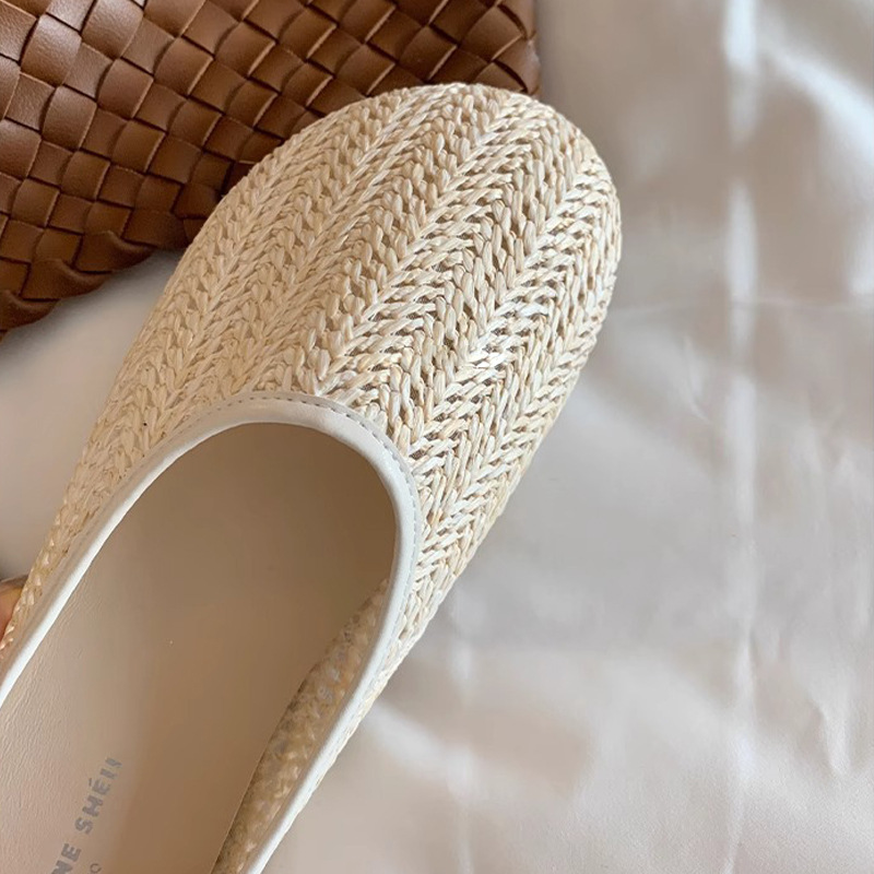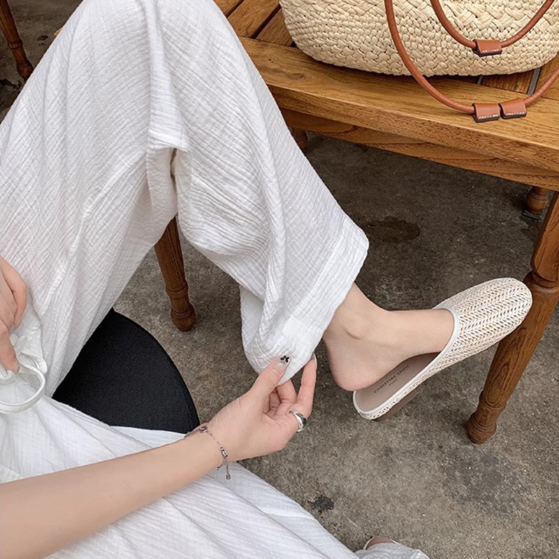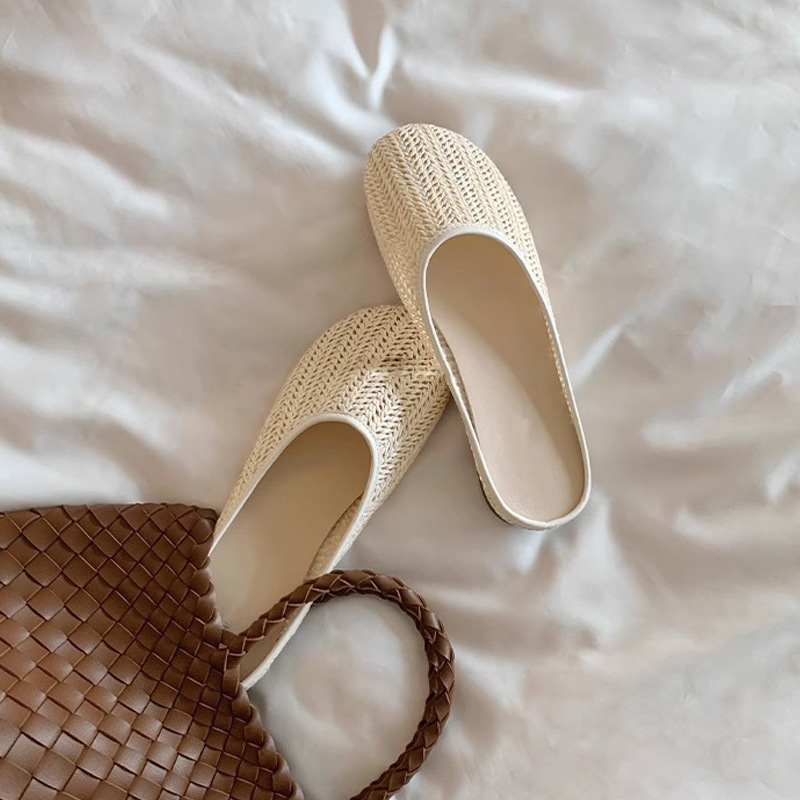 Vacaciones en Bangkok ~ Zapatillas de puntera transpirables tejidas retro para mujer, zapatillas de playa de suela blanda de verano