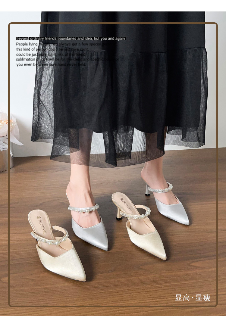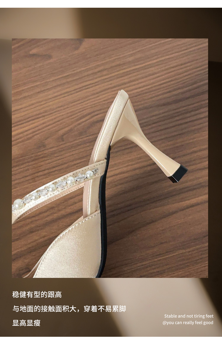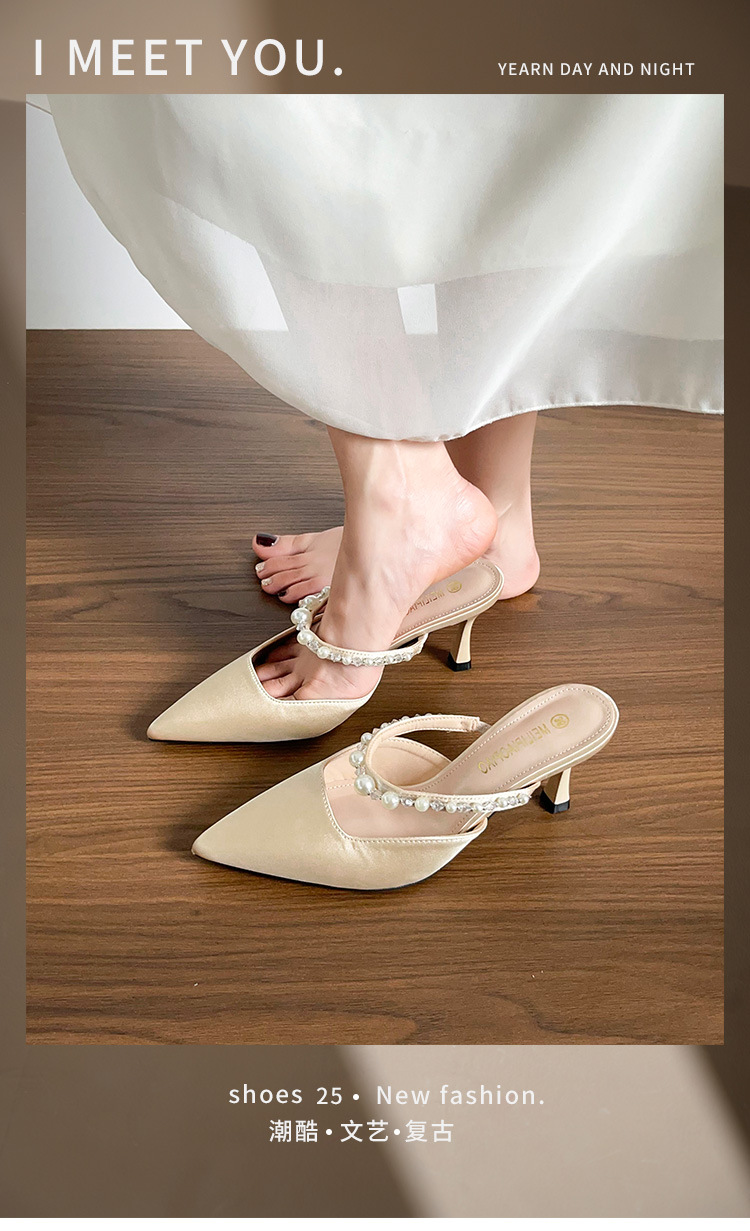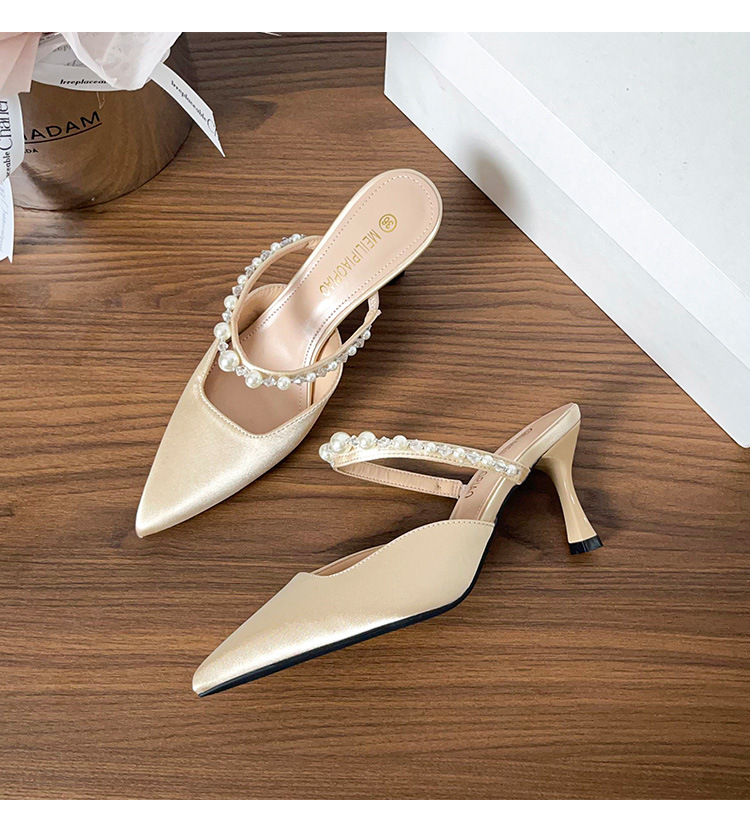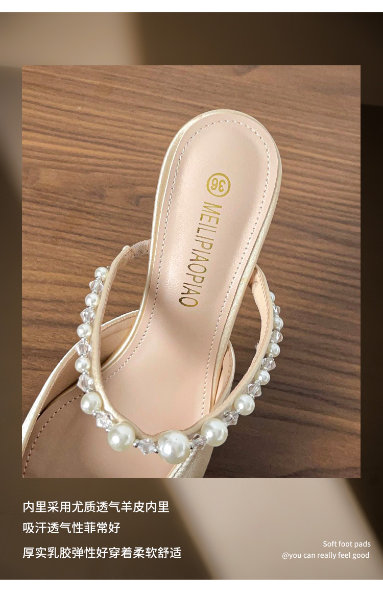 Versión de piel de oveja ~ Sandalias Baotou mujeres de verano con falda puntiaguda con pantuflas de tacón de aguja de perlas