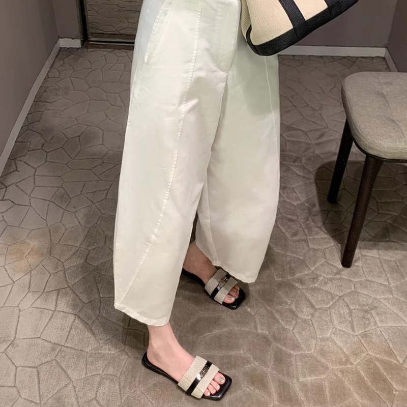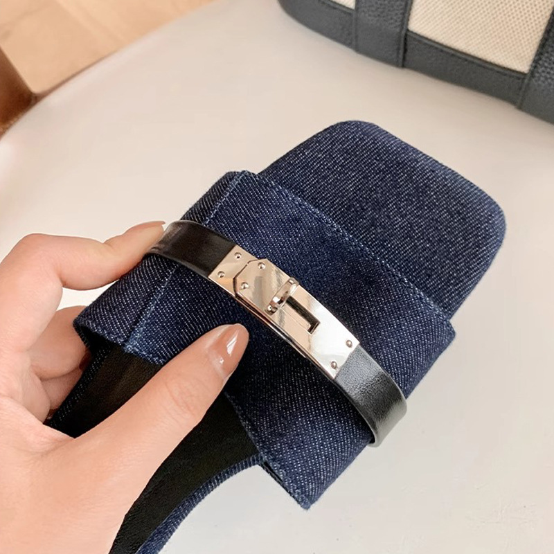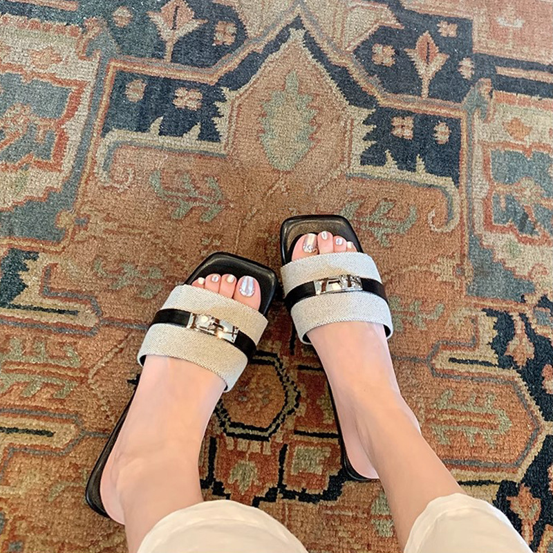 Las mismas zapatillas planas de Su Yinyin ~ Botón de bloqueo de cabeza cuadrada, pantuflas de playa de fondo plano, sandalias de mujer, uso externo